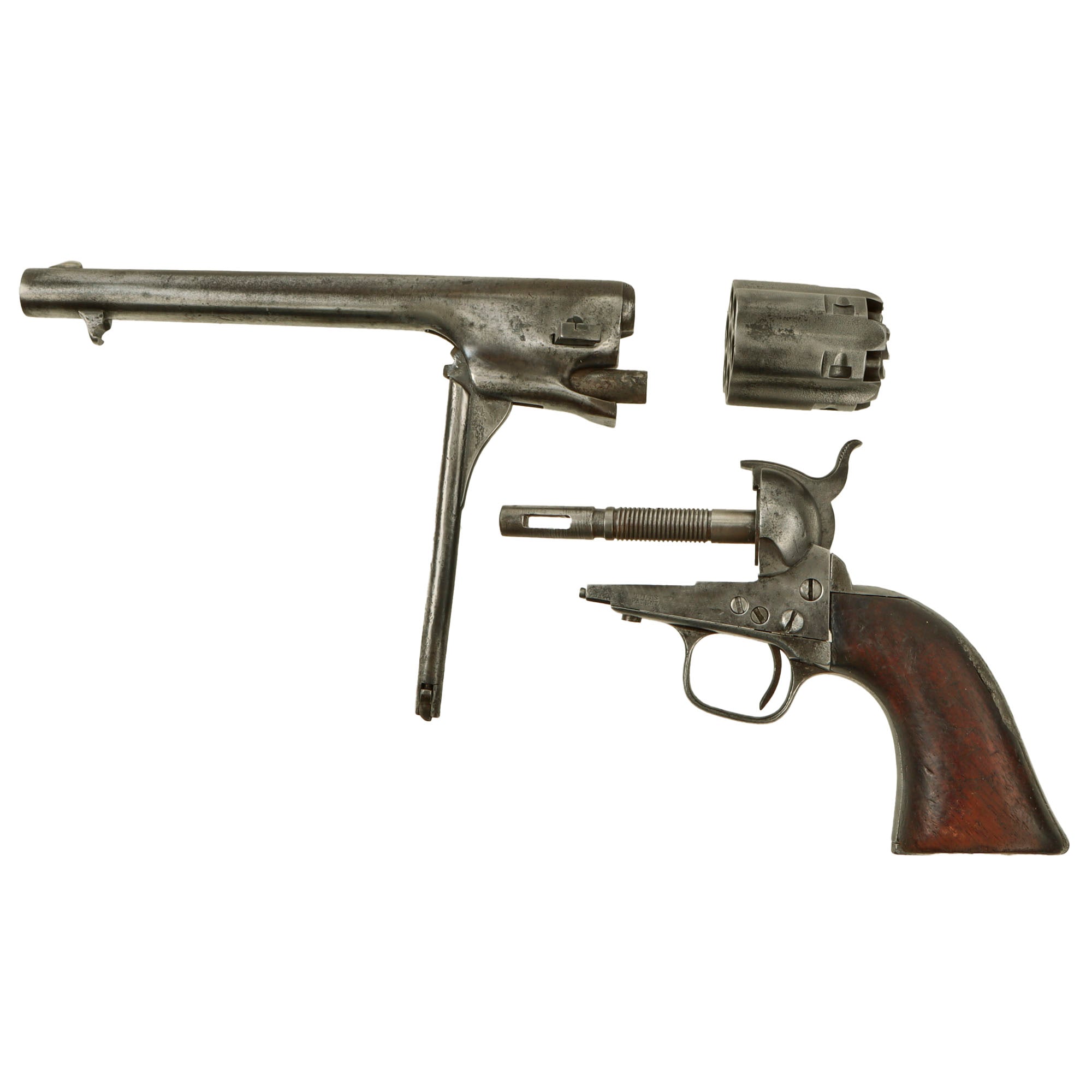 The unfluted cylinder was 'rebated,' meaning that the rear of the cylinder was turned to a smaller diameter than the front. The barrel was rounded and smoothed into the frame, as was the Navy Model. The frame, hammer, and rammer lever were case-hardened, the remainder blued; grips were of one-piece walnut; and the trigger guard and front grip strap were of brass while the backstrap was blued."