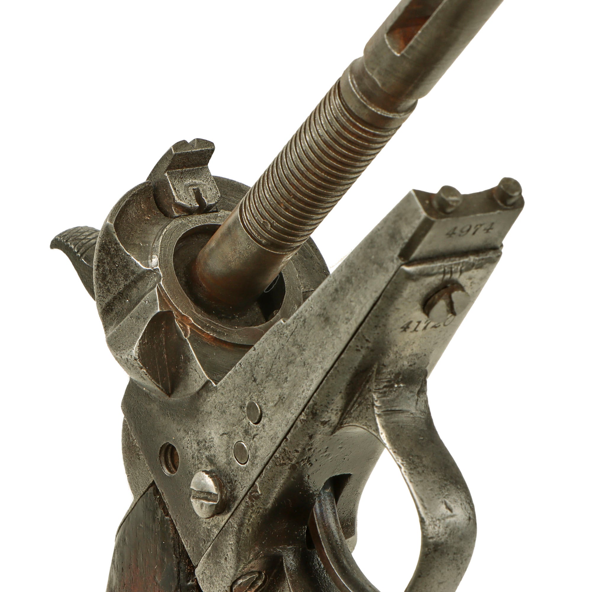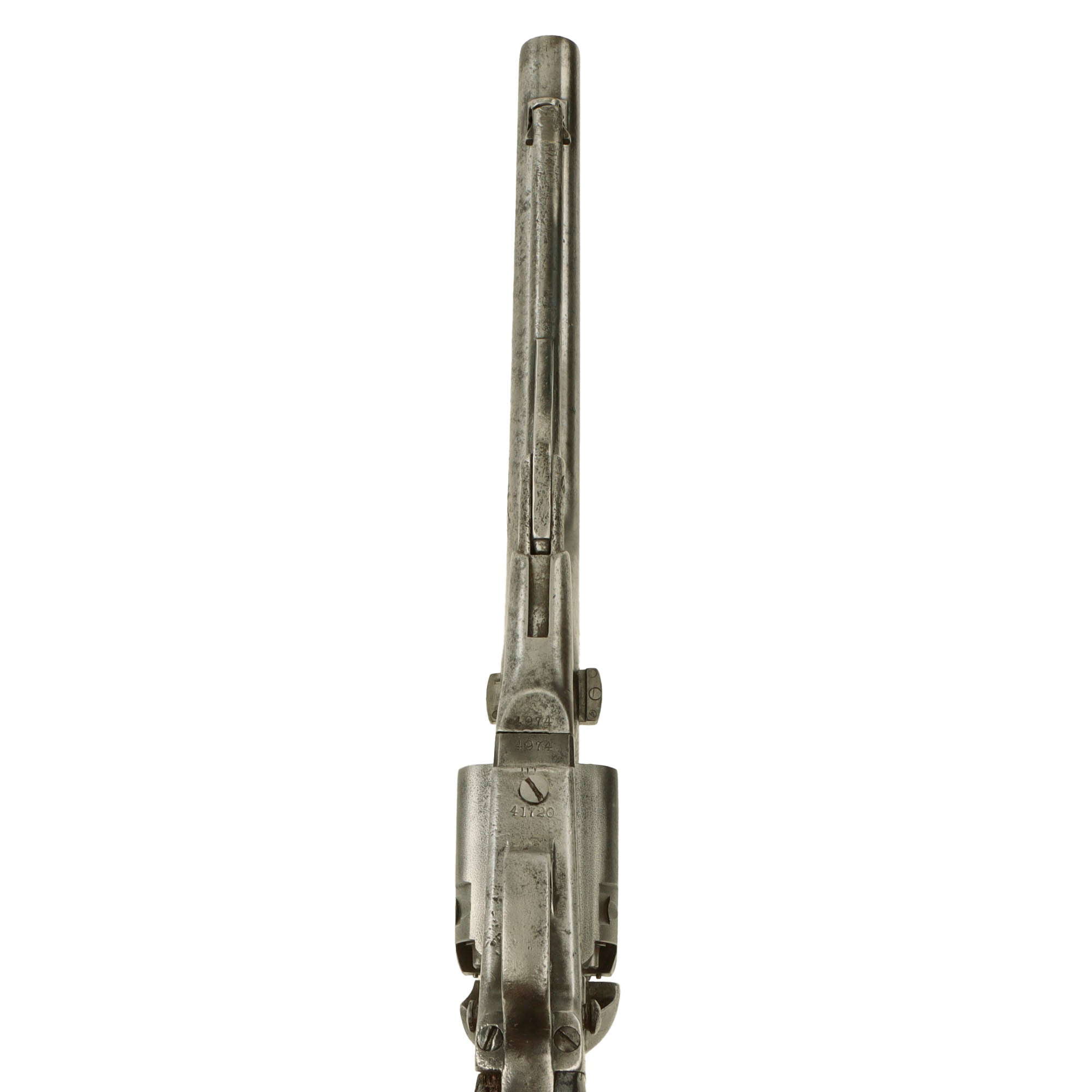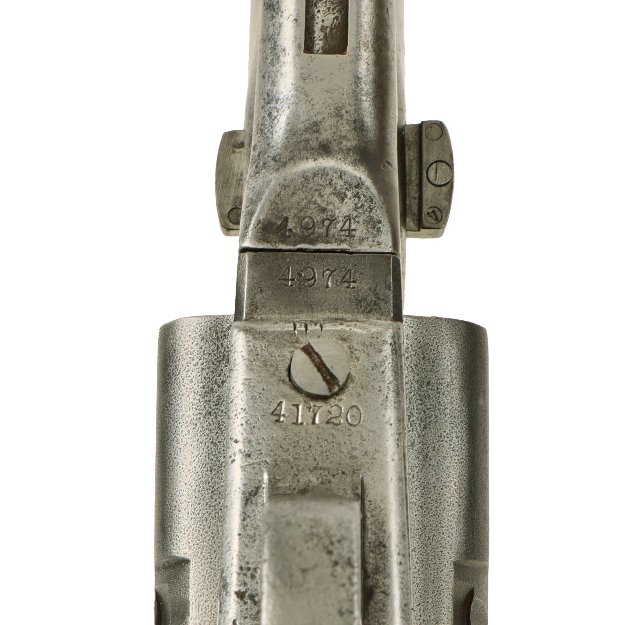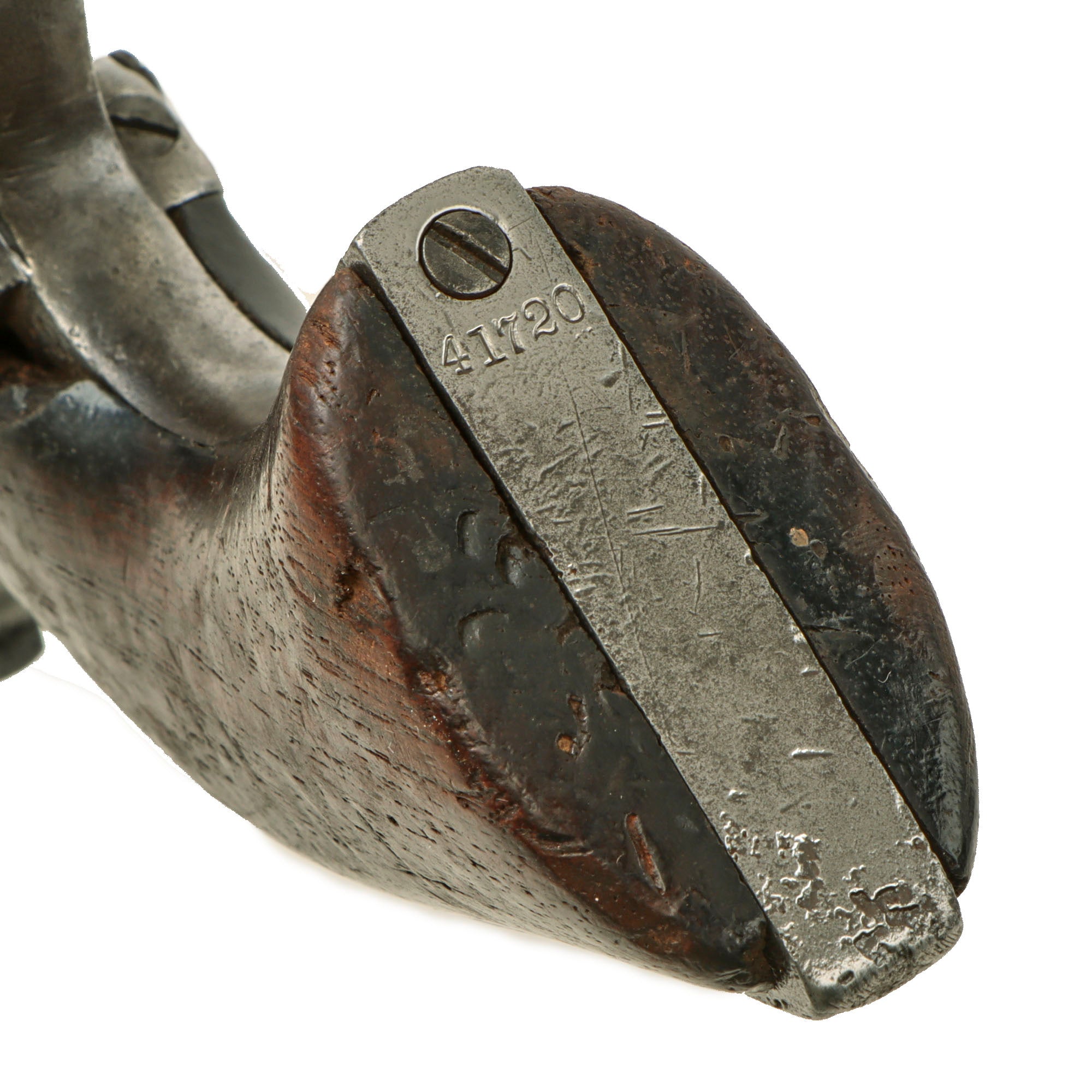 The barrel and frame both bear matching serial number 4974, which is in the correct font and placement on both, with no signs of remarking. This is the correct range for being made with a "fluted" cylinder and four screw frame, and indicates this revolver was produced by the Colt armory in 1861, one of the first 5,000 made. Total production for this year was approximately 23,000, with serials running from approximately #2,000 to #25,000. The iron trigger guard and grip frame are marked with serial 41720, for manufacture in 1862. The cylinder is an unmarked replacement, which definitely looks to be original, probably an armory spare. The arbor pin marking is not present, possibly worn away, and the barrel wedge is also unmarked.