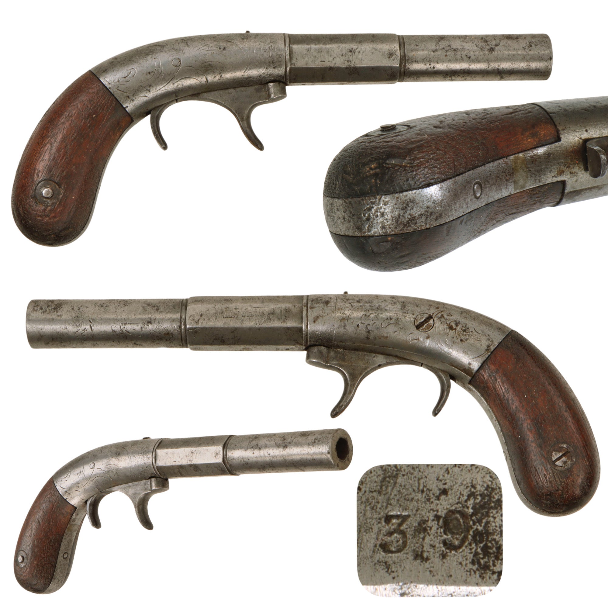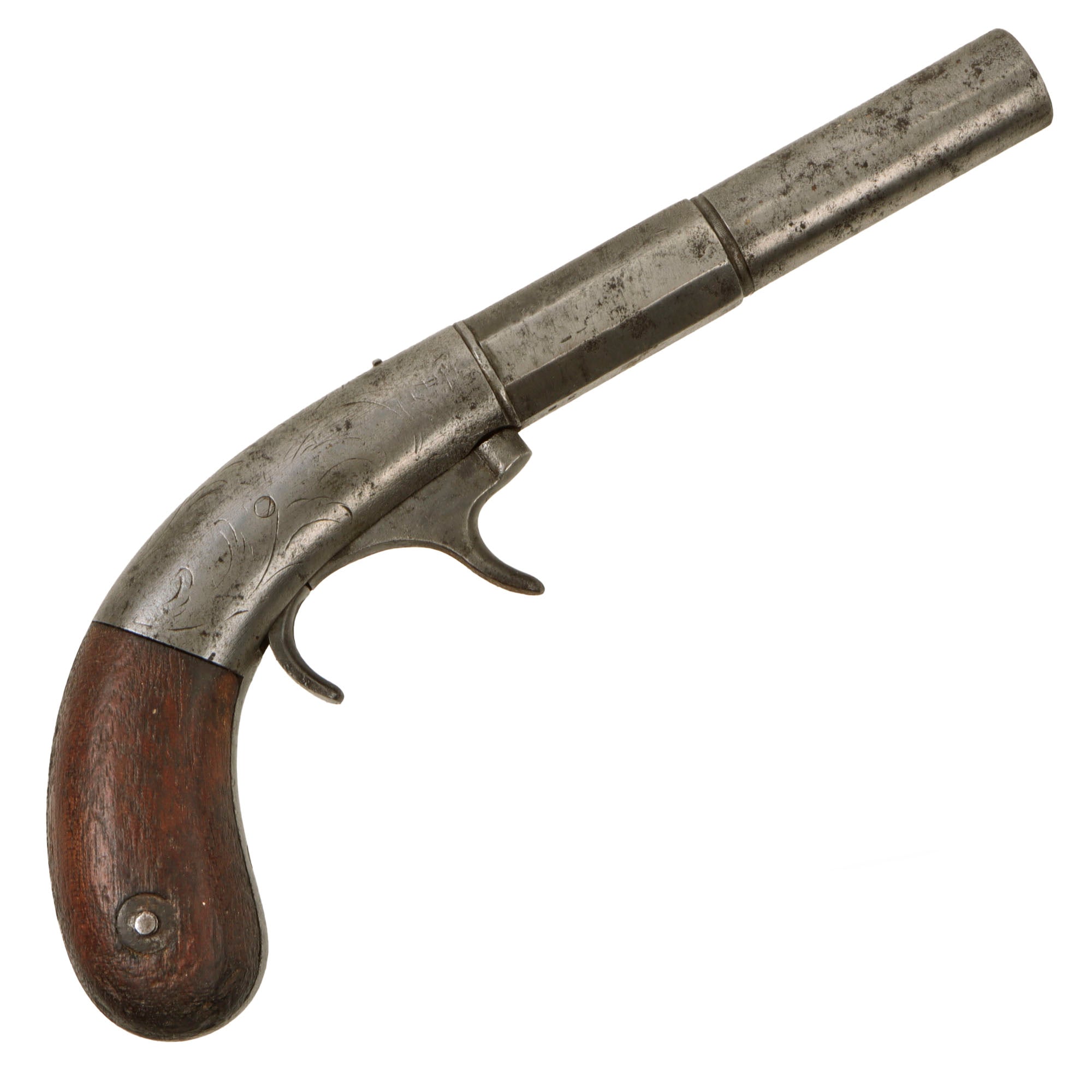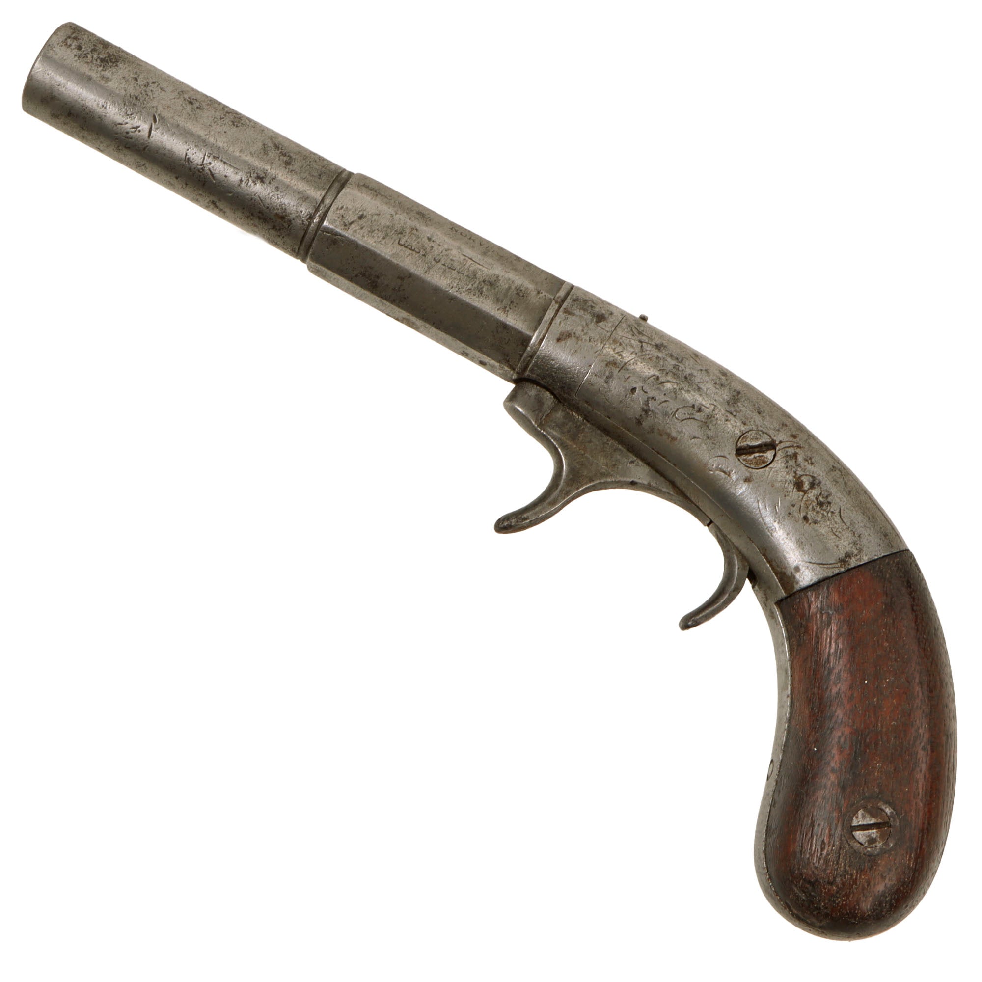 Original Item: Only One Available. Here is a very cute .34 caliber percussion "Boot Pistol", made by the Bacon Manufacturing Company. Thomas K. Bacon had been a gunsmith working with the Manhattan Firearms Manufacturing, and then left to found his own company Company and established the Bacon Manufacturing Company in Norwich, Connecticut. They quickly began manufacturing percussion revolvers, as well as some small single shot pistols, including "boot pistols". These seem to have been available in both standard and underhammer designs, and this is a very nice example of the latter.