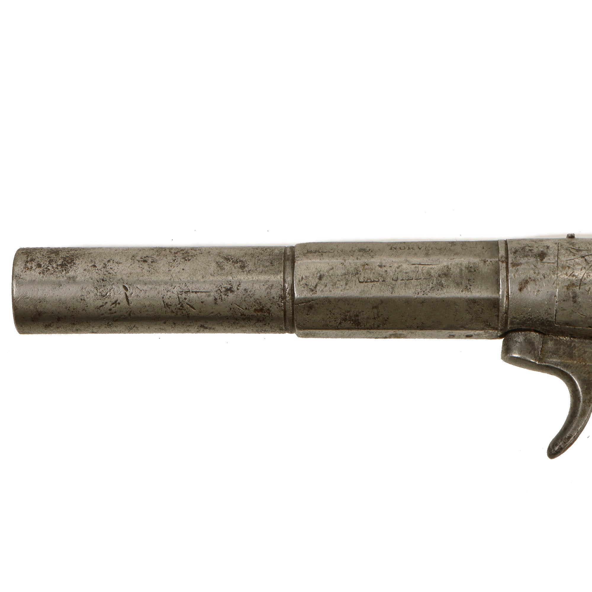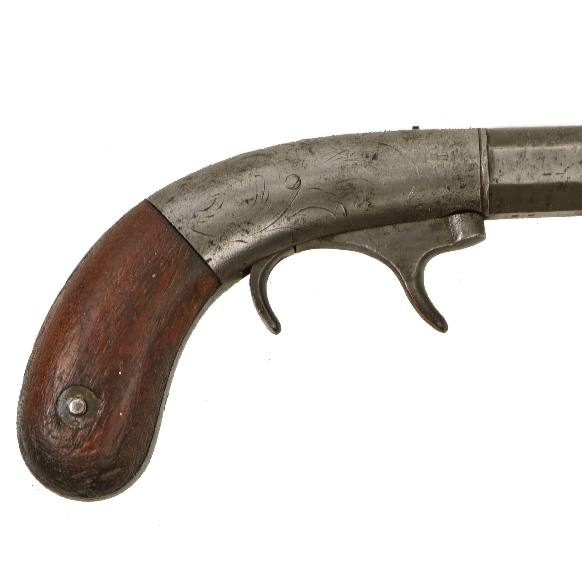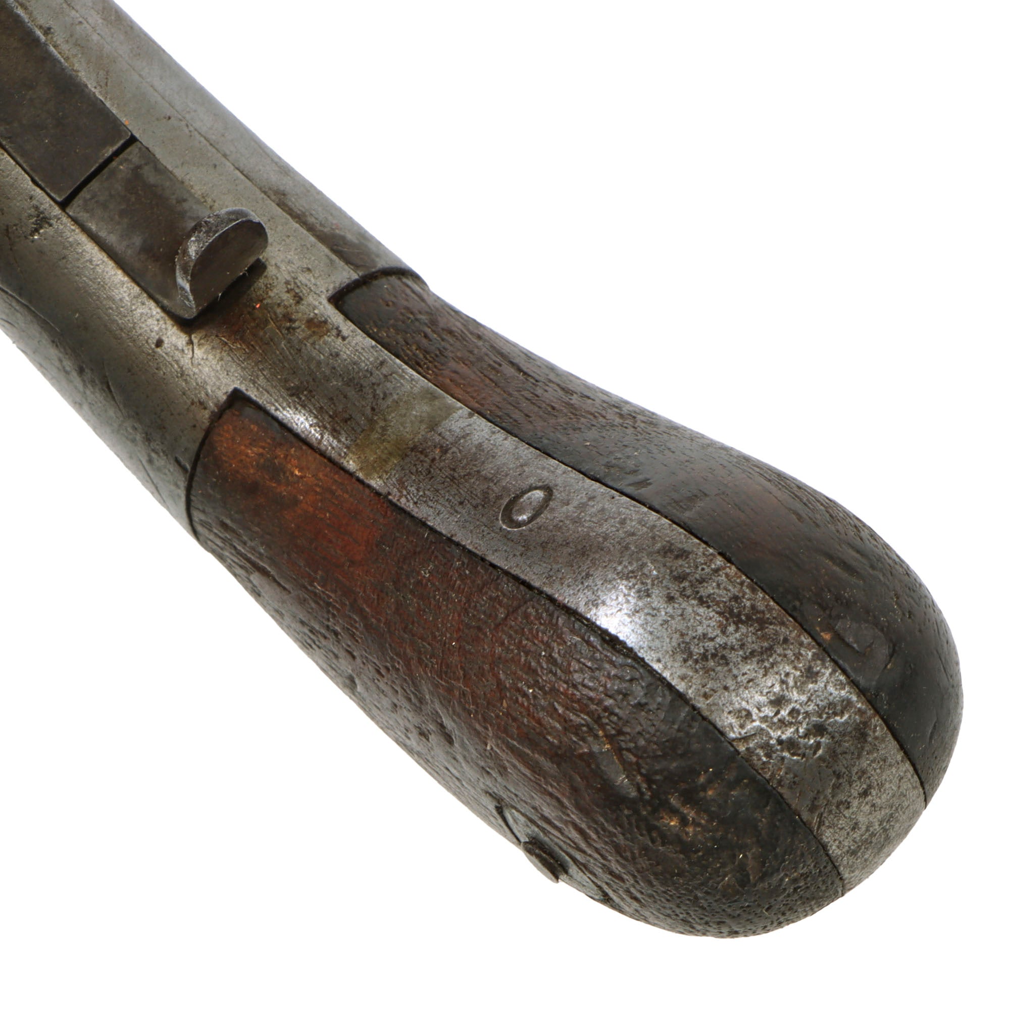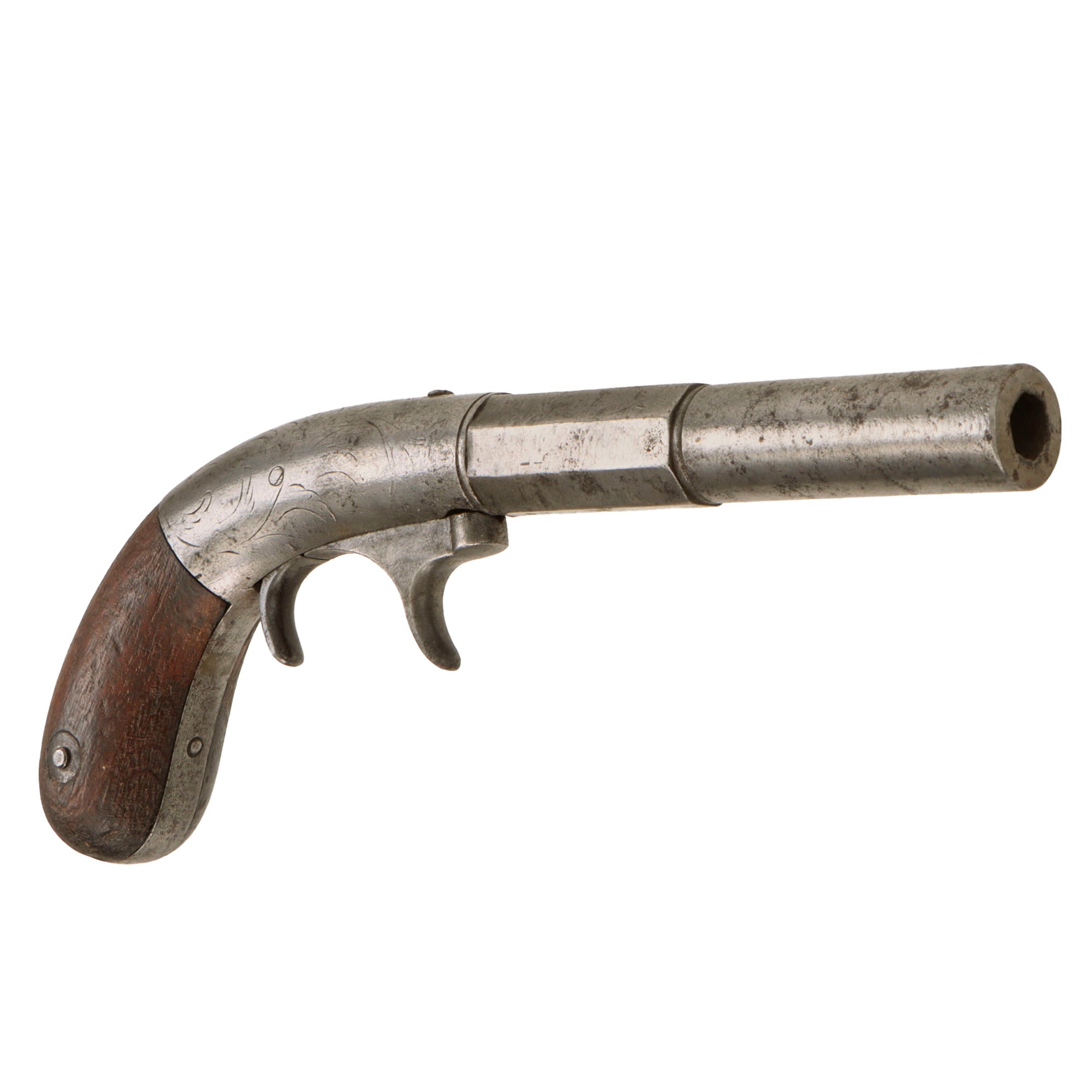 Original Item: Only One Available. Here is a very cute .34 caliber percussion "Boot Pistol", made by the Bacon Manufacturing Company. Thomas K. Bacon had been a gunsmith working with the Manhattan Firearms Manufacturing, and then left to found his own company Company and established the Bacon Manufacturing Company in Norwich, Connecticut. They quickly began manufacturing percussion revolvers, as well as some small single shot pistols, including "boot pistols". These seem to have been available in both standard and underhammer designs, and this is a very nice example of the latter.