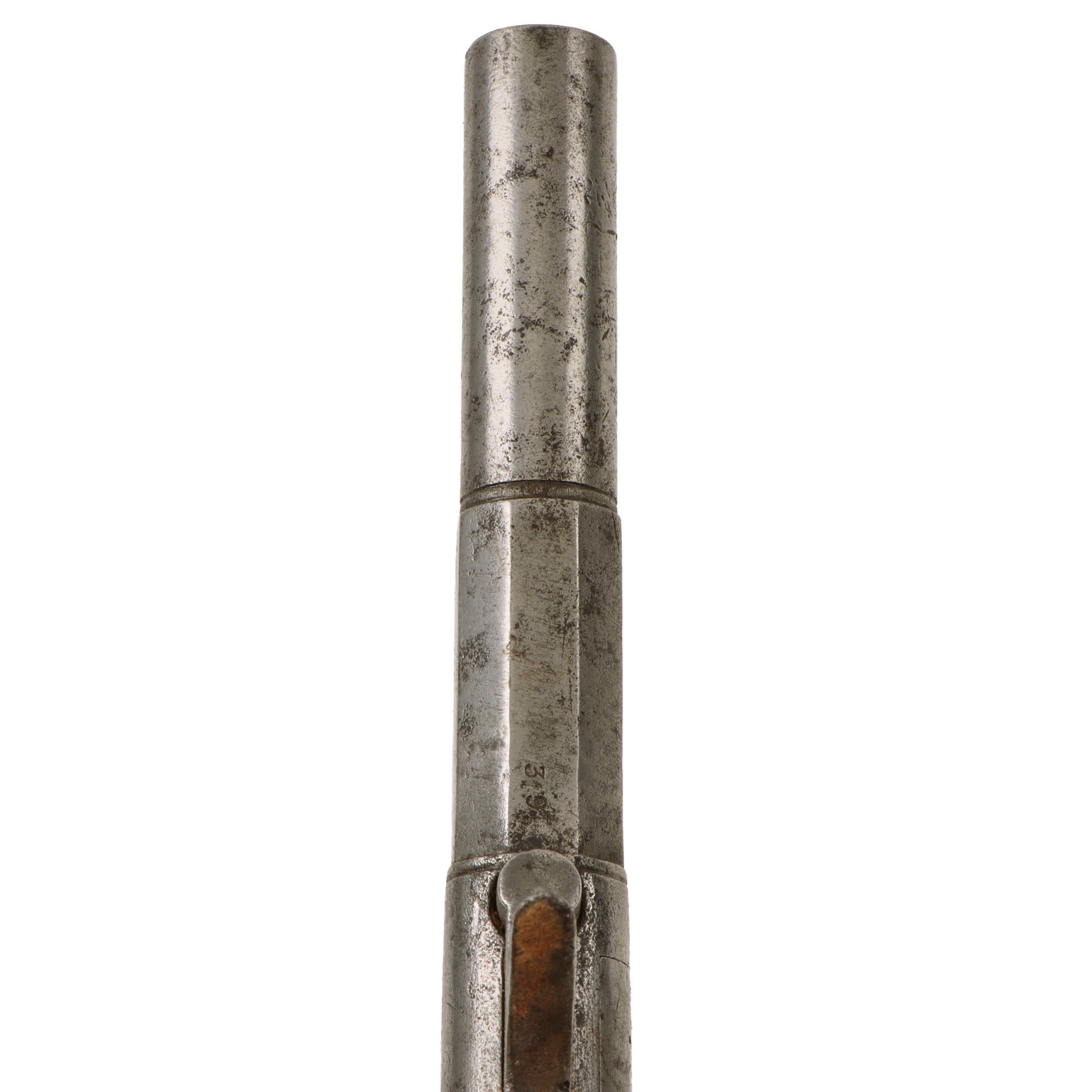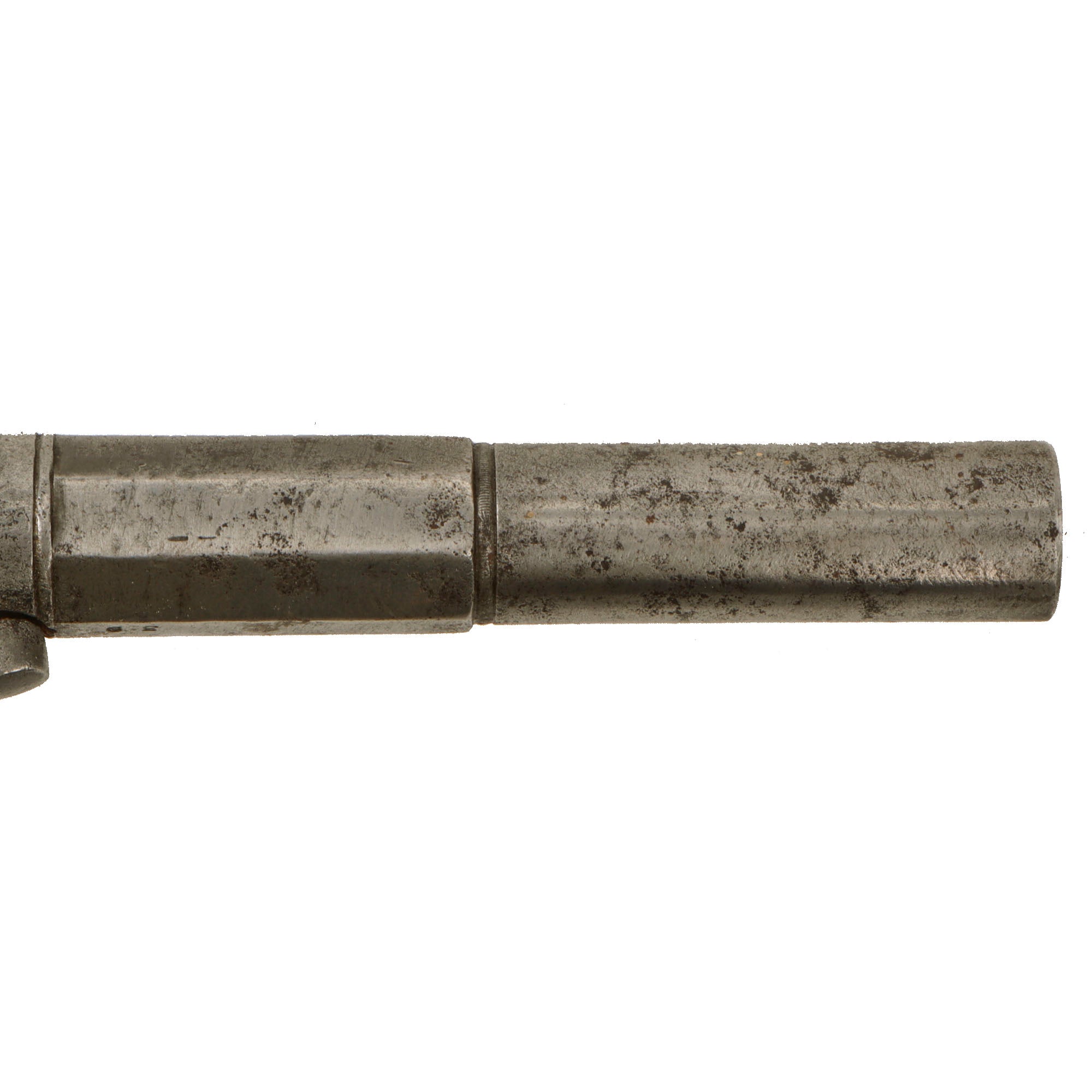 This patinated boot pistol features a 4 inch half round / half octagonal barrel, and is 8 inches in overall length, perfect for a boot or pocket. It is in .34 caliber, and the barrel has 6 groove rifling with a very slow rate of twist, looking almost straight, though the bore is definitely quite corroded. It is faintly marked on two of the barrel facets with the maker information: