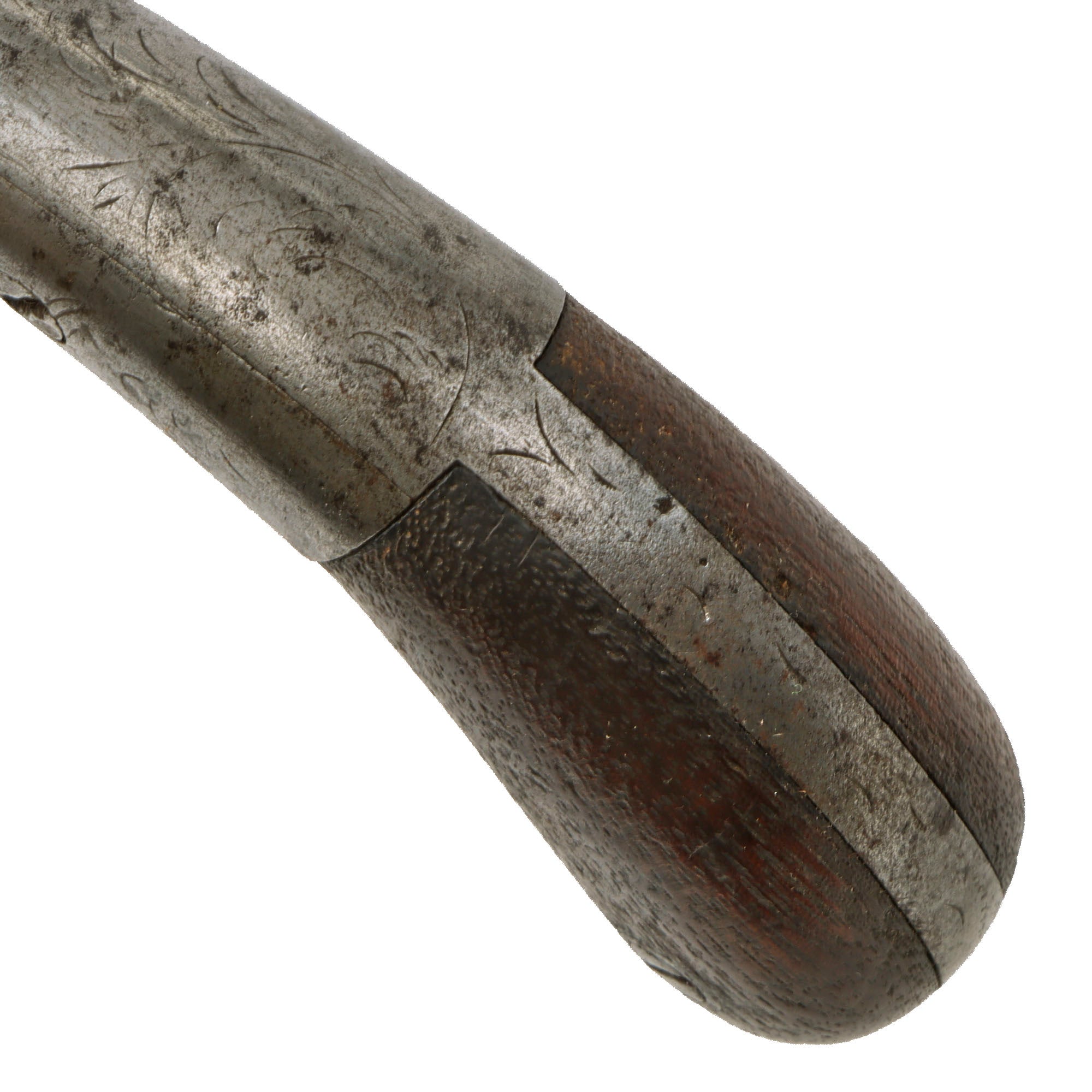 The pistol is an "underhammer" design with two "triggers": the forward to cock the hammer, and the rear to fire the pistol. With no hammer on the top of the action there was much less to catch on the inside of a boot or pocket. The tumbler does not have any provision for the half cock position, and the lock functions well. We checked the bore, and it is in fair condition, still showing rifling but also overall fouling and oxidation. It does not look to have been cleaned properly after use, allowing oxidation to set in.