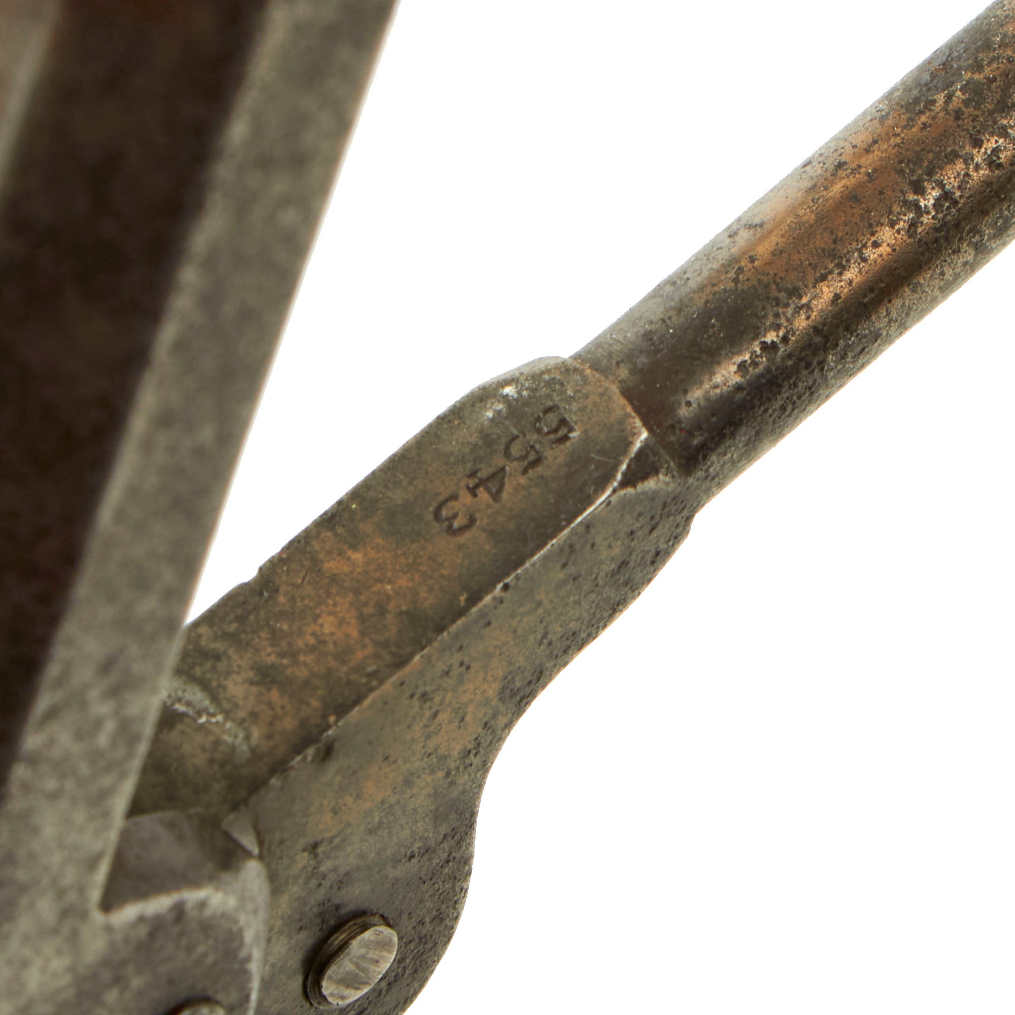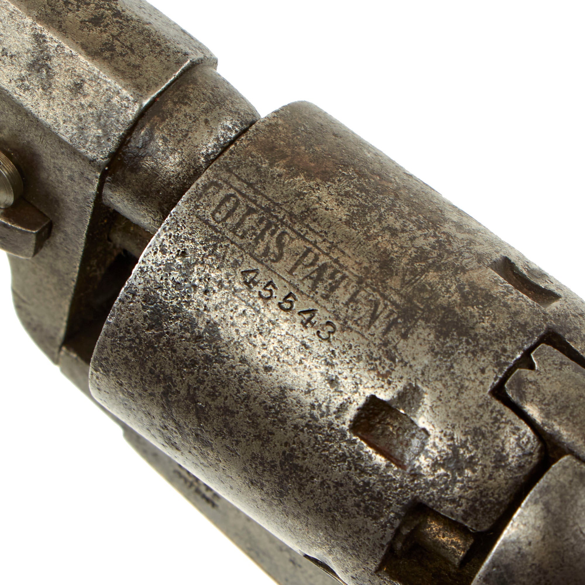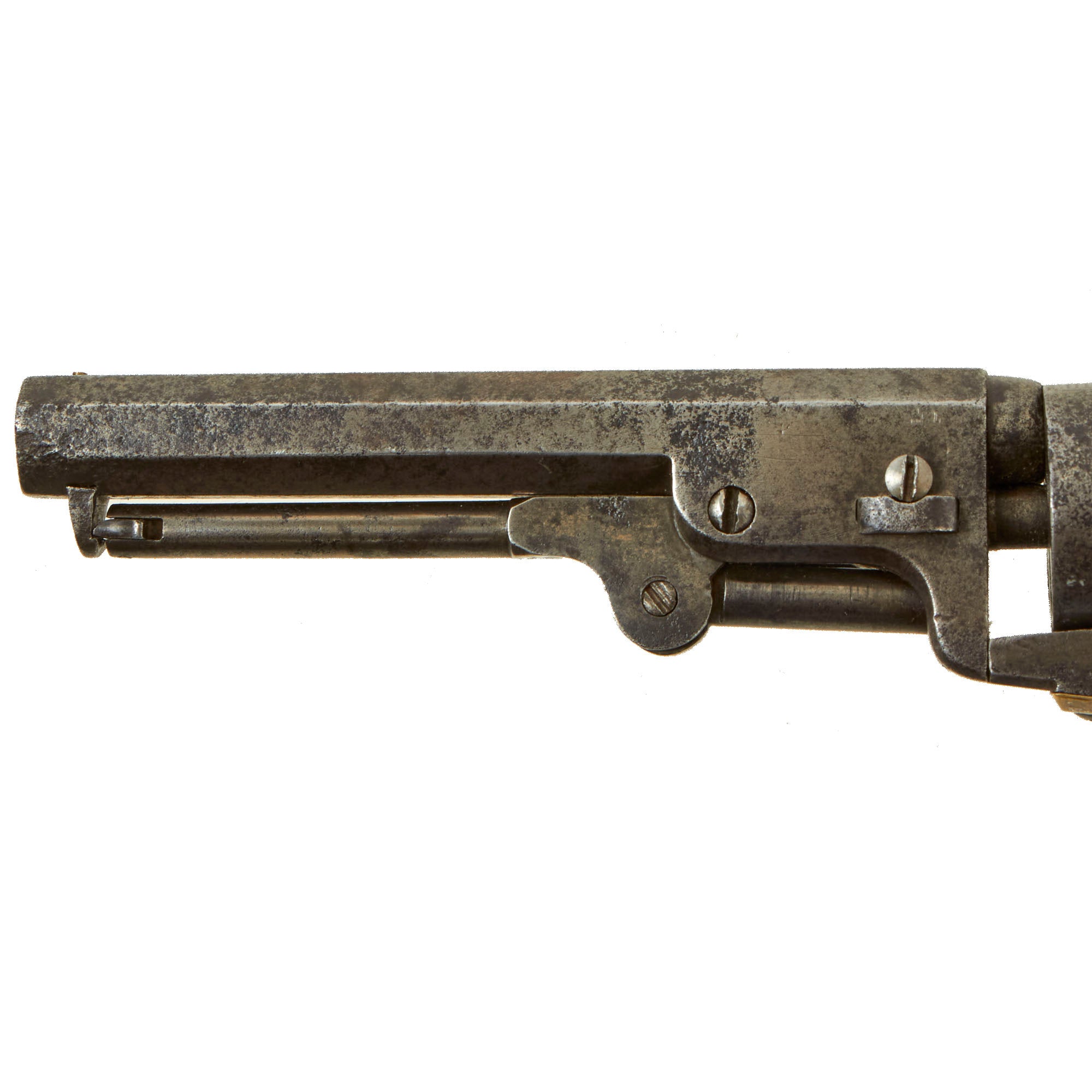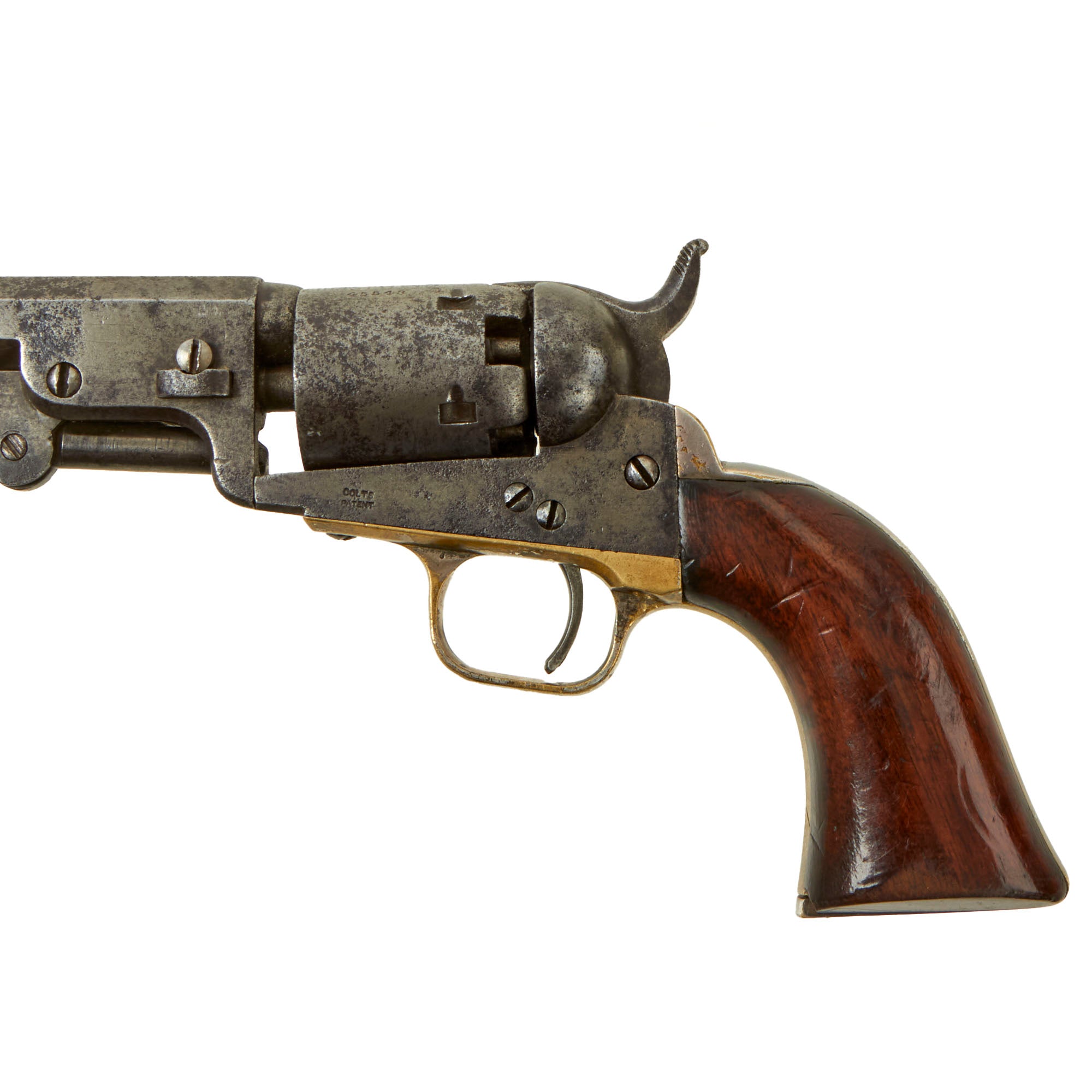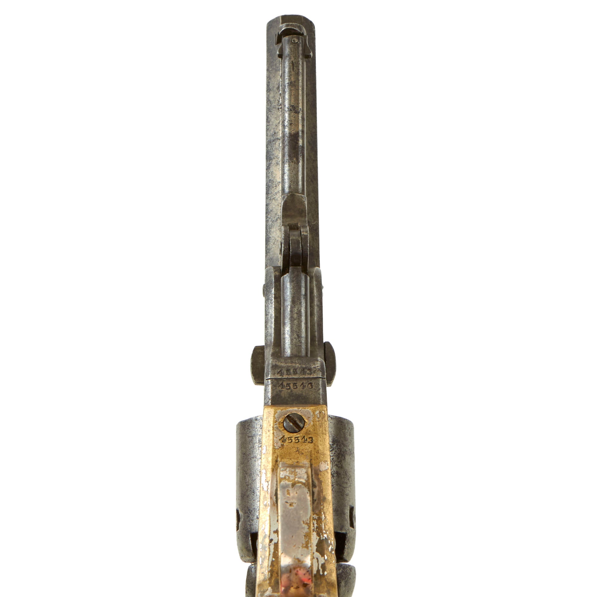 • Original Item: Only One Available. The Colt "Pocket Percussion" Model 1849 revolvers in .31cal are essentially scaled down versions of the larger Navy Model 1851 in .36cal, and were developed concurrently. This is a lovely service used example, showing the original geometry well, with the original finish now faded to a lovely gray mottled patina, with the markings relatively well preserved. This patinated example features Serial Number 45543 on the barrel, frame, cylinder, trigger guard, and grip frame, with shortened number 5543 on the loading rammer, while the barrel wedge and cylinder arbor pin are marked 543. This makes this a very desirable "ALL MATCHING" example of the M1849 Pocket revolver, without any parts swapped out over the years, and it's definitely a lovely example!