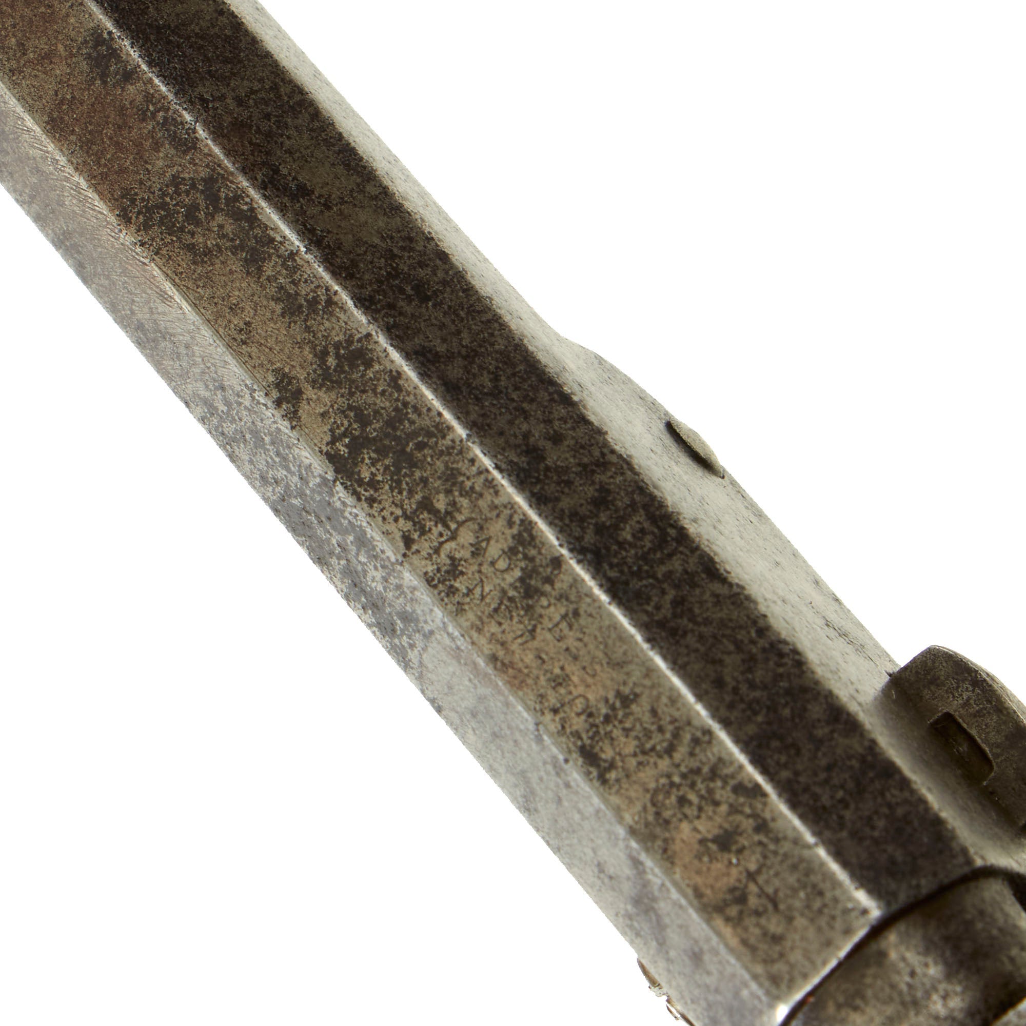The serial number indicates indicates the year of manufacture for most components as 1852, only a few short years before the start of the U.S. Civil War, so it almost certainly saw service during the conflict. Five shot percussion, .31 caliber with a 5" barrel, the revolver is in nice tight condition with a very nice aged patina on the steel portions, with some signs of past peppering, now removed. The grip frame and trigger guard actually still show a good amount of the original plating, which looks to be silver, or silver over a nickel flash coat. As with many we see, the "Stagecoach Robbery" cylinder scene is completely worn away, however there is still most of the COLT'S PATENT / № marking next to the serial number.