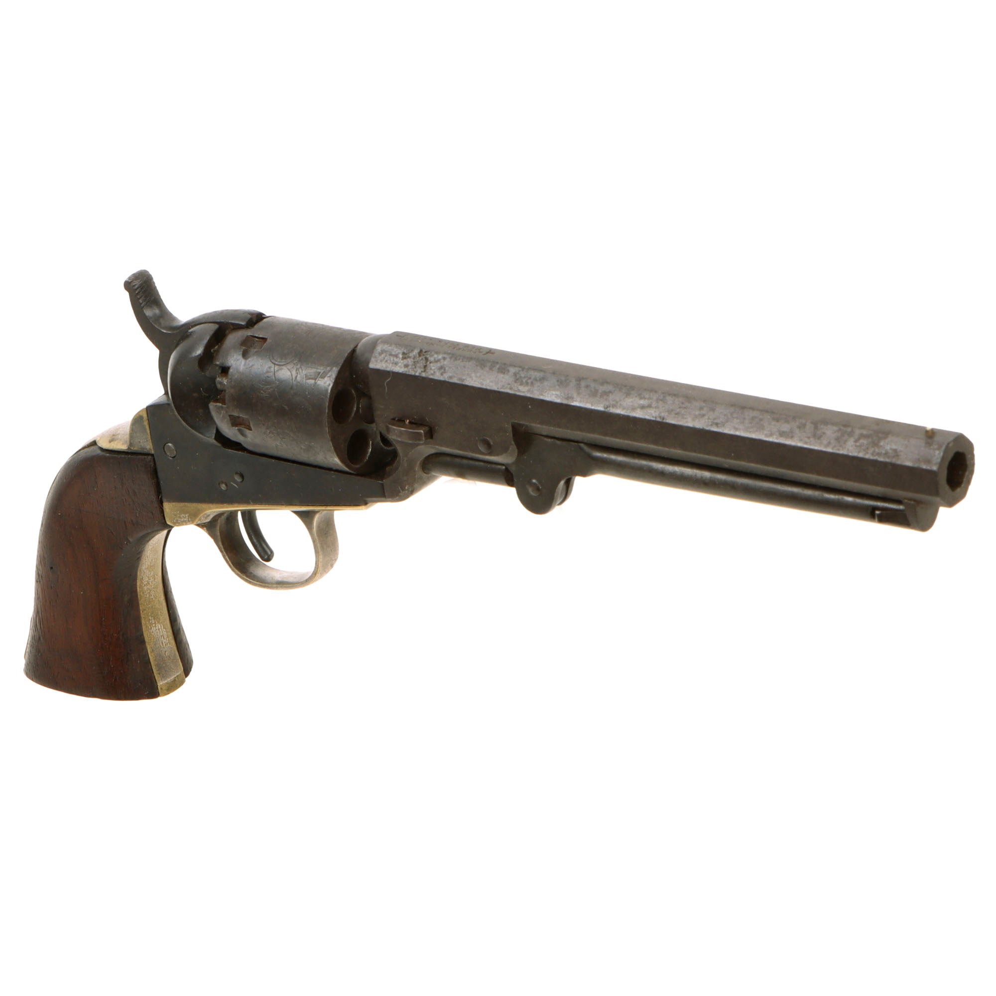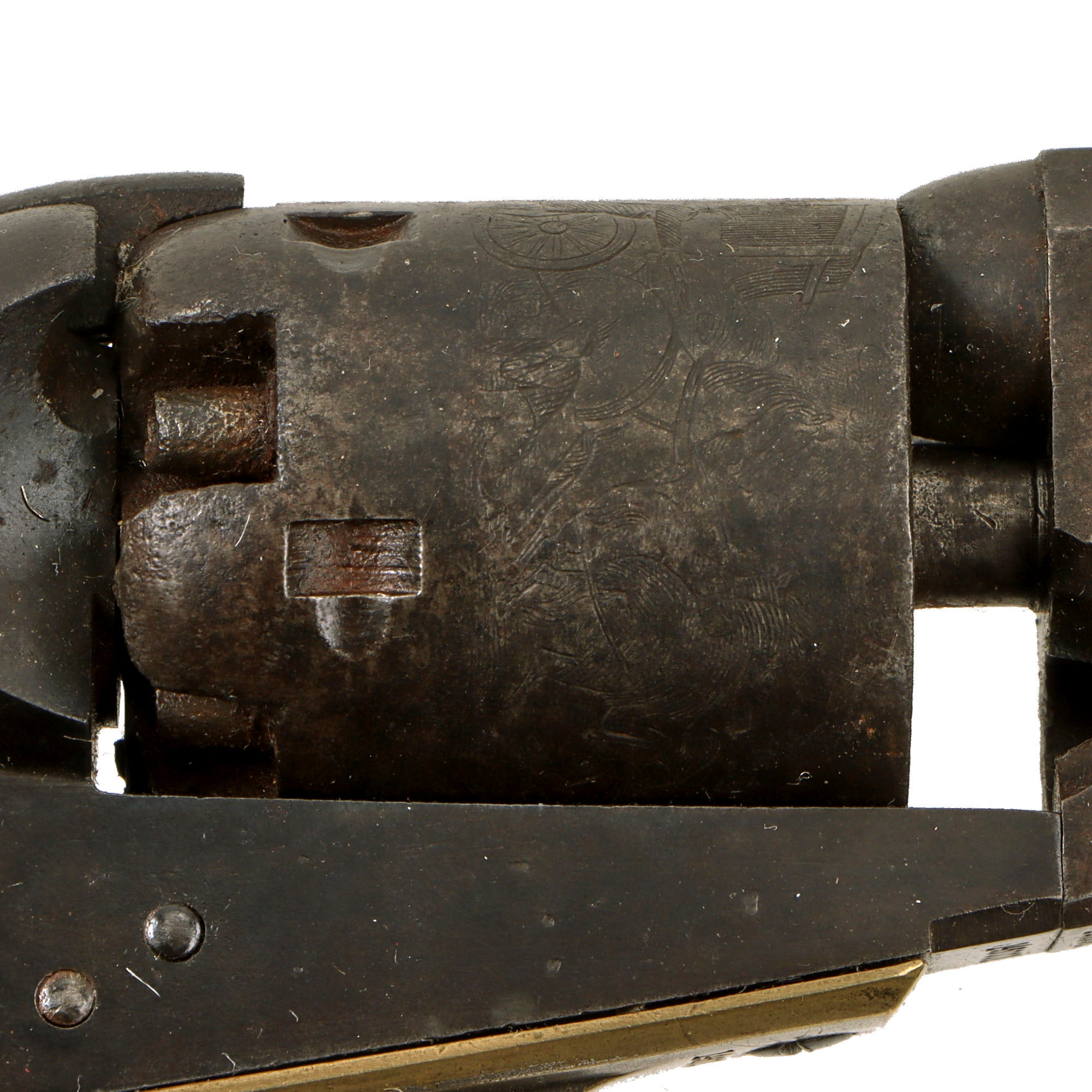 The serial number indicates indicates the year of manufacture for most components as 1858, only a few short years before the start of the U.S. Civil War, so it almost certainly saw service during the conflict. Five shot percussion, .31 caliber with a 6" barrel, the revolver is in nice tight condition with a very nice aged patina on the steel portions, with some signs of past peppering, now removed. The grip frame and trigger guard actually still have some of the original plating present, while the rest displays an aged "mustard" patina. Unlike most we see, the "Stagecoach Robbery" cylinder scene is still well retained at over 70%, and there is a clear COLT'S PATENT / № marking next to the serial number.