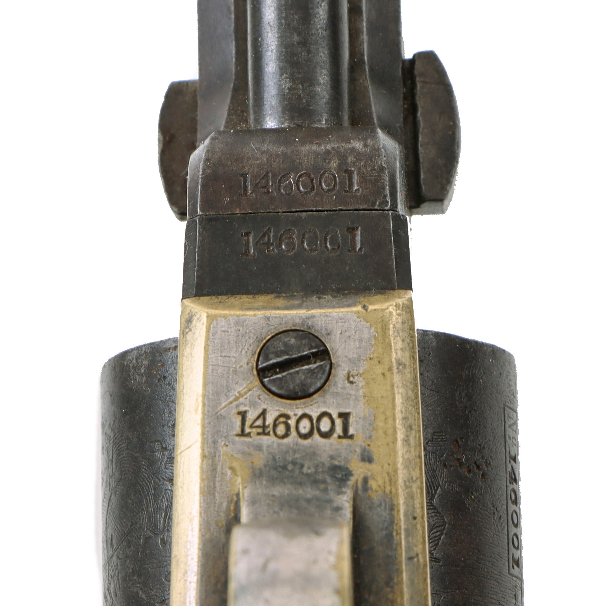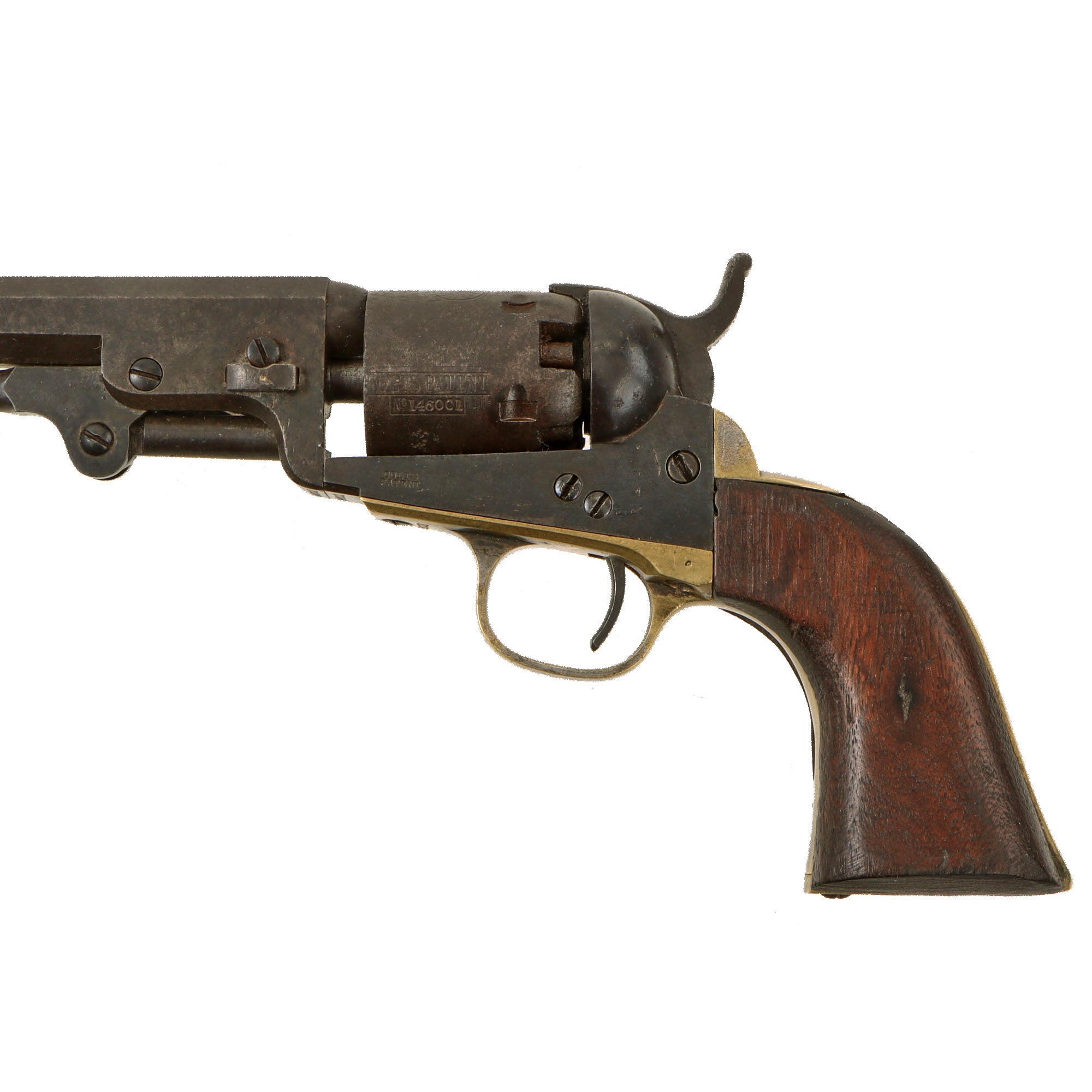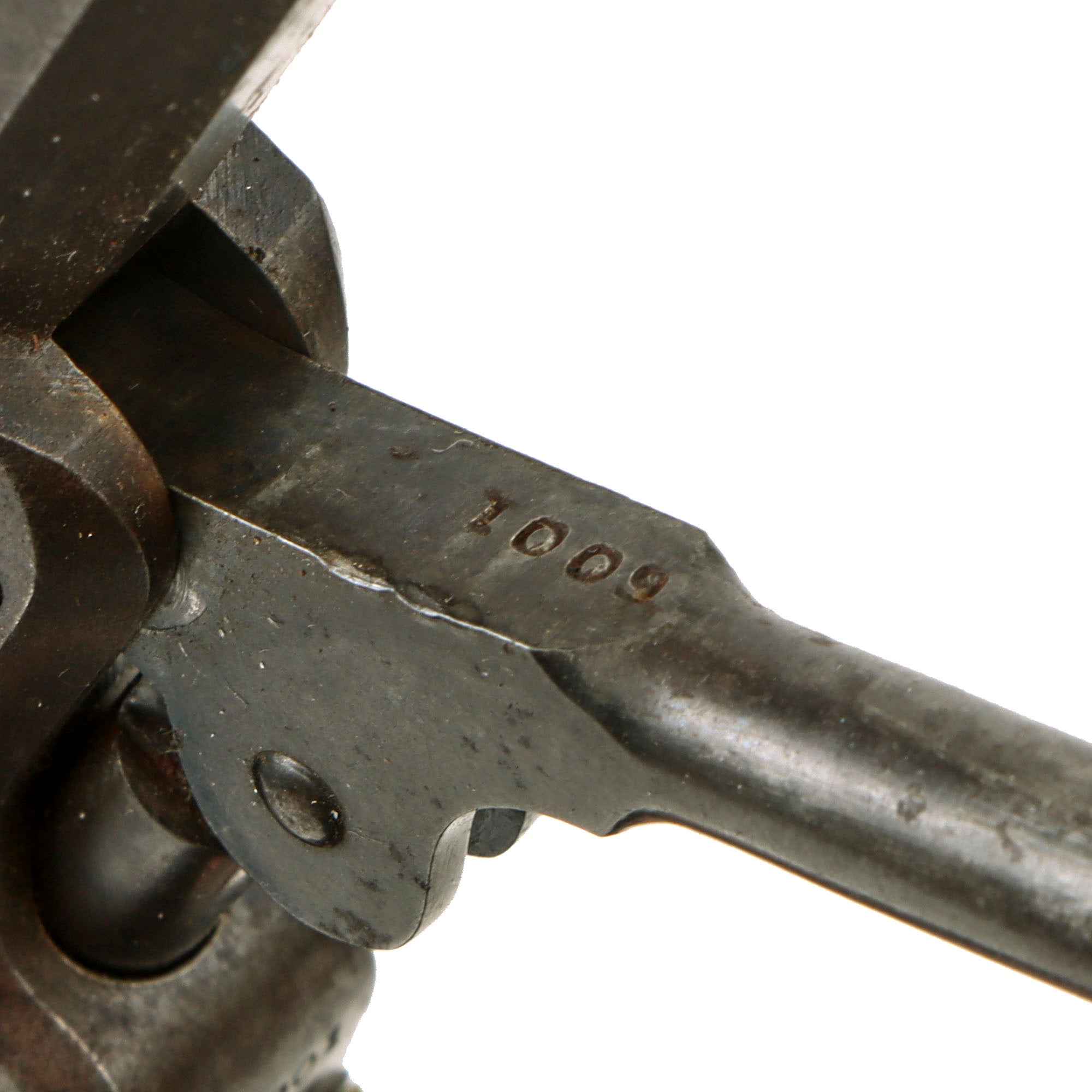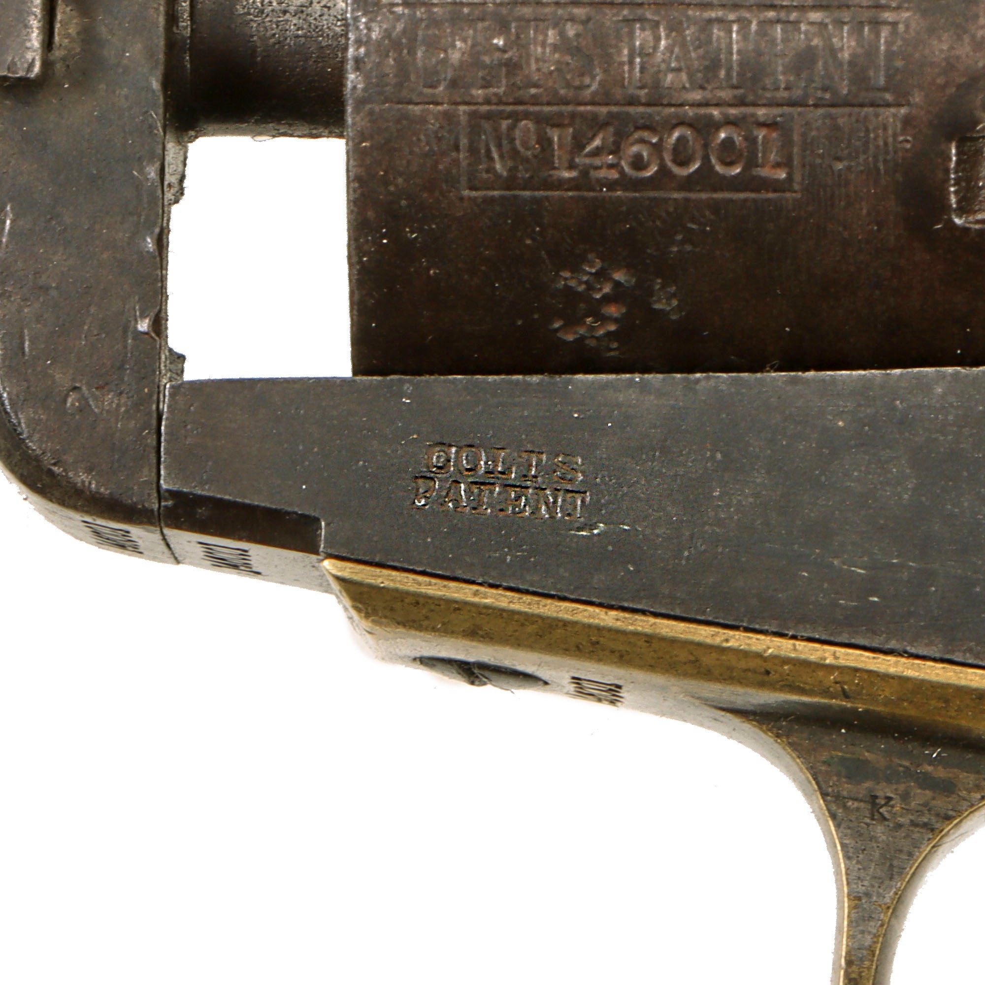 • Original Item: Only One Available. The Colt "Pocket Percussion" Model 1849 revolvers in .31cal are essentially scaled down versions of the larger Navy Model 1851 in .36cal, and were developed concurrently. This is a lovely example, showing the original geometry well, with the original finish now faded to a lovely dark gray patina, and the markings very well preserved. This impressive example features Serial Number 146001 on the barrel, frame, cylinder, trigger guard, and grip frame, with shortened number 6001 on the loading rammer and cylinder arbor pin, while the barrel wedge is marked 46001. This makes this a very desirable "ALL MATCHING" example of the M1849 Pocket revolver, without any parts swapped out over the years, and it's definitely a lovely example!