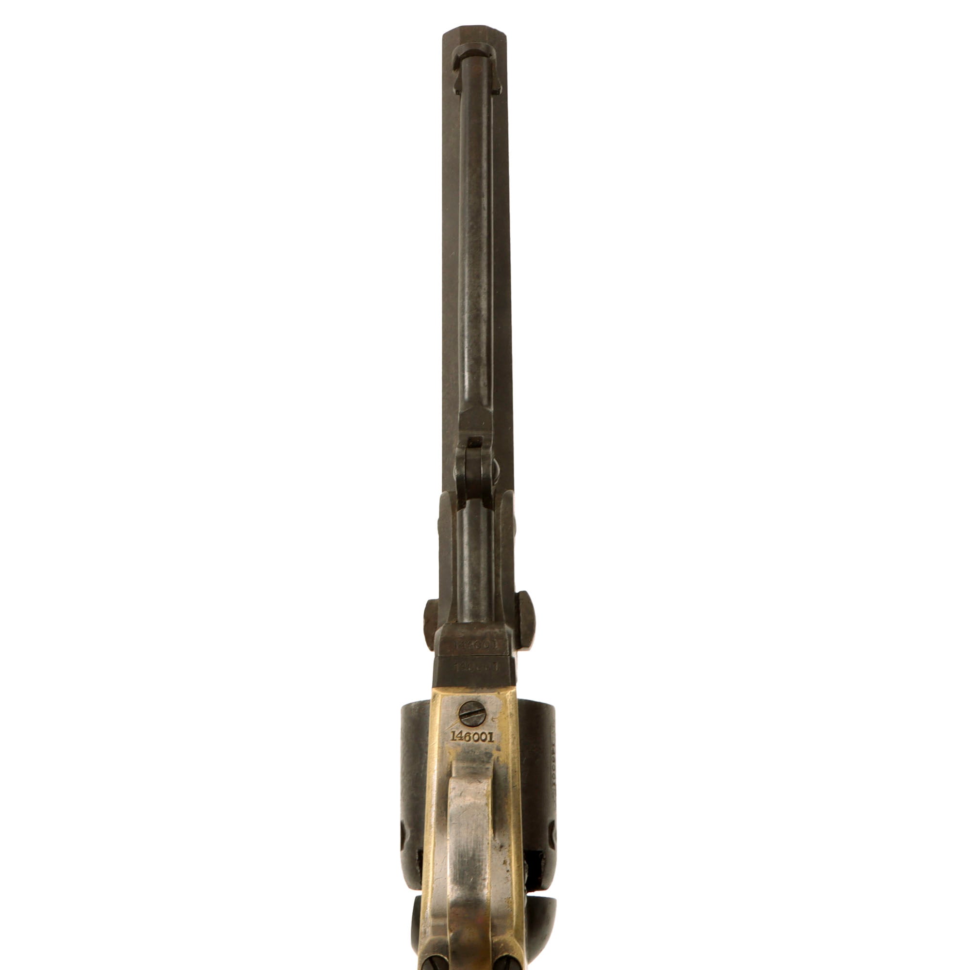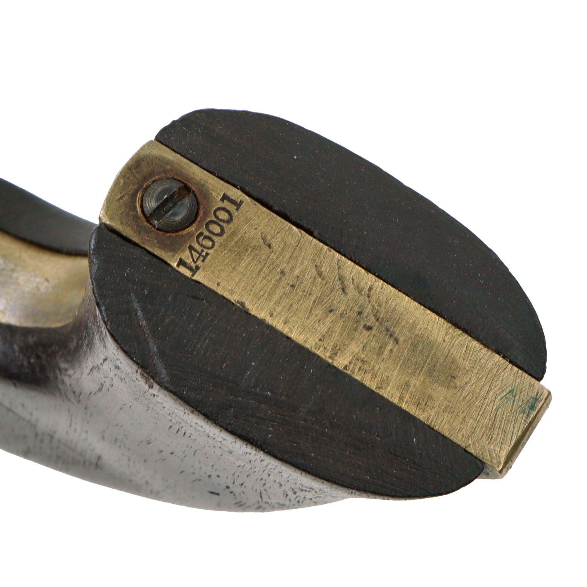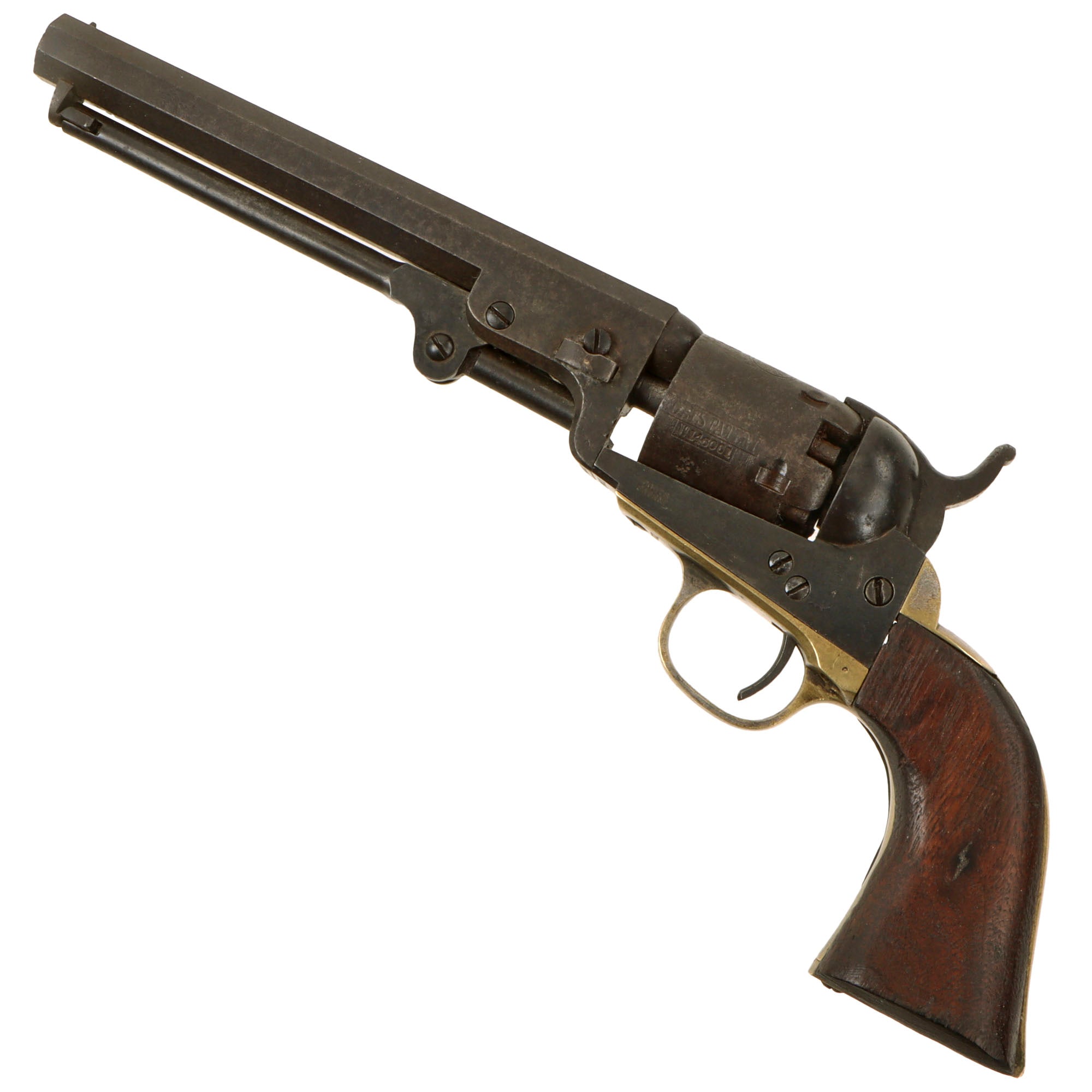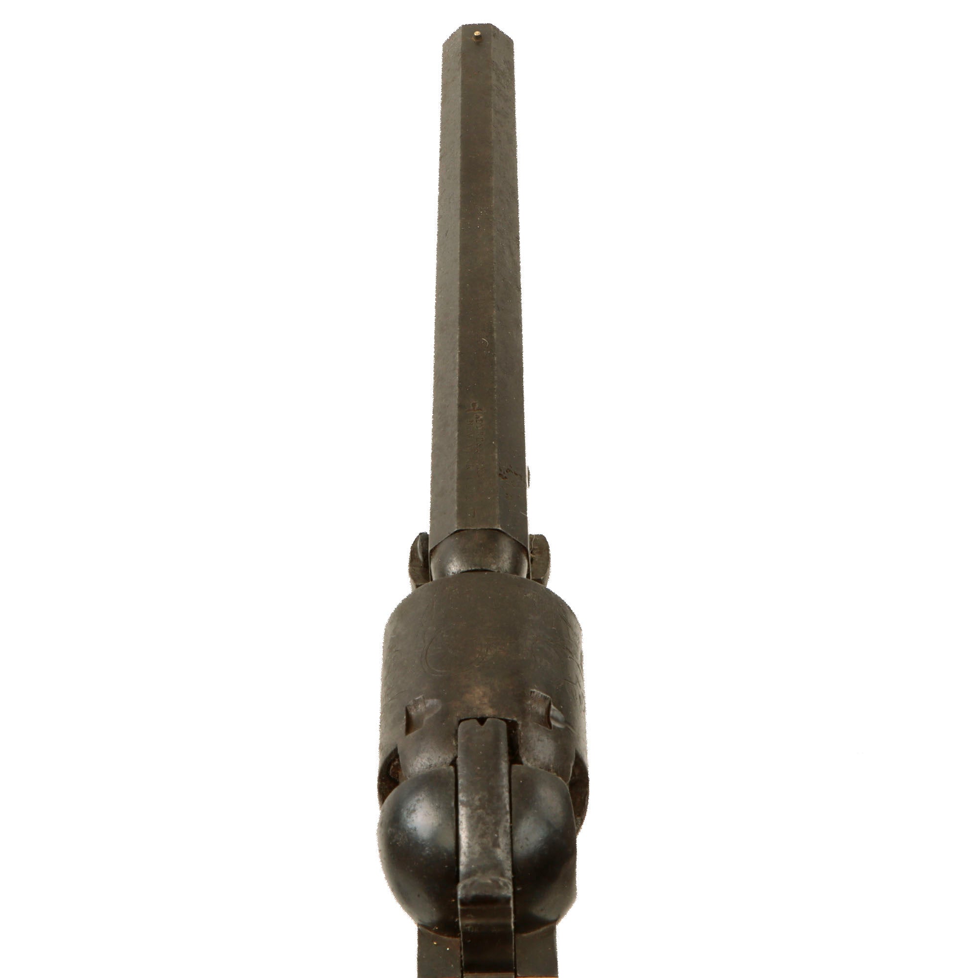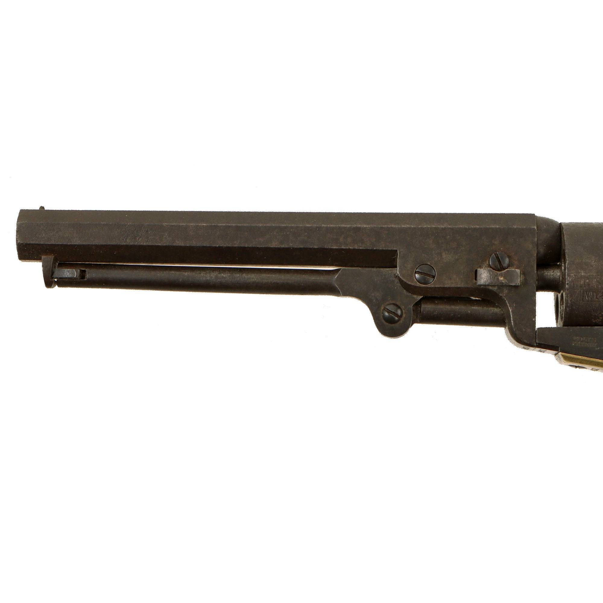 • Original Item: Only One Available. The Colt "Pocket Percussion" Model 1849 revolvers in .31cal are essentially scaled down versions of the larger Navy Model 1851 in .36cal, and were developed concurrently. This is a lovely example, showing the original geometry well, with the original finish now faded to a lovely dark gray patina, and the markings very well preserved. This impressive example features Serial Number 146001 on the barrel, frame, cylinder, trigger guard, and grip frame, with shortened number 6001 on the loading rammer and cylinder arbor pin, while the barrel wedge is marked 46001. This makes this a very desirable "ALL MATCHING" example of the M1849 Pocket revolver, without any parts swapped out over the years, and it's definitely a lovely example!