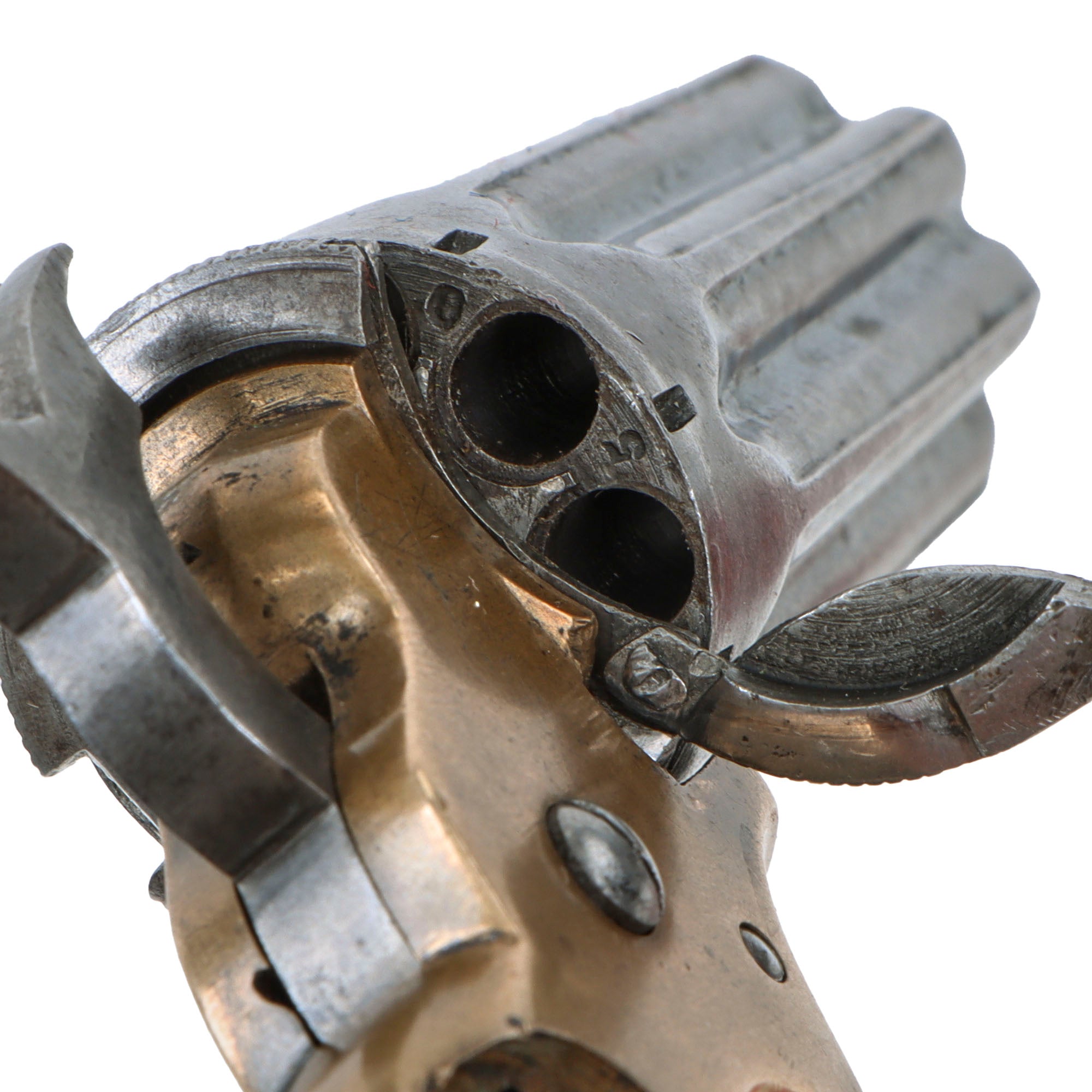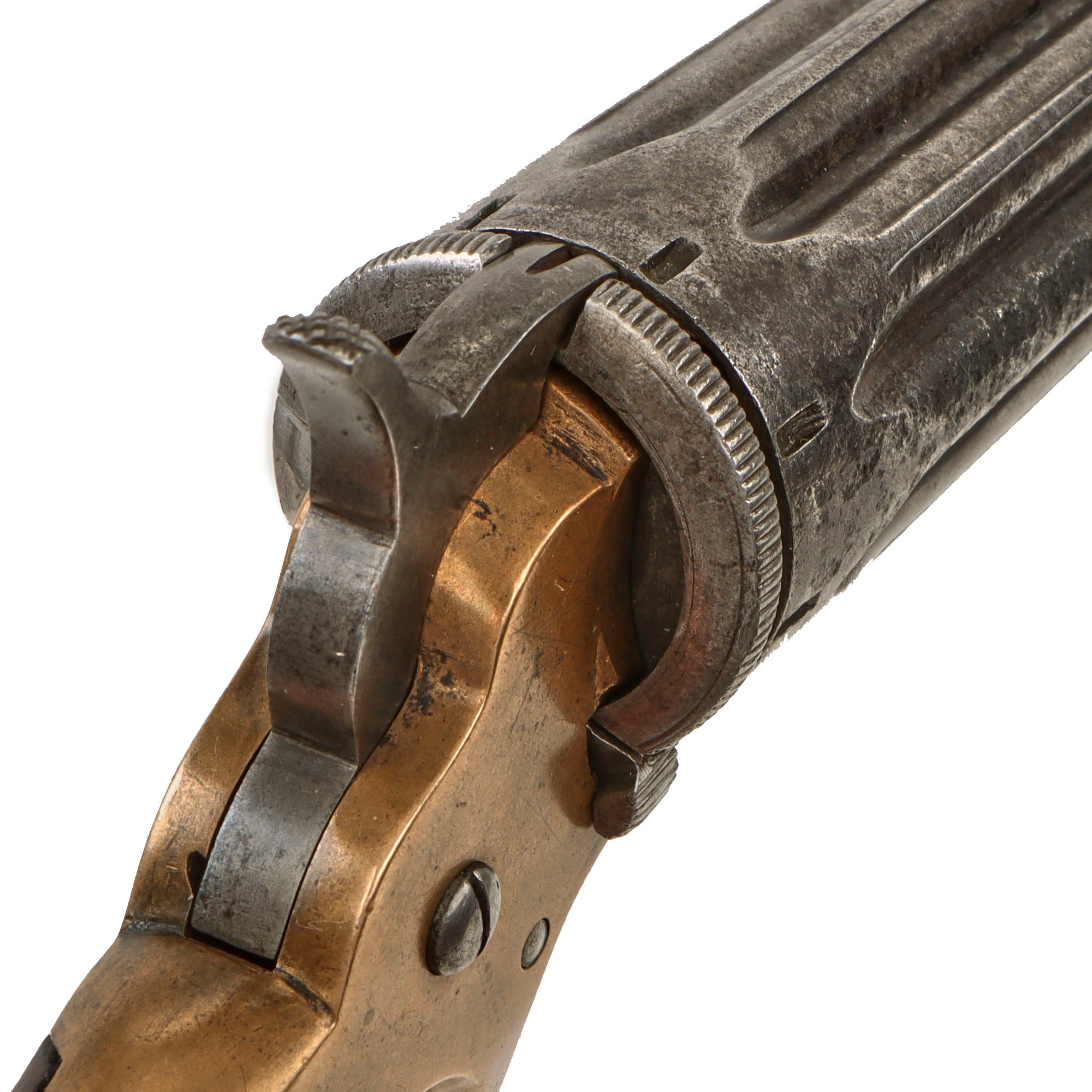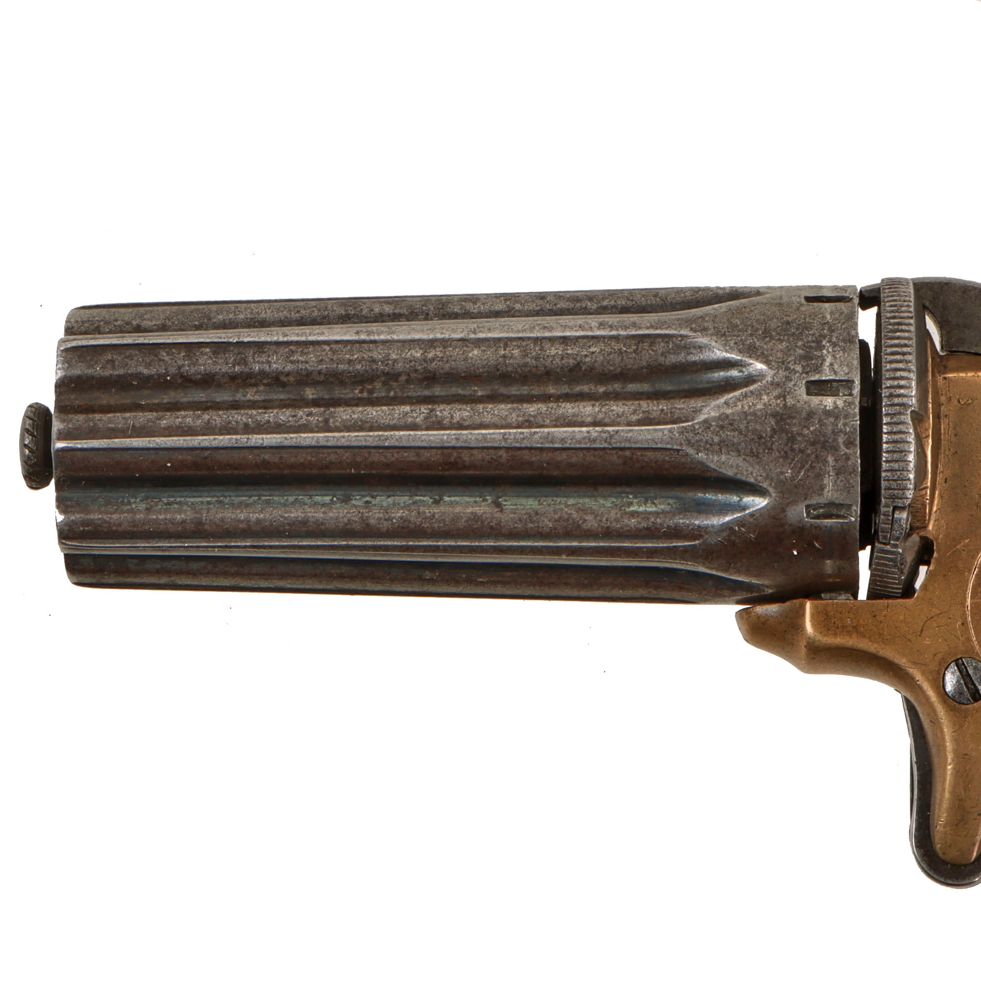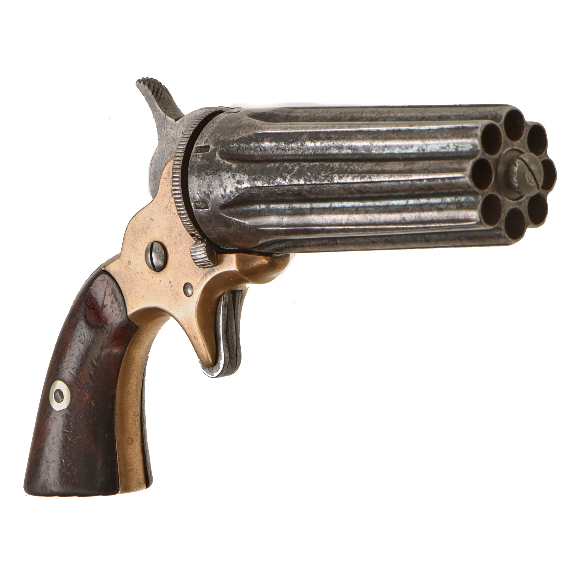 Original Item: Only One Available. This is an example of the unusual firearm system known as the "PEPPERBOX" revolver, where instead of a cylinder with a single barrel, the gun features assembly of multiple barrels. They were so named because the muzzle is similar in appearance to the business end of a Pepper Pot from the the early days of Queen Victoria: a circle of round holes. Recently acquired at a military auction, this is a very nice condition American manufactured Pepperbox percussion pistol utilizing the 1864 patent of Jacob Rupertus. It is an 8 Shot .22 rimfire Pepperbox Revolver designed and produced in the mid to late 1860s, with a total production of only 3,000, far less than the vast numbers turned out by companies like Sharps.