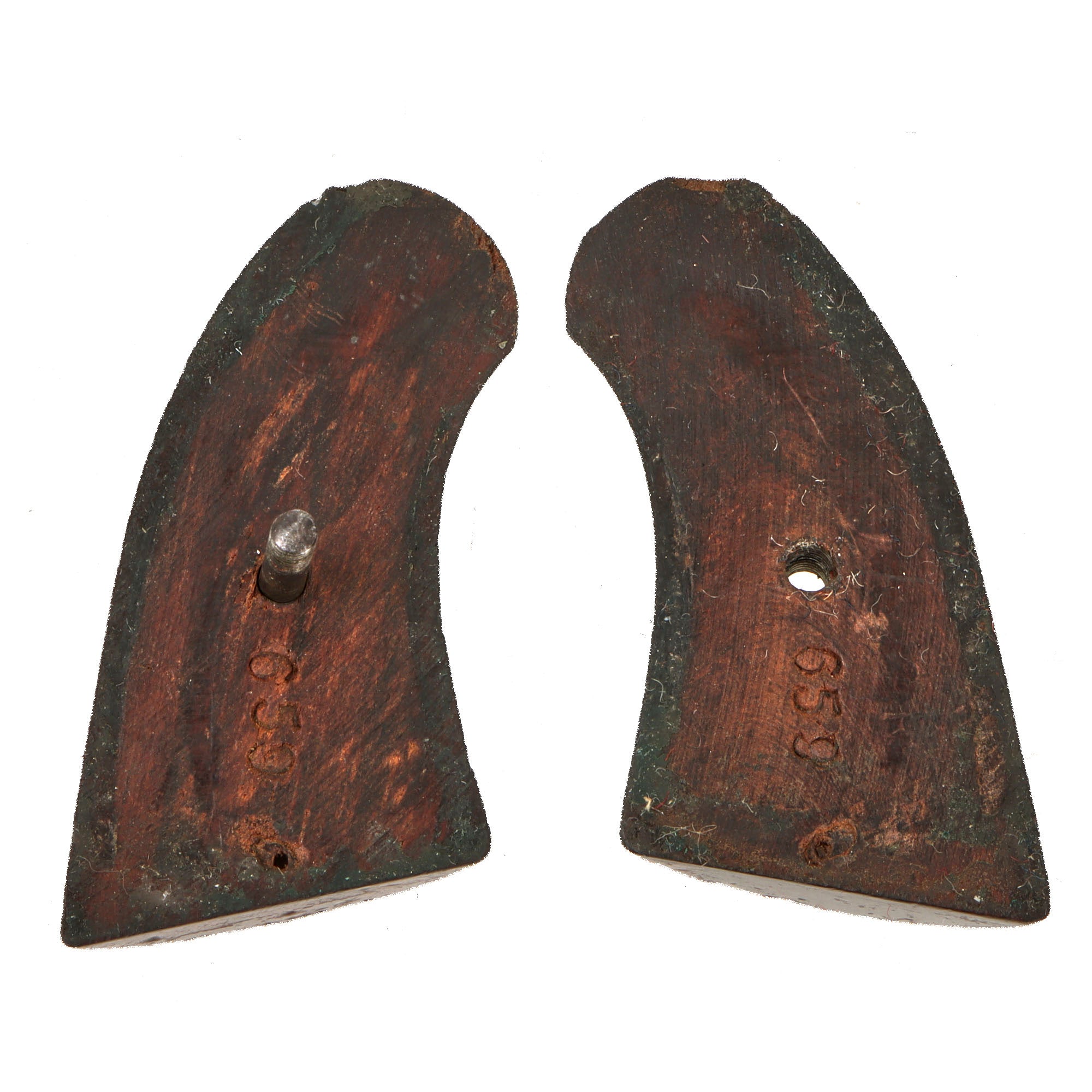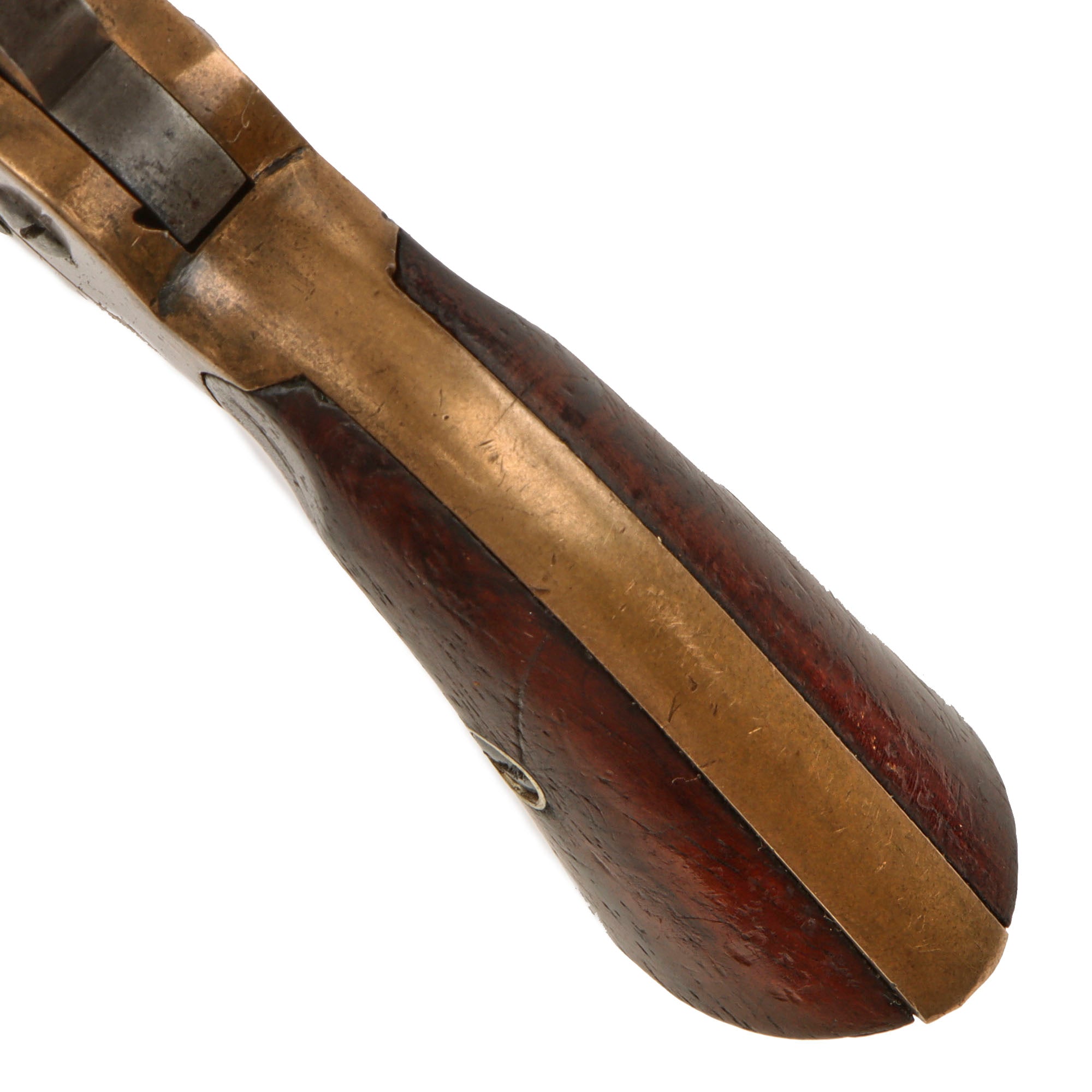 The revolver features a brass frame with a steel barrel cluster, and what look to be walnut grip scales, and it is similar in size and shape to other designs, except for the barrel cluster and ingenious safety / loading system. The grips look to be walnut, and still retain much of the original "piano varnish" finish used during the period. Removing the grips shows serial number 659 clearly on the left side of the grip frame and on the insides of both grips. The back of the cylinder is also marked with 6 5 9 ▲ S, which makes this a great "All Matching" example, without any parts swapped out over the years.