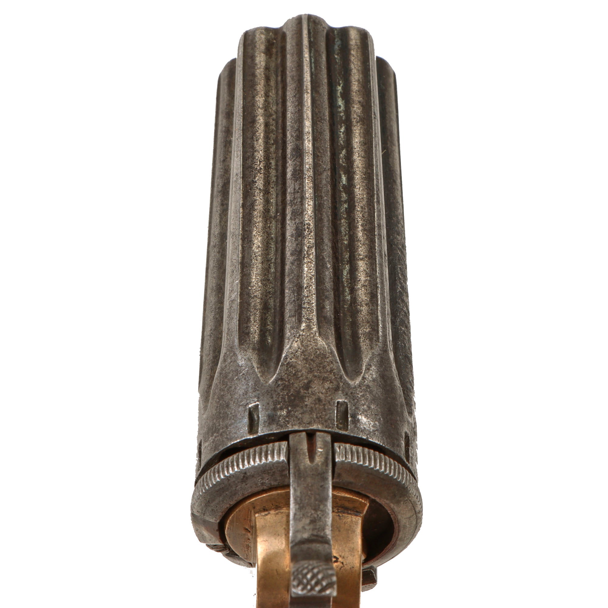 The Pepperbox is in very good condition, fully operational but NOT sold for firing. It displays a lovely matured patina overall, with no signs of misuse, just age and cleaning. It functions very well in single action only, with the cylinder cycling correctly and a crisp dry fire. The hammer lines up slightly off center, which looks to be correct, and one of the benefits of the pepperbox system is that cylinder barrel alignment is a non-issue.