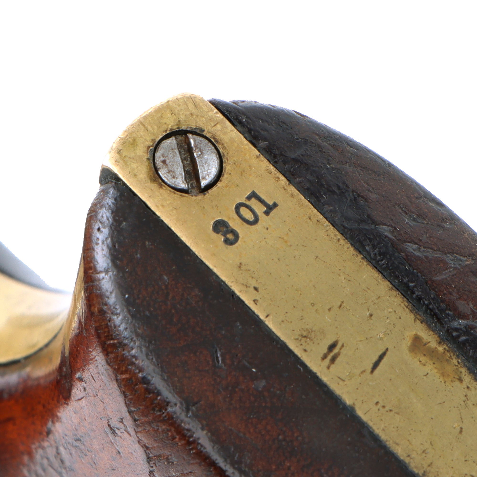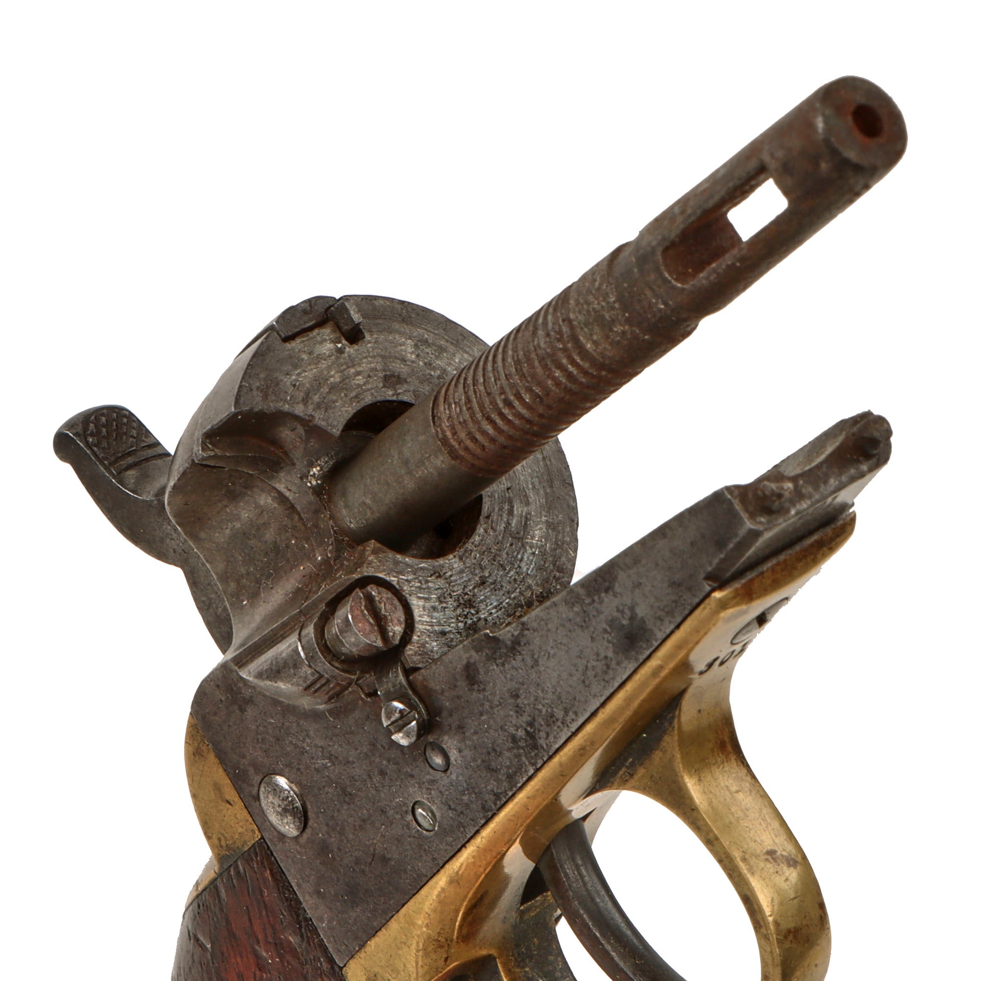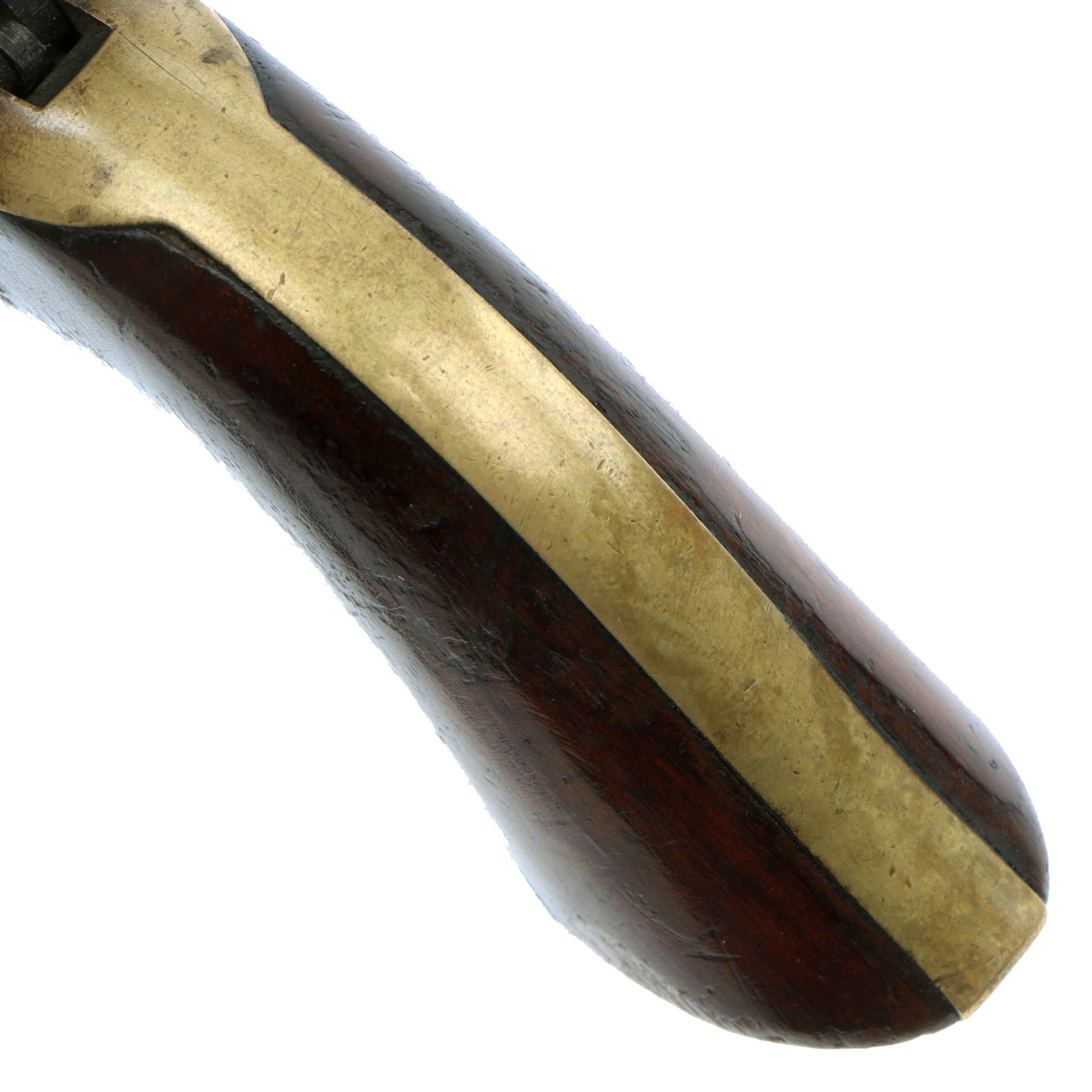 The pistol metalwork shows a lovely worn patina of age, showing a lovely light gray color overall, with some areas of past peppering. We do not see any of the original bluing remaining, but there is no major pitting or other damage. The grip frame on this example is brass, and has matured to a lovely "mustard" patina. The walnut grips are in very good shape, with a lovely color and the expected patina of age. They still have over 75% of the original "Piano Varnish" finish that was applied to these at the factory, with wear on the bottom of the grips as usually seen.