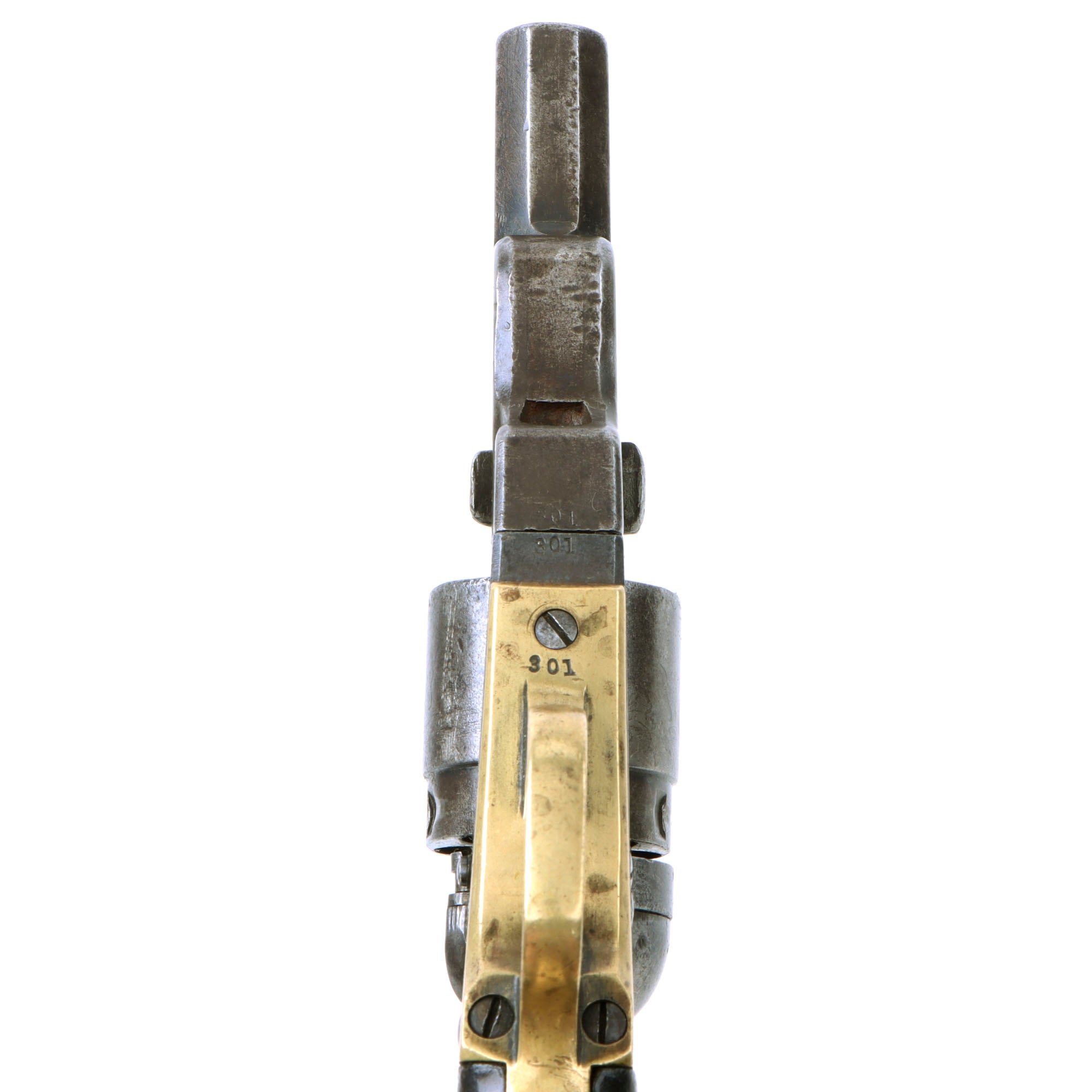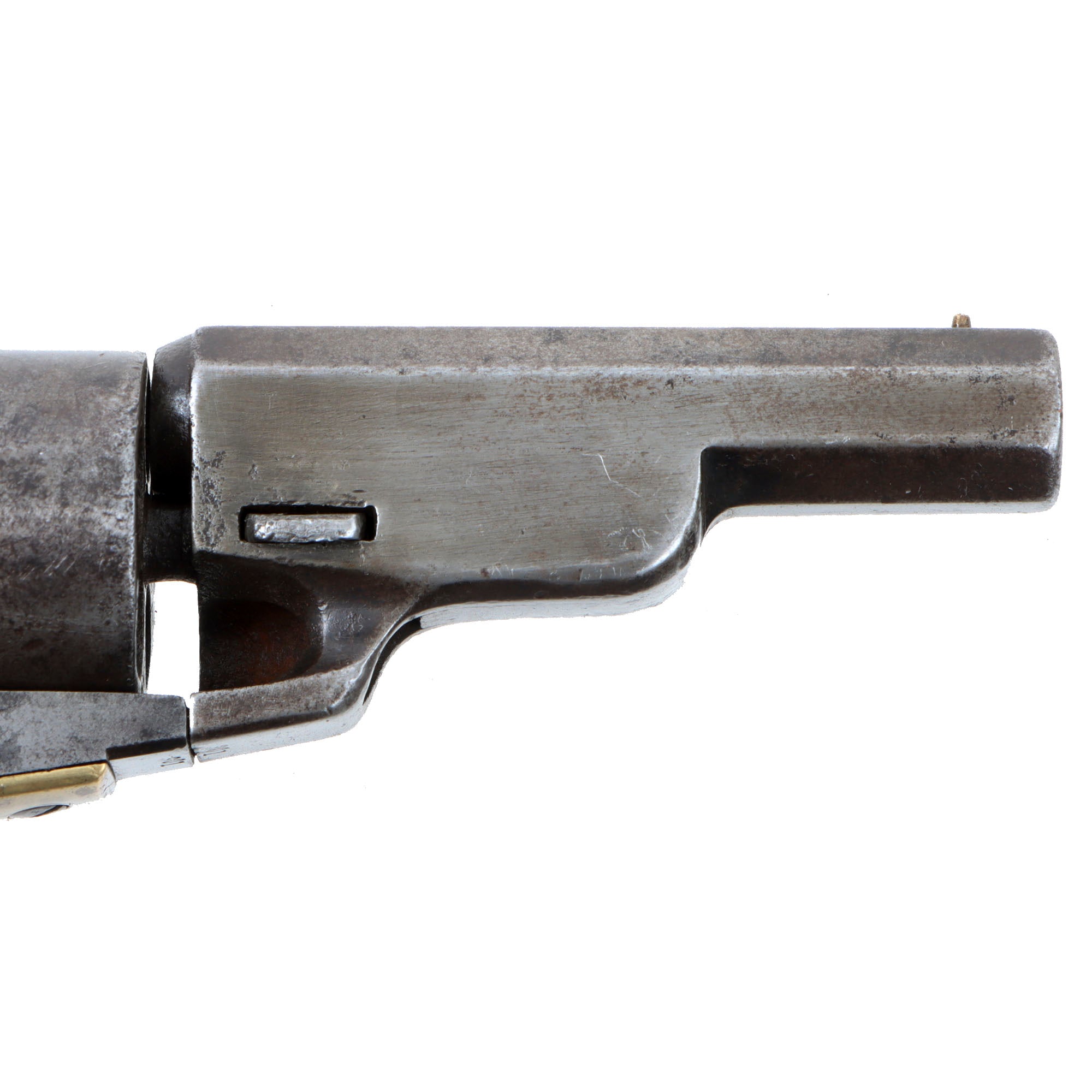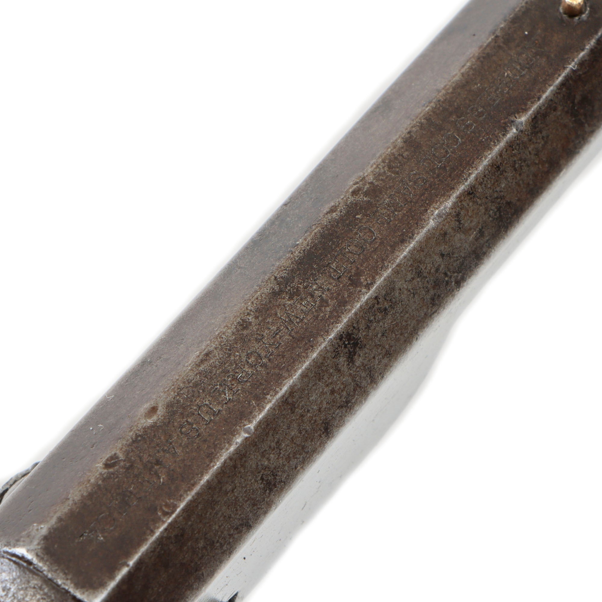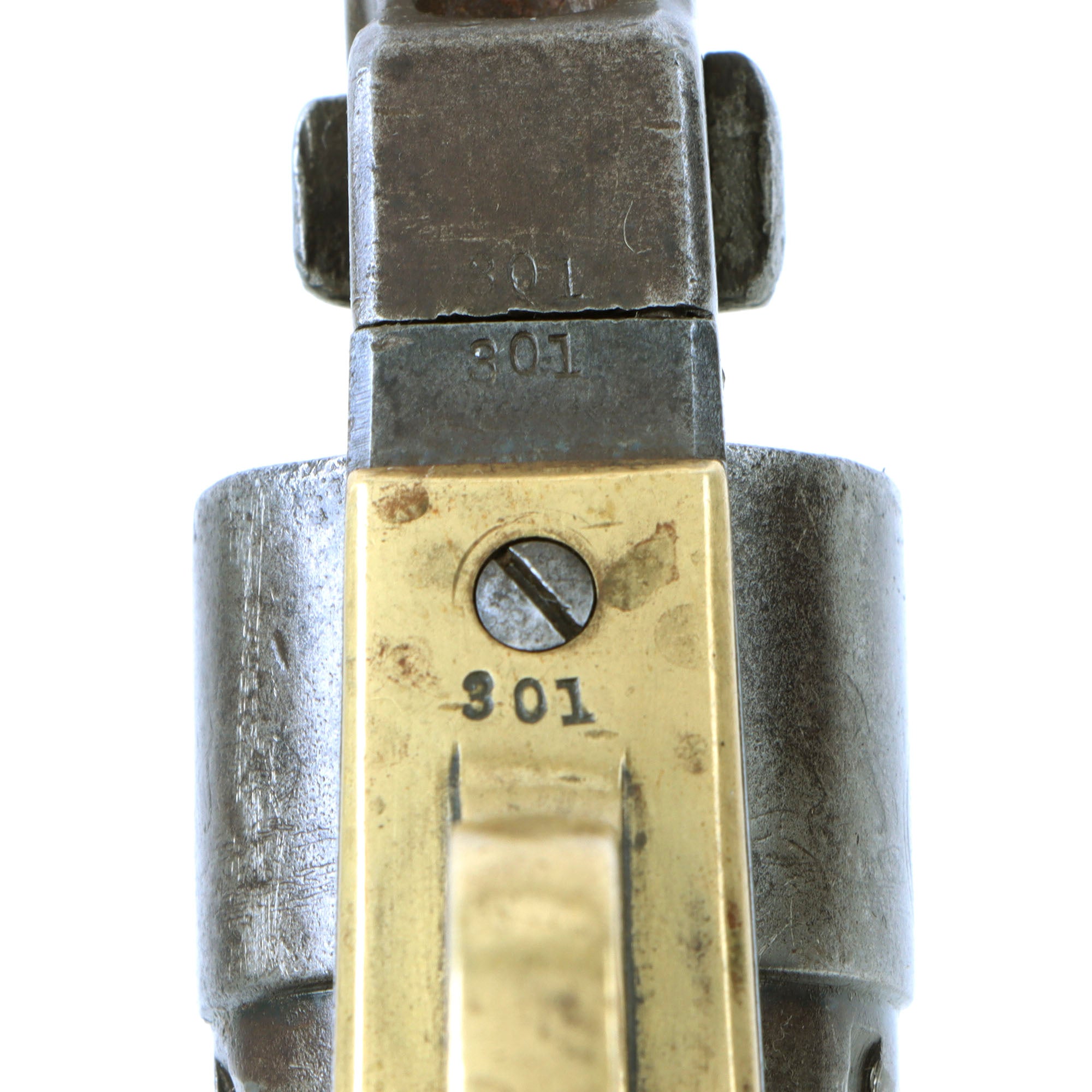 Some of these that we have seen have what look to be new-made 3 1/2" barrels, however this example definitely looks to be a "Pocket Navy" example that was shortened to 3 1/8", and had the loading rammer channel partially filled. It has the Colt "Single Line" address on the top, which would have been correct for a 6 inch barrel length:-