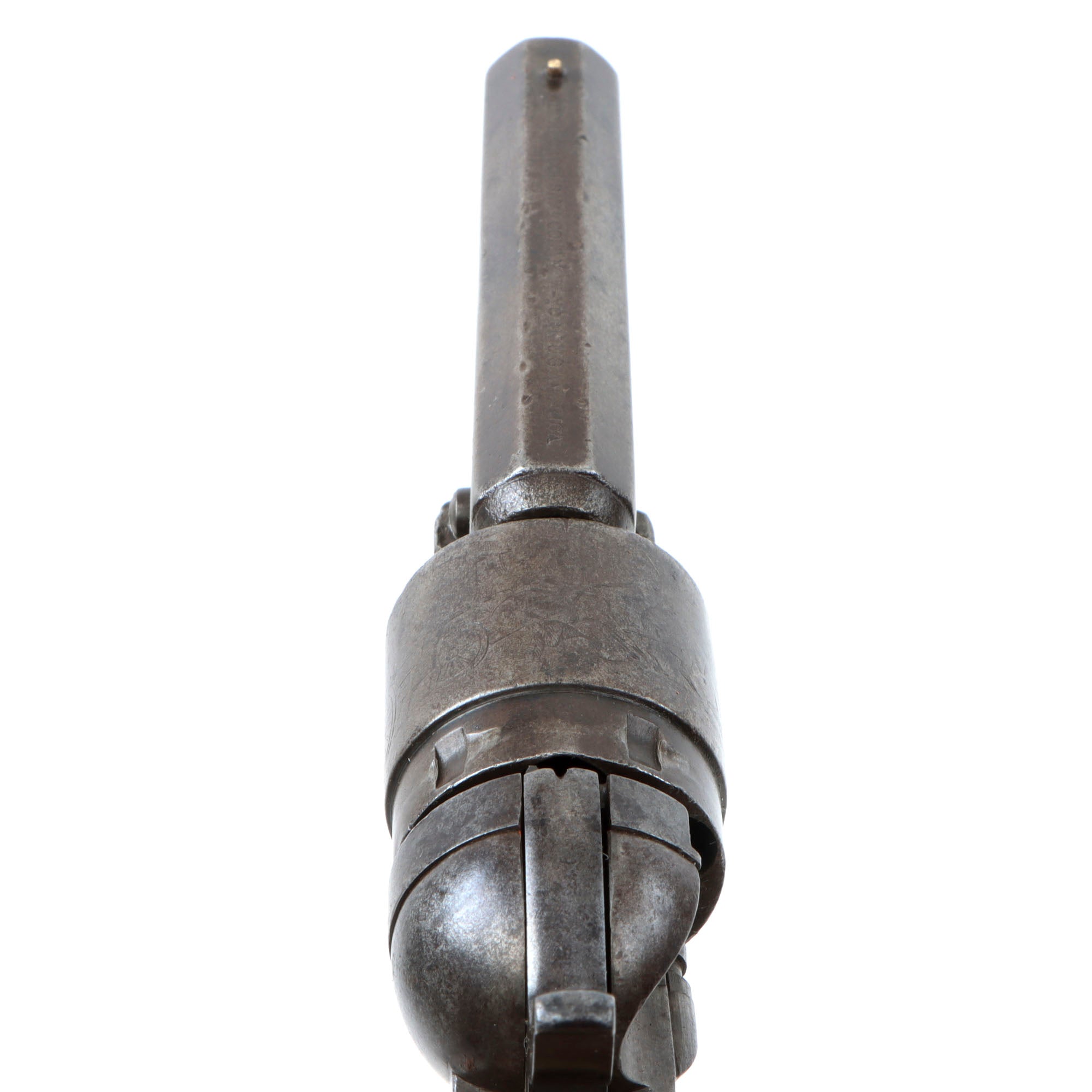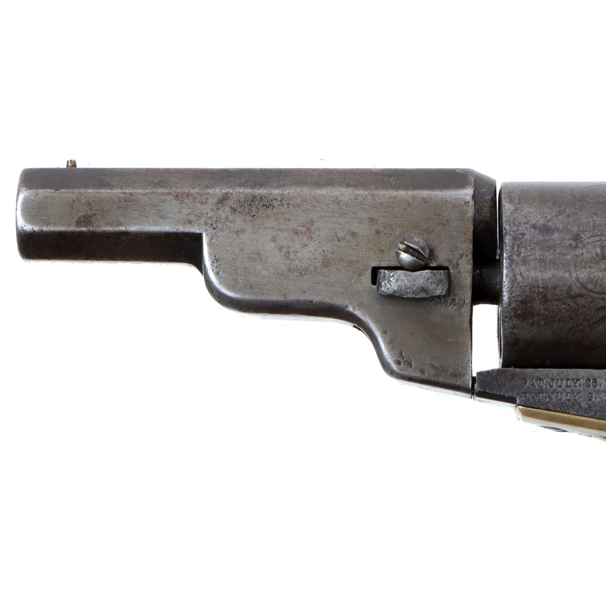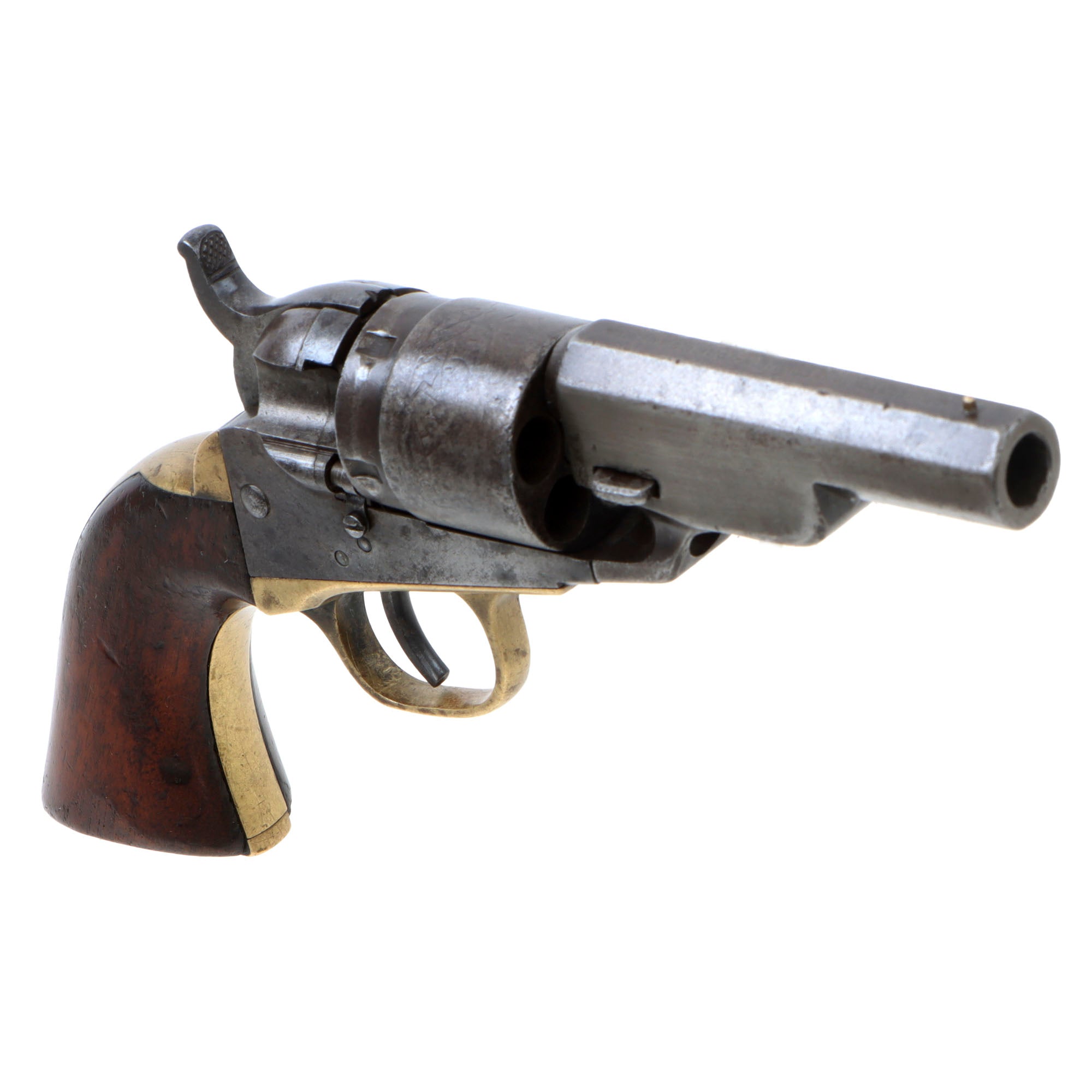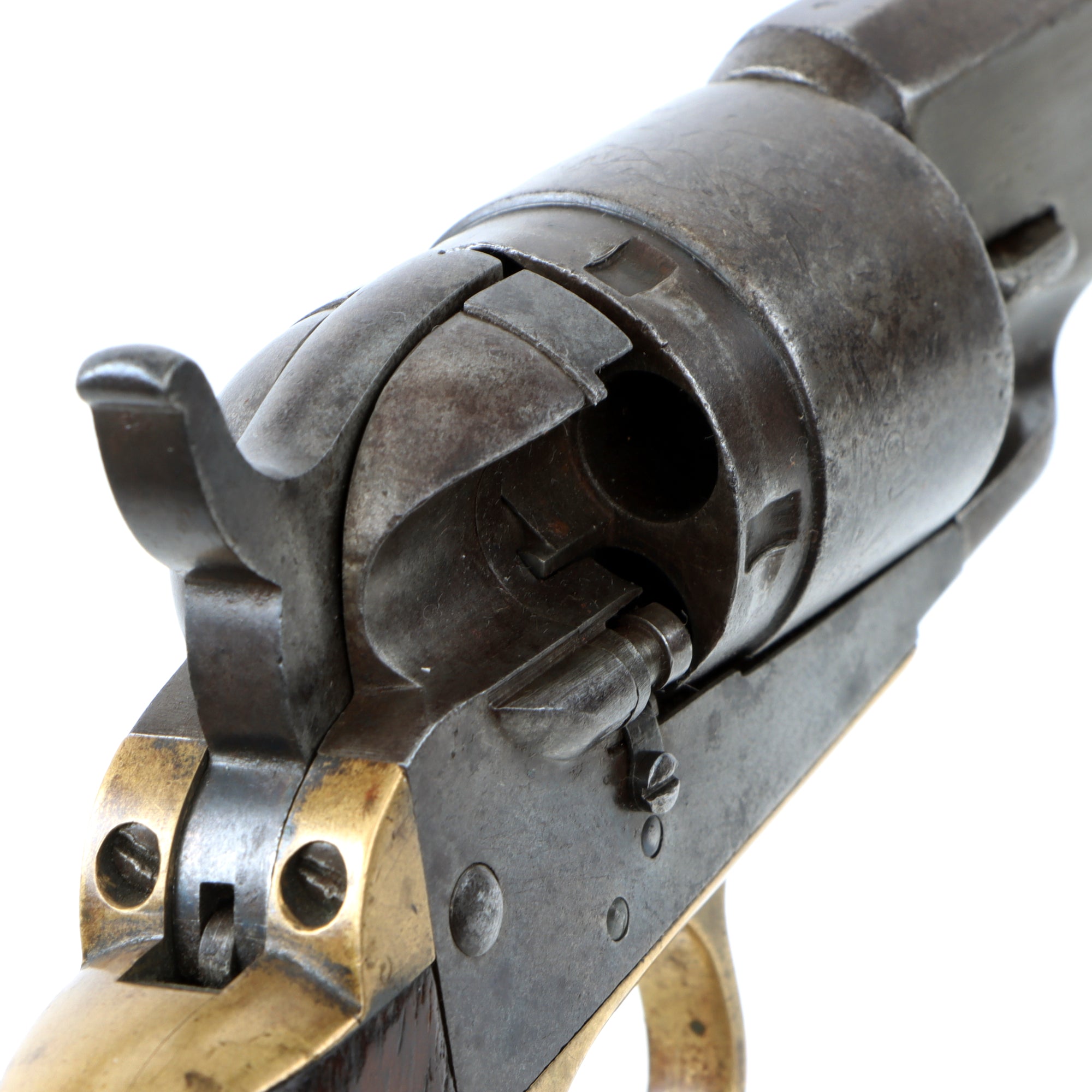 Some of these that we have seen have what look to be new-made 3 1/2" barrels, however this example definitely looks to be a "Pocket Navy" example that was shortened to 3 1/8", and had the loading rammer channel partially filled. It has the Colt "Single Line" address on the top, which would have been correct for a 6 inch barrel length:-