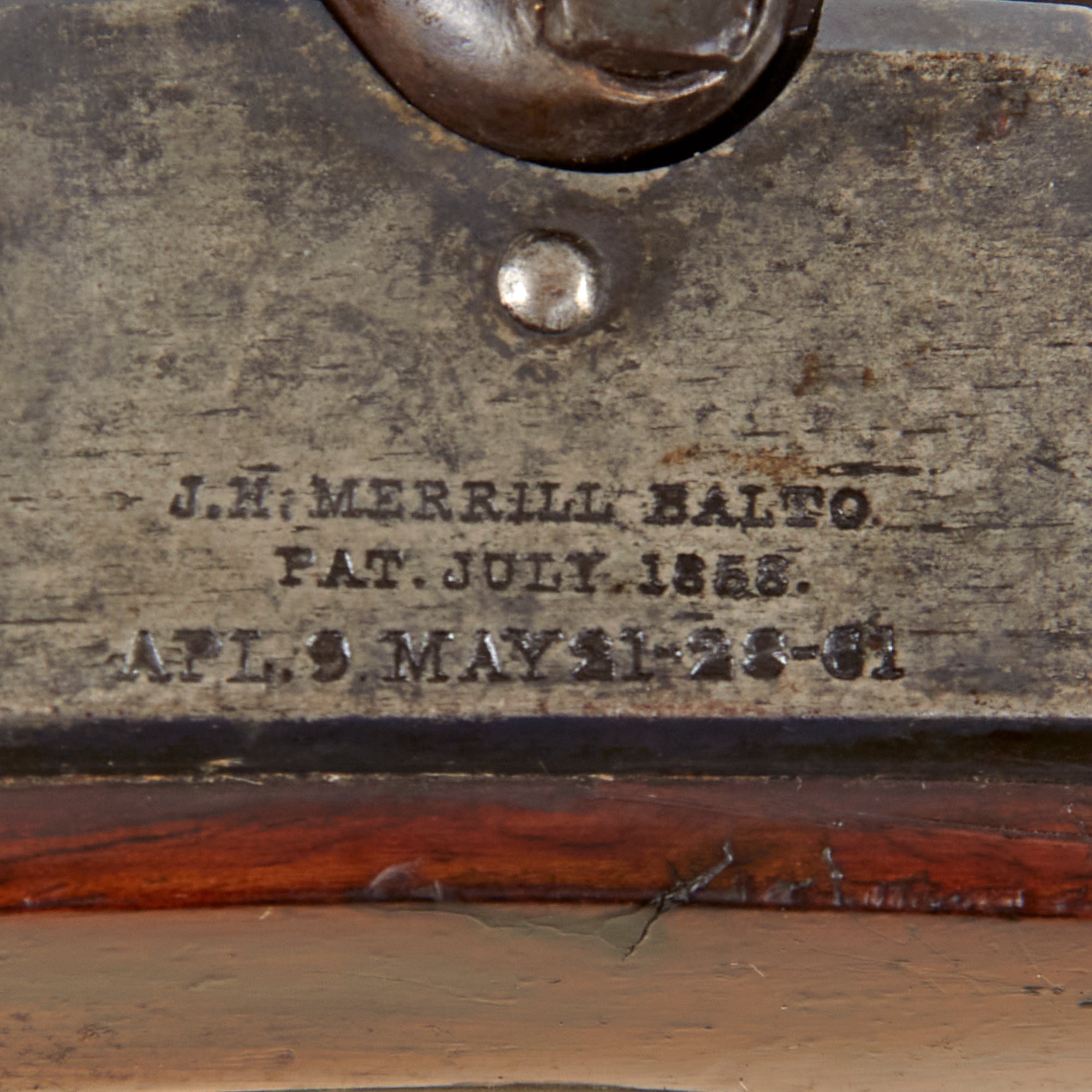 Original Item: One of a Kind. This is a very interesting example of what was originlly a percussion breech loading Civil War Saddle Ring Carbine. As they use both a cap and a type of breech loaded cartridge, they are often referred to as "capping breech loaders". Somewhere around 14,500 were made by J.H. Merrill of Baltimore for the Union Cavalry, mostly between 1863 and 1865. The carbines were produced in two versions: First Type and Second Type. The First Type included a brass patch box in the stock and had the breech lever secured by a flat, knurled latch. The Second Type was produced without the patch box and had the breech lever secured with a rounded, button type latch. The majority of the carbines, something over 10,000 were of the First Type, with the Second Type coming in during July 1864 and accounting for about 4,100. The breech loading design is somewhat unique: a breech loading percussion system with a large breech lever / loading rammer. Percussion cartridges were loaded, pushed forward into the breech by the rammer, and then ignited by a percussion cap.