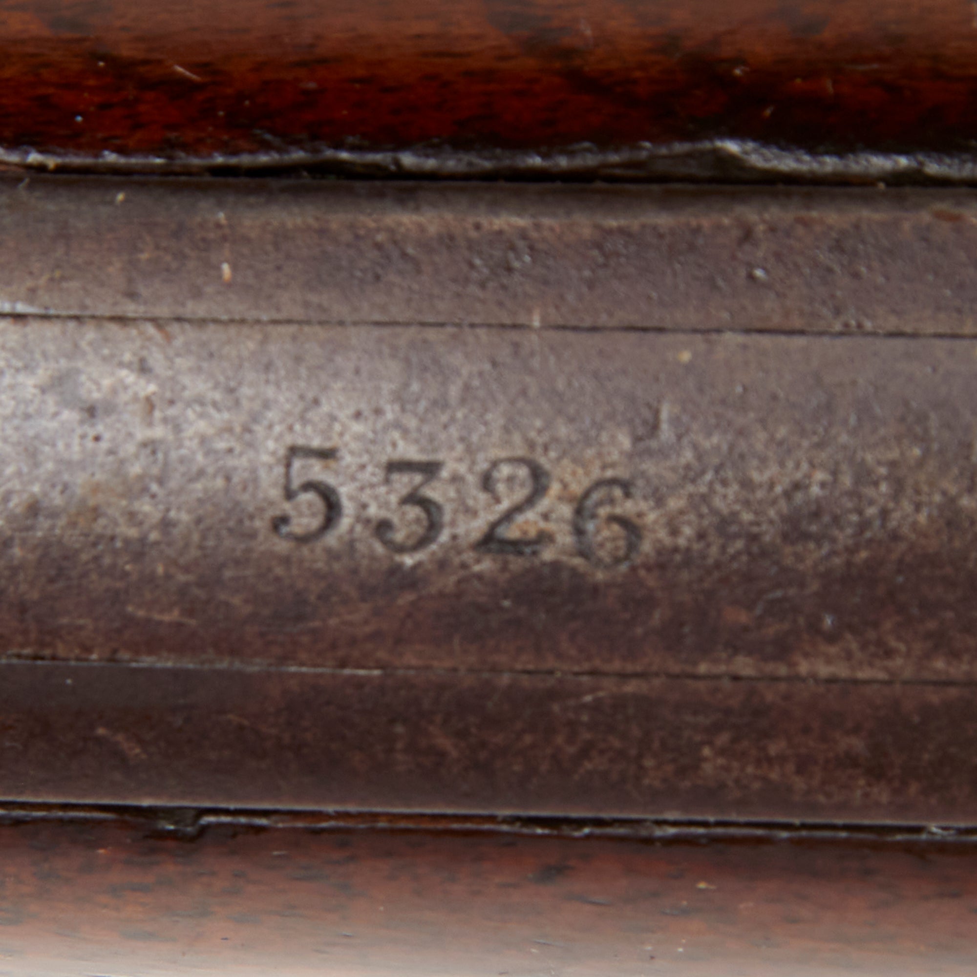 This fine example bears serial number 5290 on the lock, while the modified breech lever is marked with 5326 on the back. The serial number for this would usually have put it into the "Type I" range, but as the breech lever lock has been removed, there is no way to tell. The lock plate still has the original markings, which are still crisp:
