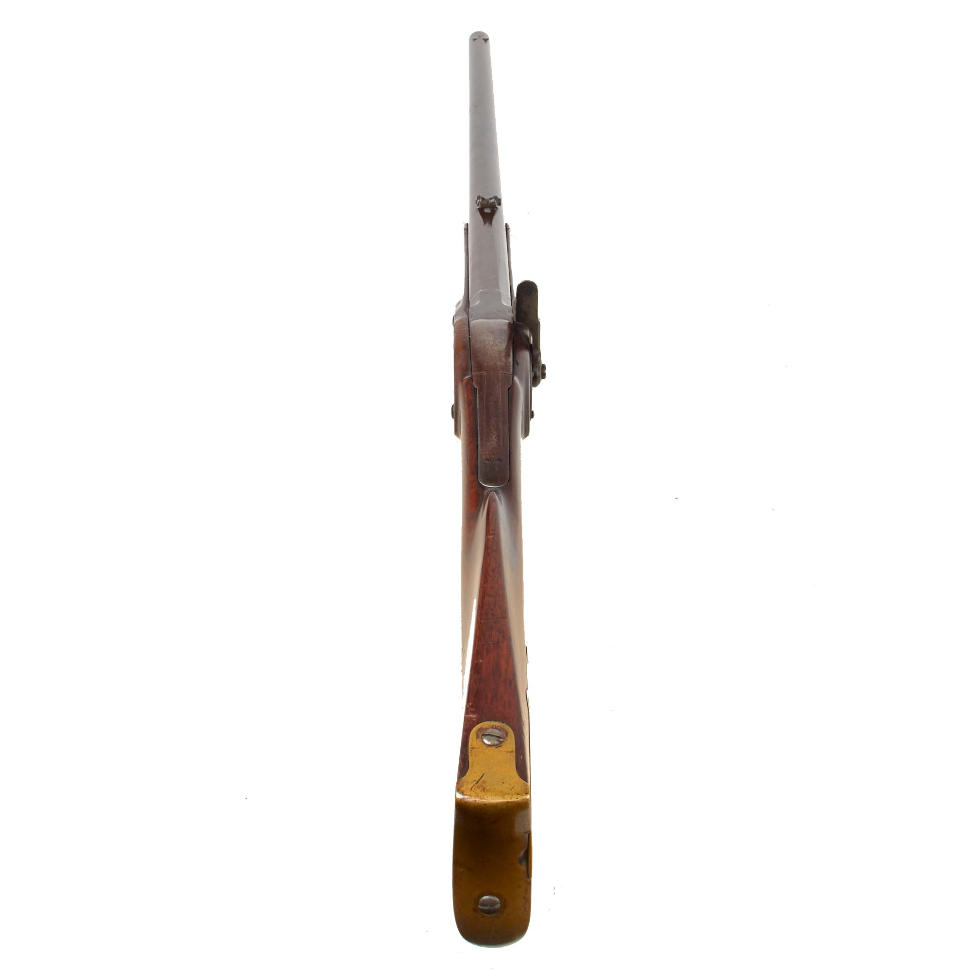 This example is however no longer a breech loader, having been converted to a Muzzle loader, most likely for sporting or hunting use. The breech loading system was not without its drawbacks, and it most likely would be damaged over the long term by fouling and wear. As such the breech loading components were locked in place, and we think we can see a ground off pin used to secure the breech lever in placed on the top of the receiver. As there is no longer any way to open the breech, we do not know what type of internal modifications were made. Additionally, We noted that the stock, or in particular the butt stock, looks to have been refit with the brass butt plate and patch box from a Sharps Model 1853 carbine or similar, as it is definitely not correct for a Merrill. The barrel was also replaced, possibly with a shortened barrel from a Merrill Rifle, or perhaps something entirely different. Really a very interesting modified examples, the likes of which we have not seen before!