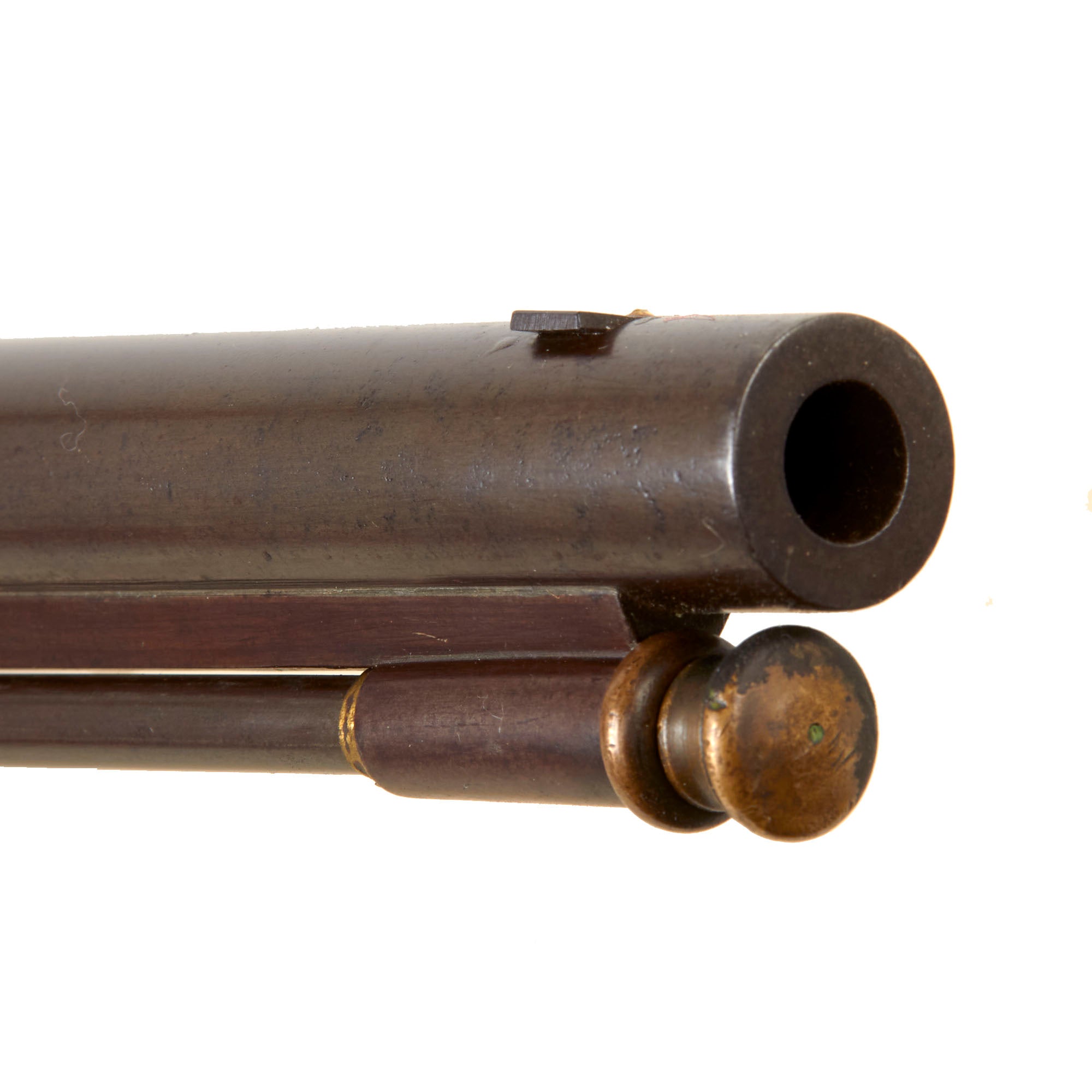The metal components, originally blued, now show a worn gray patina, with some areas retaining the finish better than others after years of cleaning cleaning. We did not see any major oxidation or past pitting, just the usual wear from age. The original rear sight was removed, and replaced with a simple tangent sight, while the front sight was also replaced, however the blade on the replacement broke off. The lock is still functional, though a strong pull at half cock can cause it to discharge. The bore is in very good condition, showing a bright finish with crisp lands and grooves. We did note that the muzzle was counterbored about 3/8" of the way in to remove the rifling, often thought to increase accuracy by removing the rifling at the muzzle, which would be worn by cleaning / ramming.