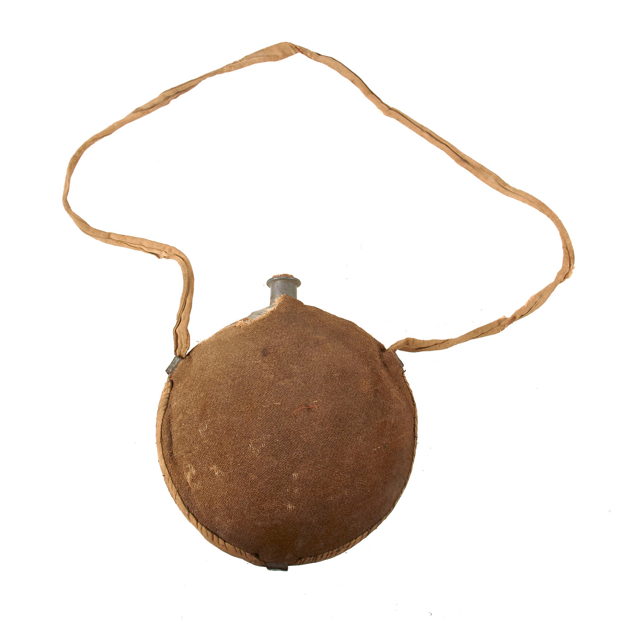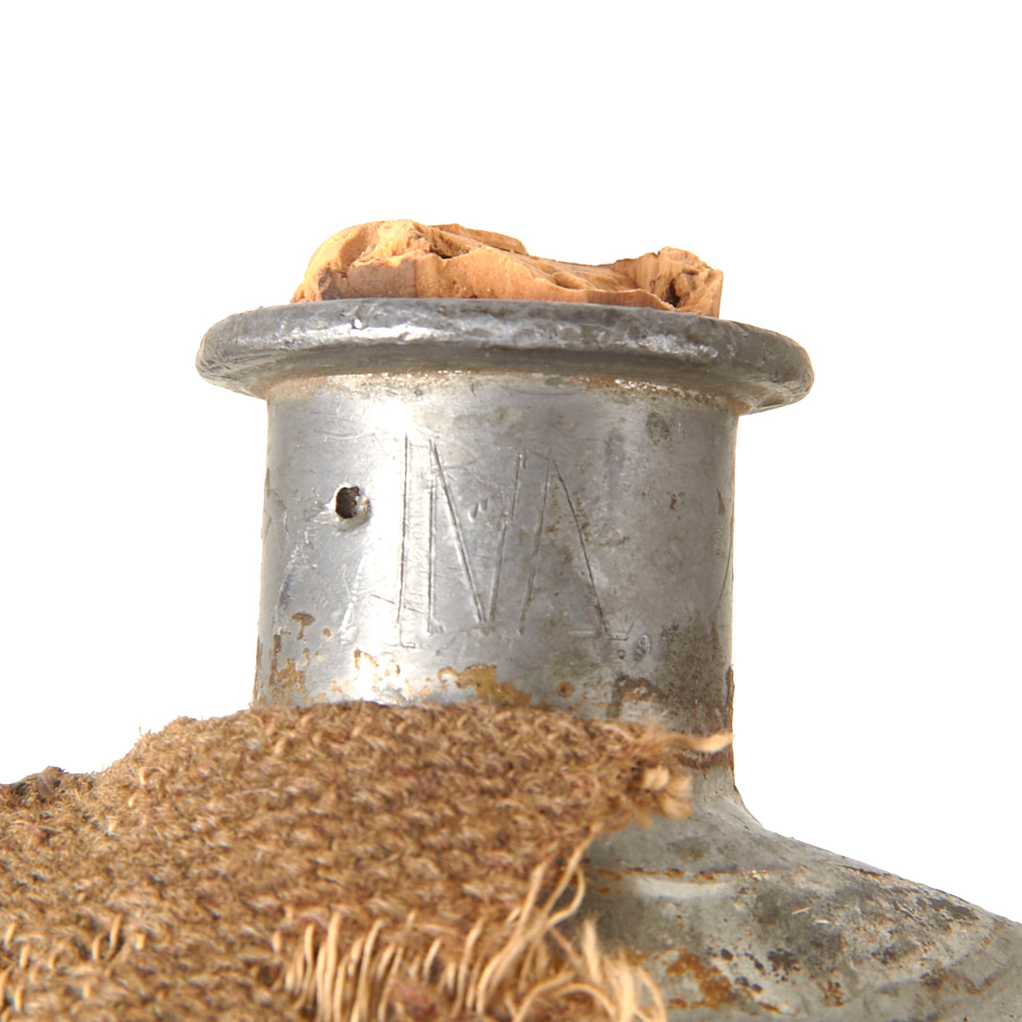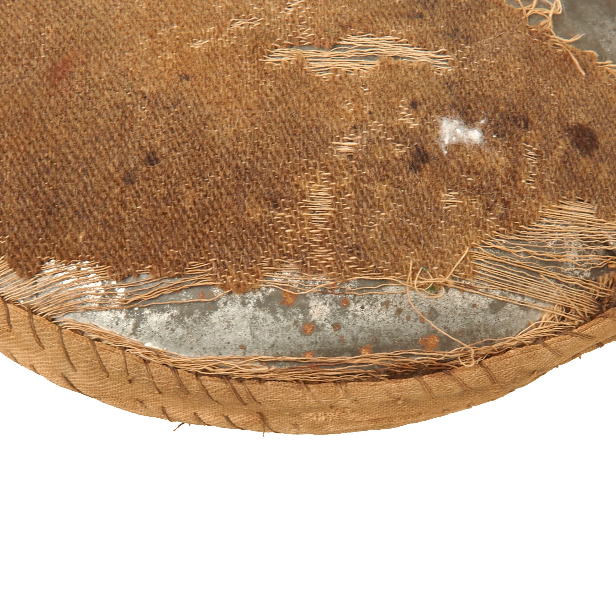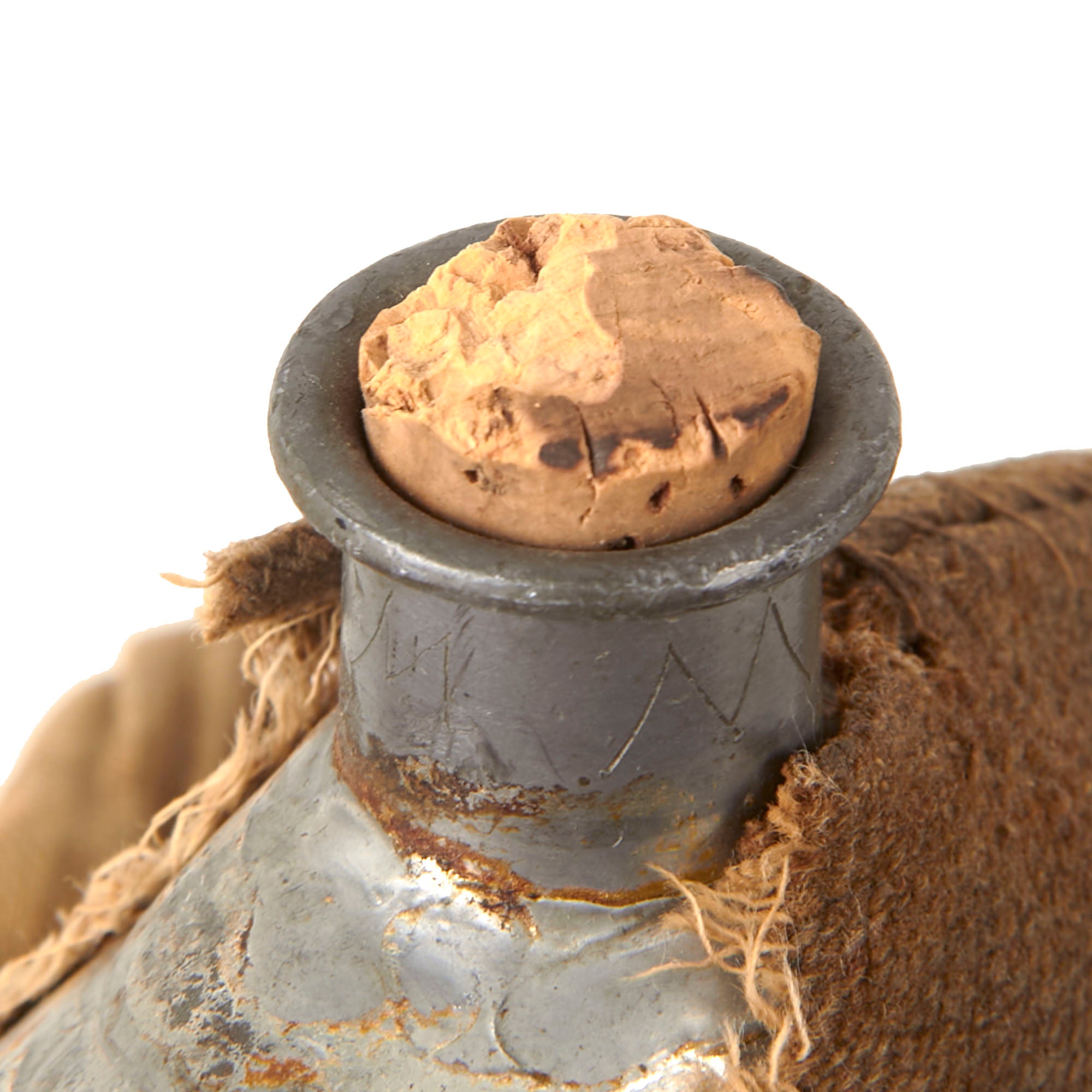 This example has the original wool cover with a very rare federal sling. The spout is scratched with some initials, and the sling is stitched directly into the cover, something we haven’t seen before. The cover has some material loss and staining. The original cork is retained, stuck in the hole without its top.