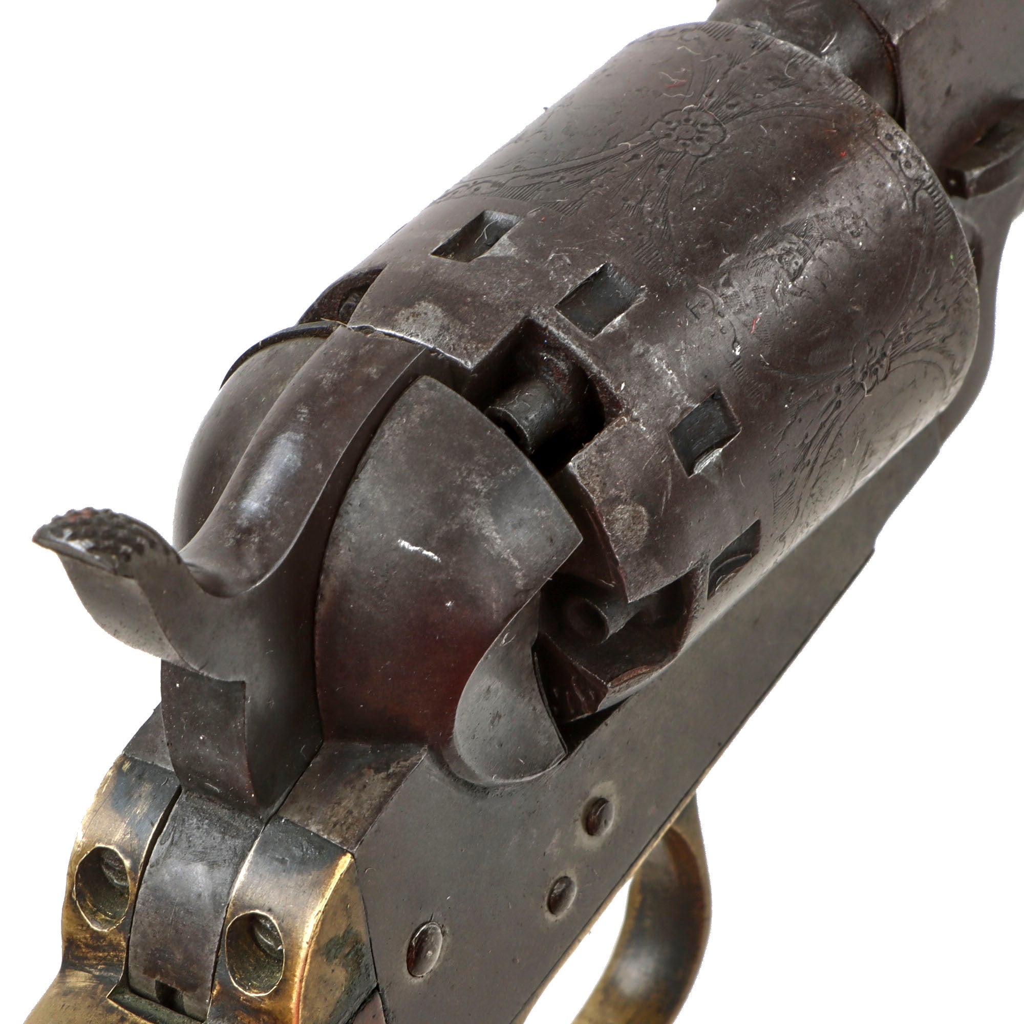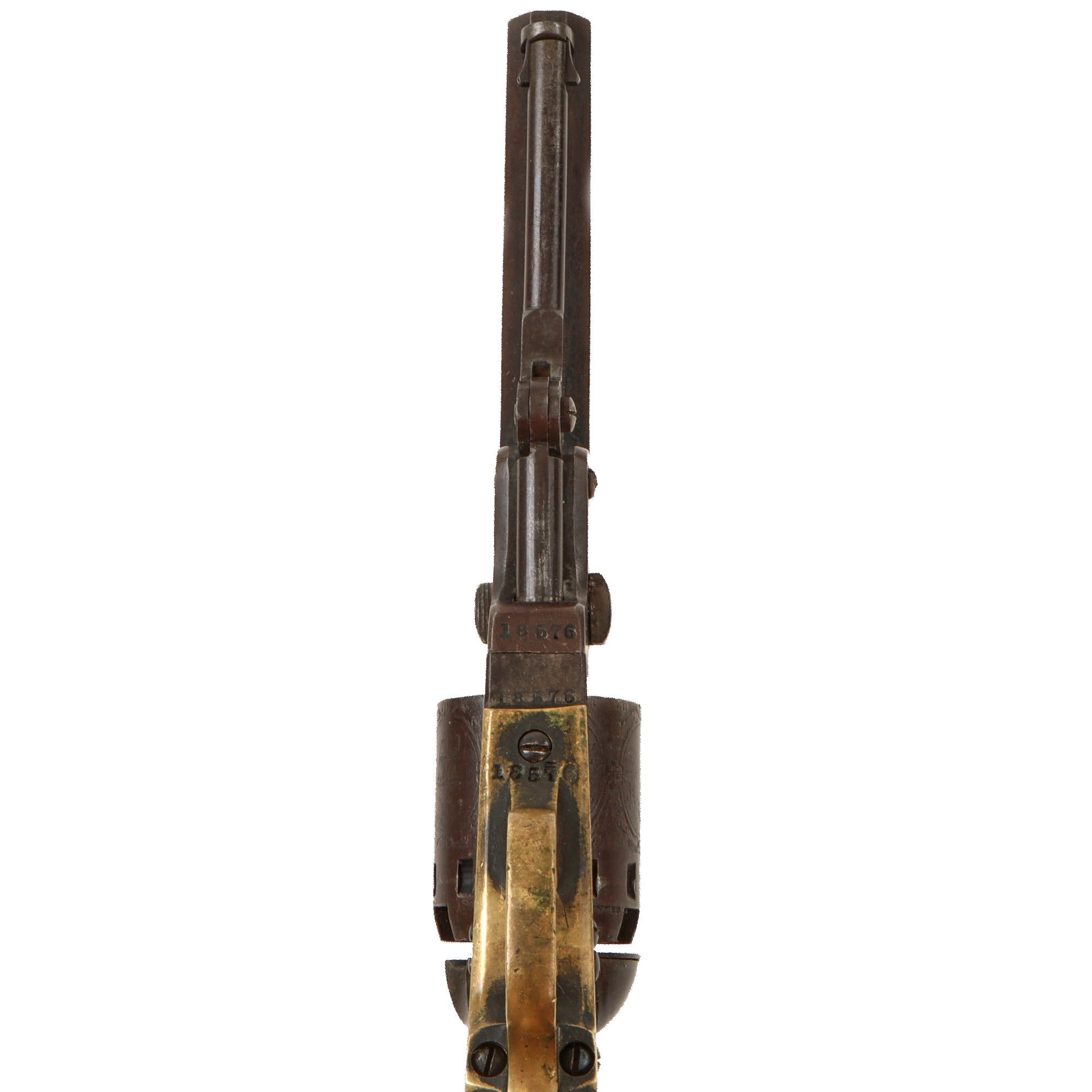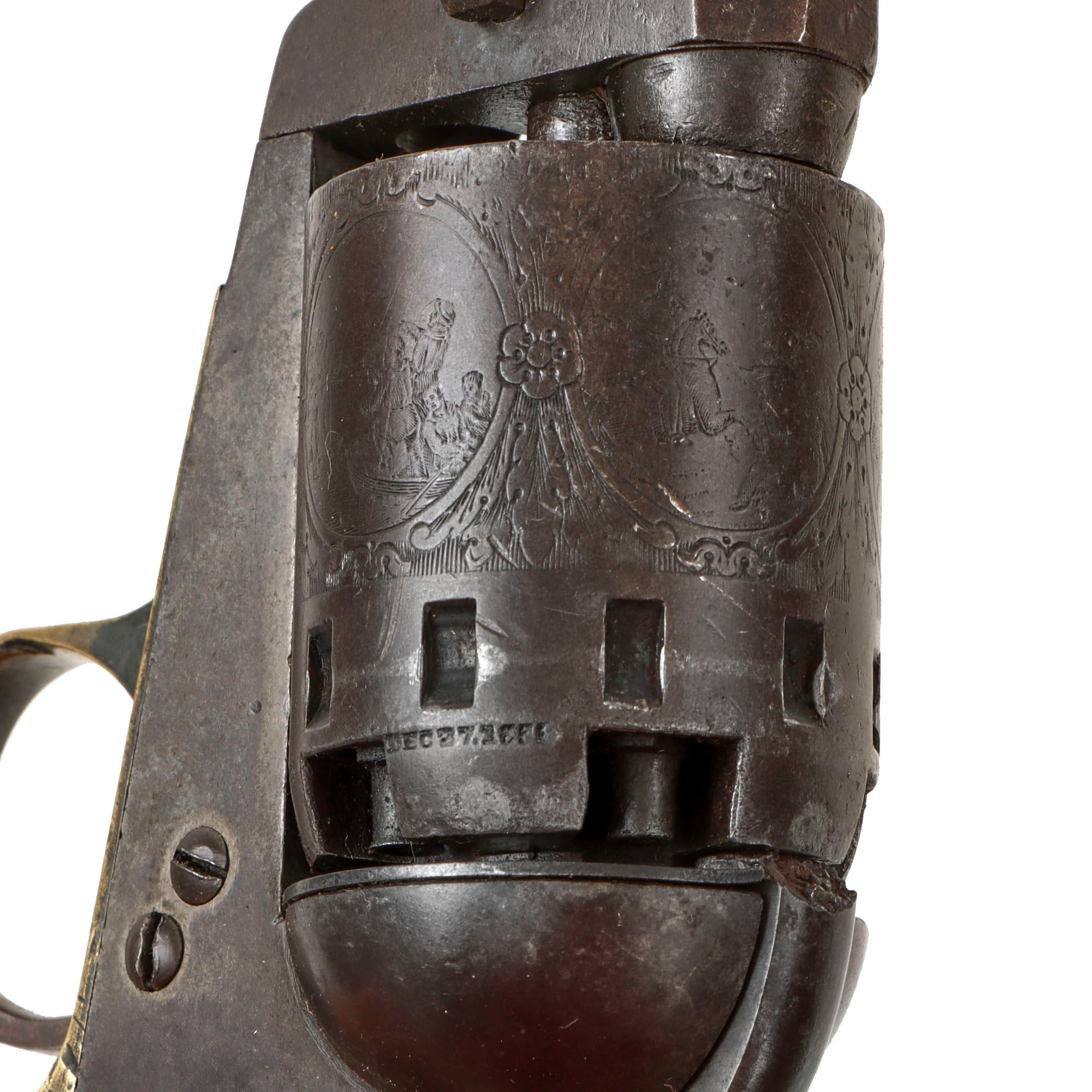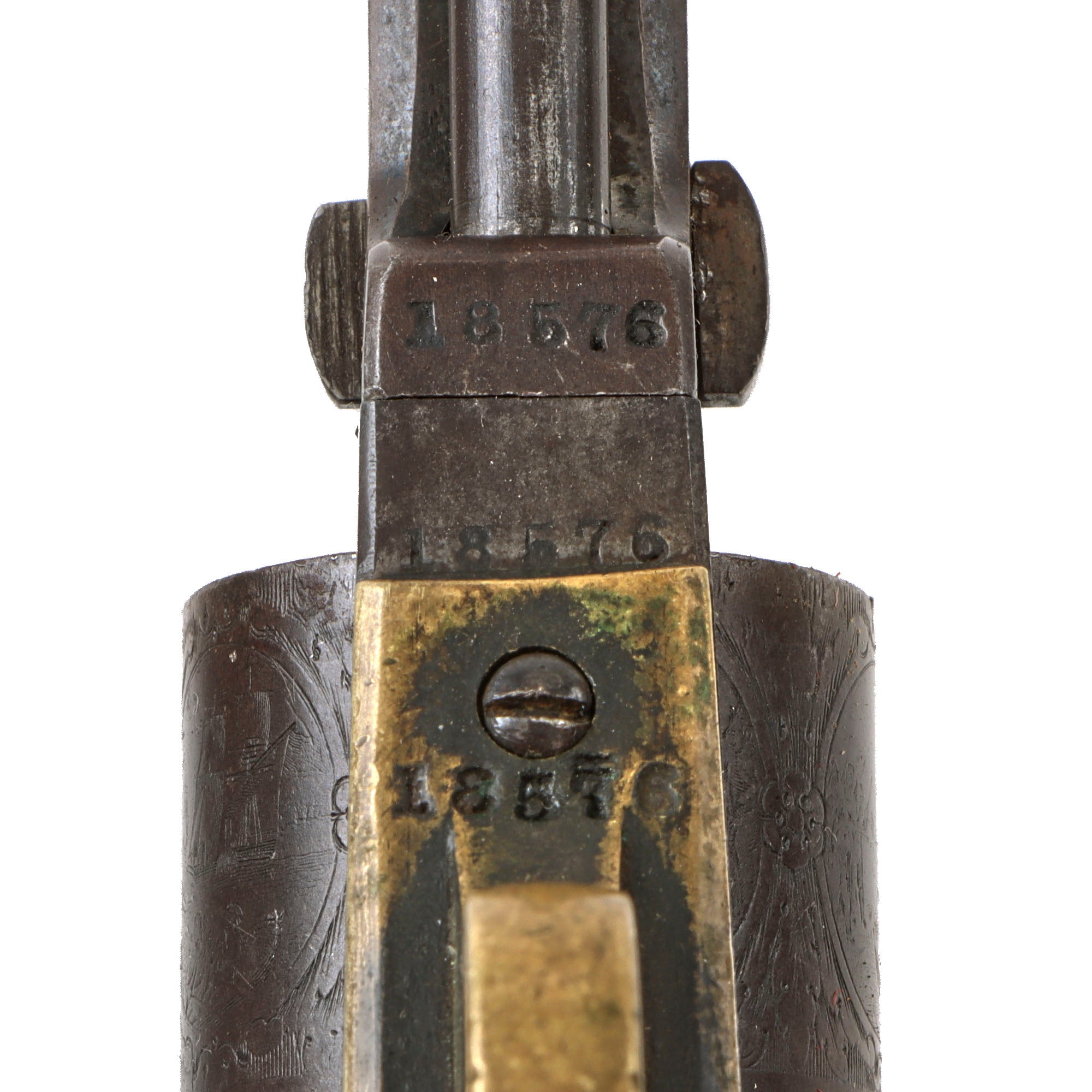 This lovely lightly patinated example features the shorter 5" barrel and matching serial number 18576, which is found on the barrel, frame, trigger guard, cylinder arbor pin, barrel wedge, and the bottom of the grip. The rear of the cylinder bears clear shortened number 8576, making this a very desirable "ALL MATCHING" example, and it's a great one! As a real rarity, the revolver has most of the original cylinder engraving present, which consists of five different scenes, one for each chamber, all of which are still discernable. The cap nipple cones are all and in good shape, and there is even the original PATENTED DEC.27.1859 marking by the rear is fully visible!