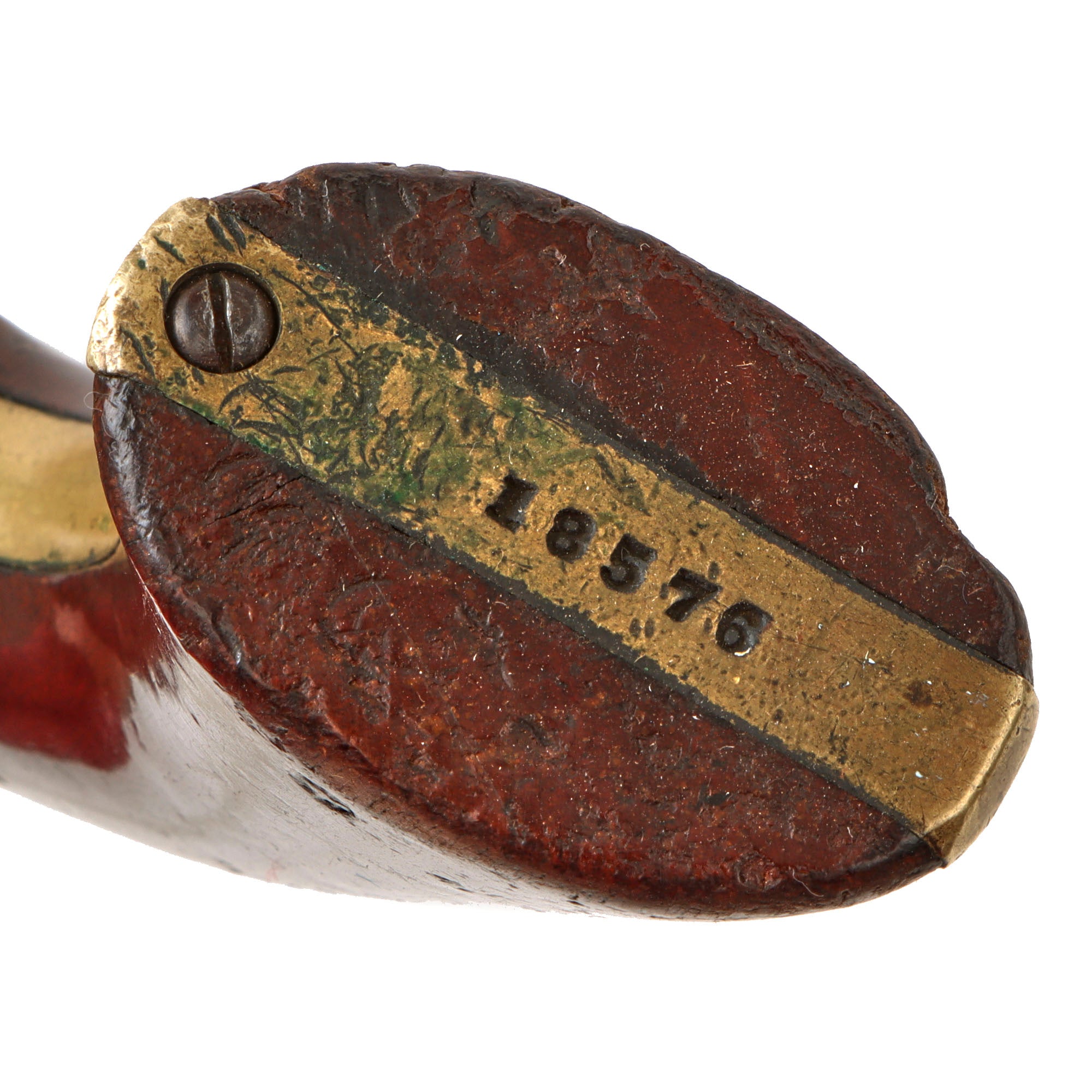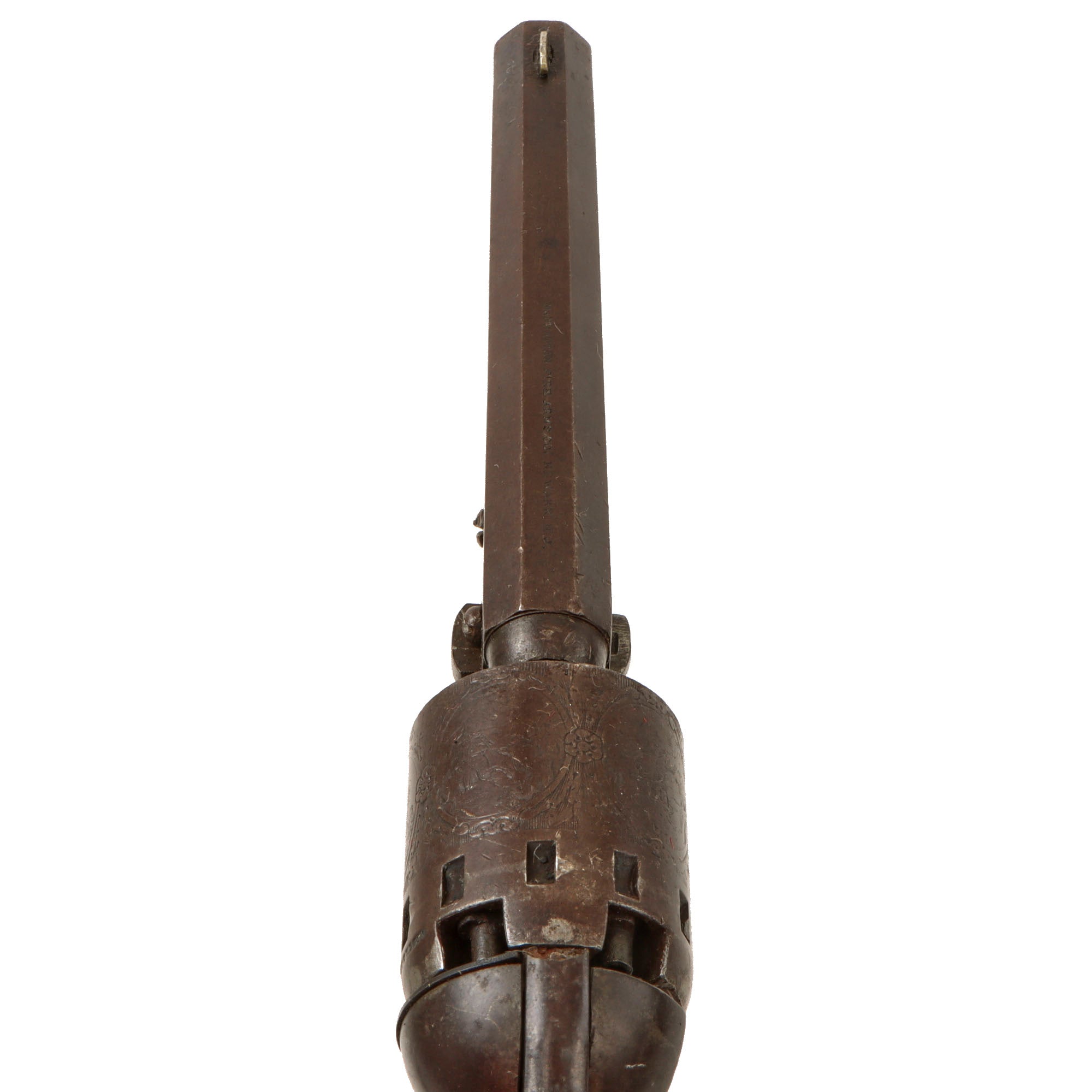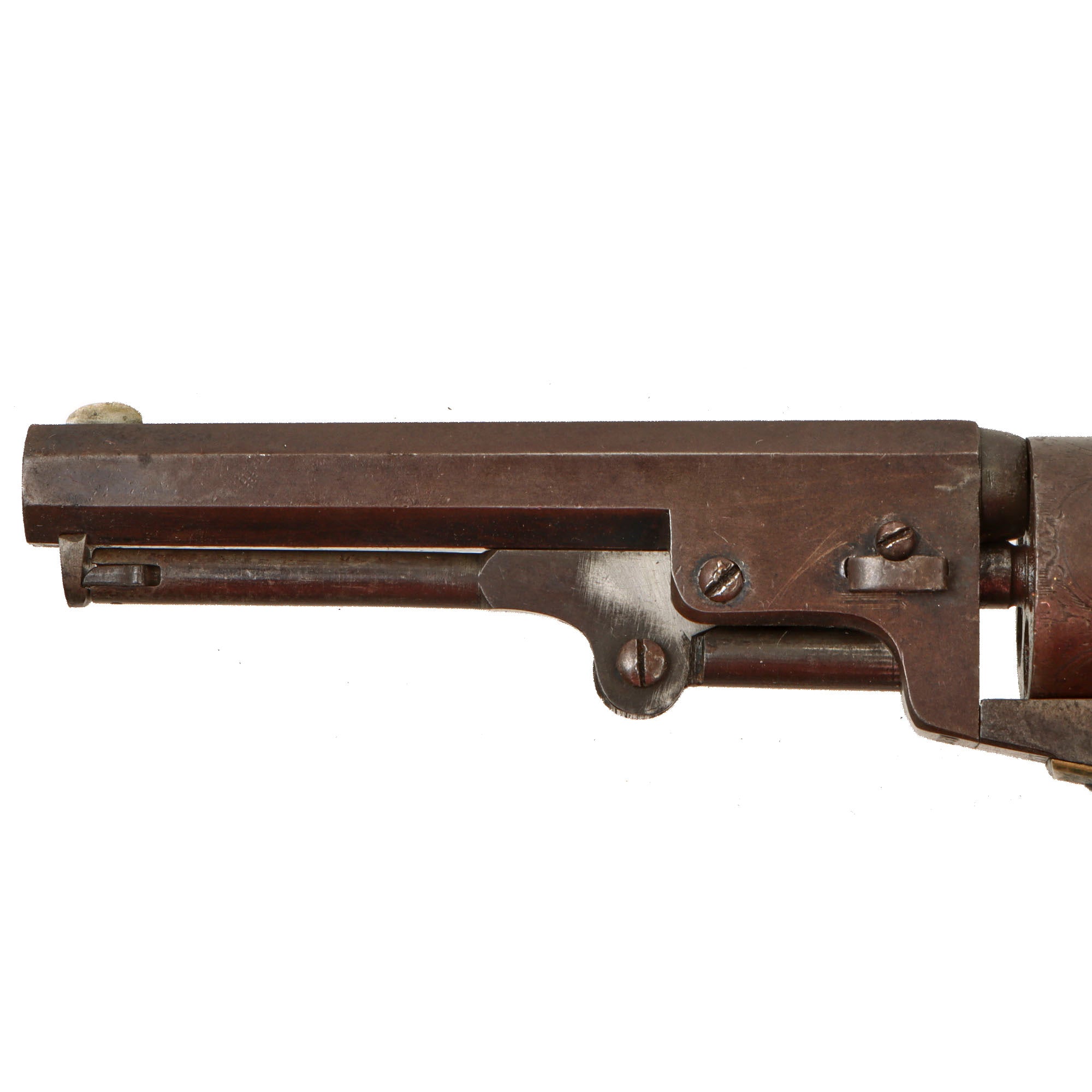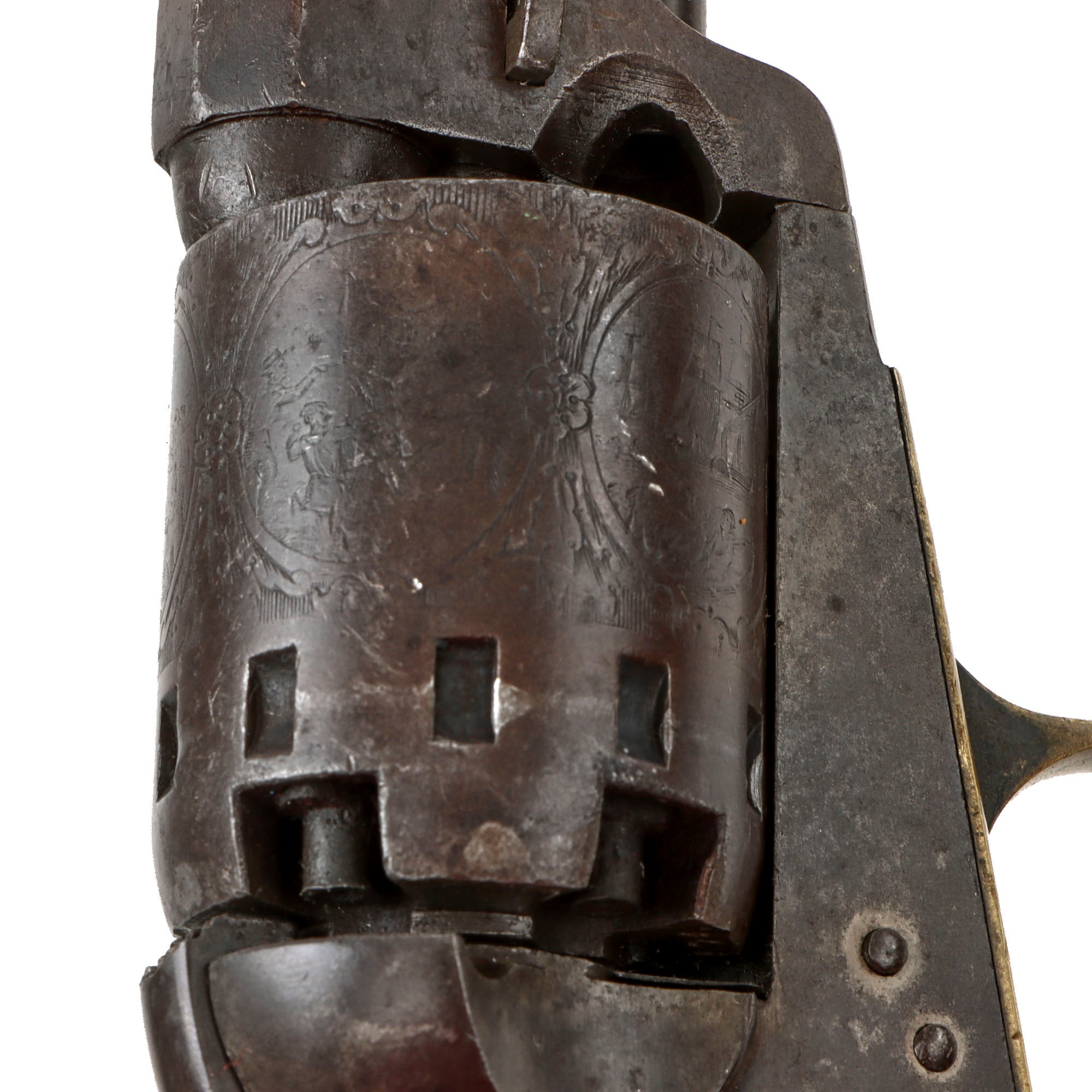 This lovely lightly patinated example features the shorter 5" barrel and matching serial number 18576, which is found on the barrel, frame, trigger guard, cylinder arbor pin, barrel wedge, and the bottom of the grip. The rear of the cylinder bears clear shortened number 8576, making this a very desirable "ALL MATCHING" example, and it's a great one! As a real rarity, the revolver has most of the original cylinder engraving present, which consists of five different scenes, one for each chamber, all of which are still discernable. The cap nipple cones are all and in good shape, and there is even the original PATENTED DEC.27.1859 marking by the rear is fully visible!