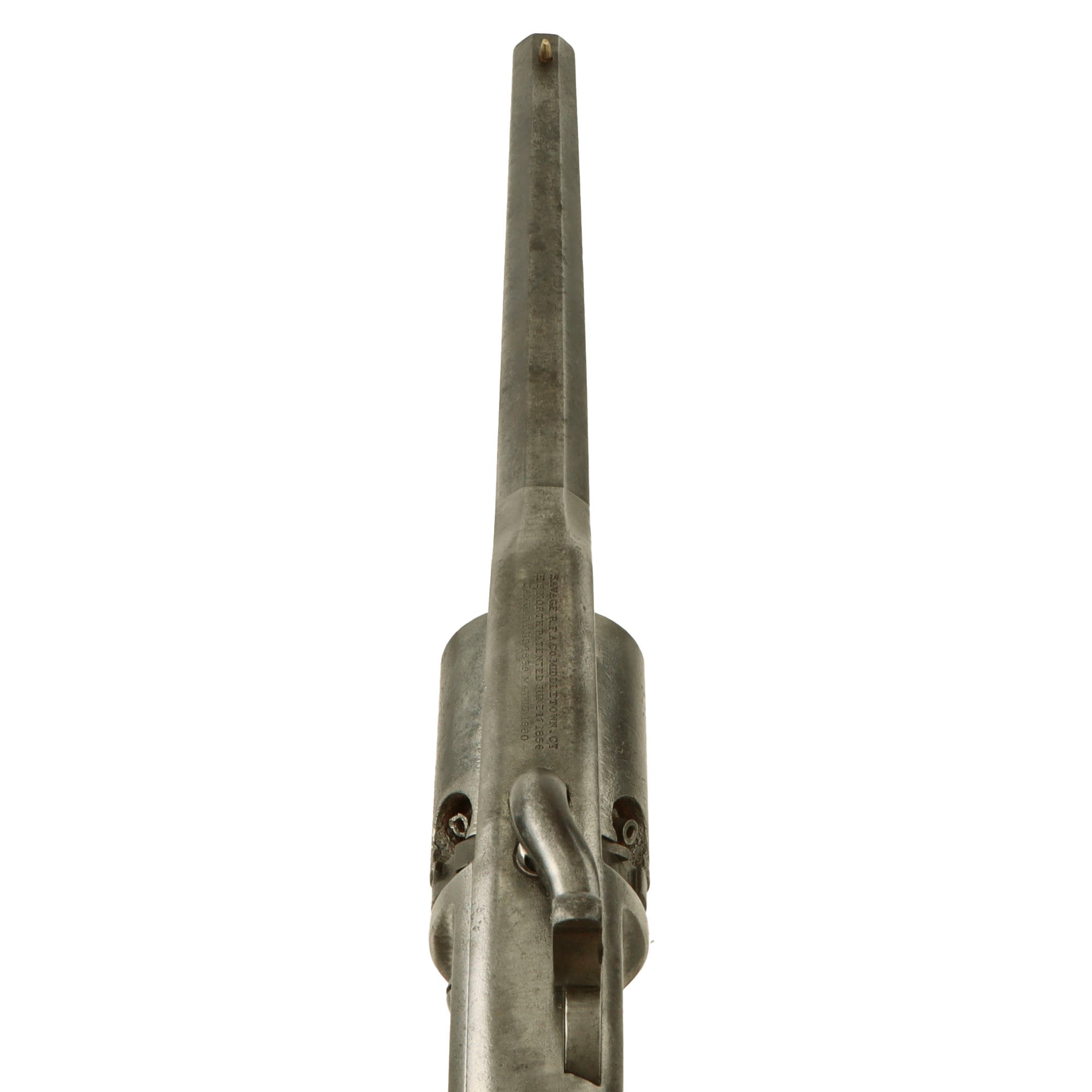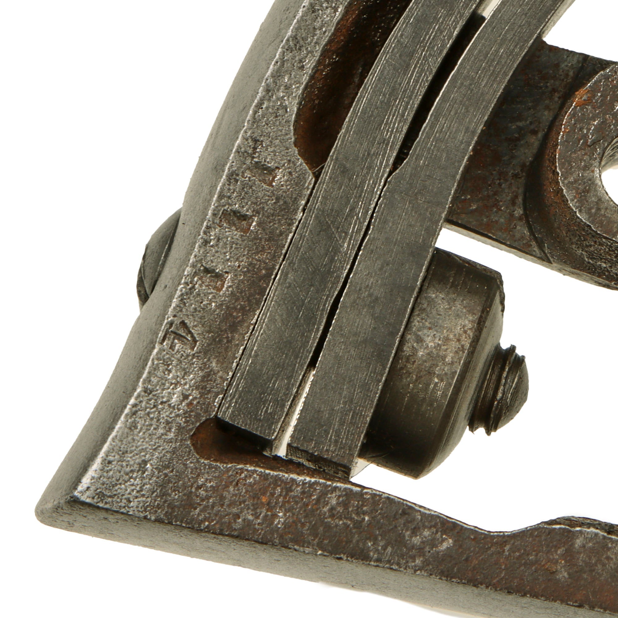 It bears the serial number 1114, which is marked on the bottom of the barrel, on the right side of the interior frame under the grips, and on the back of the cylinder under the removable ratchet. The grips look to be original, but the serial number markings are no longer visible. The revolver looks to have seen long use during the war, with the exterior worn to a matte steel patina from oxidation and cleaning to remove past peppering. It also is missing the loading lever and rammer, and the catch for it at the front of the barrel was removed as well. This definitely looks to have happened during the period, possibly when the rammer or base was damaged.