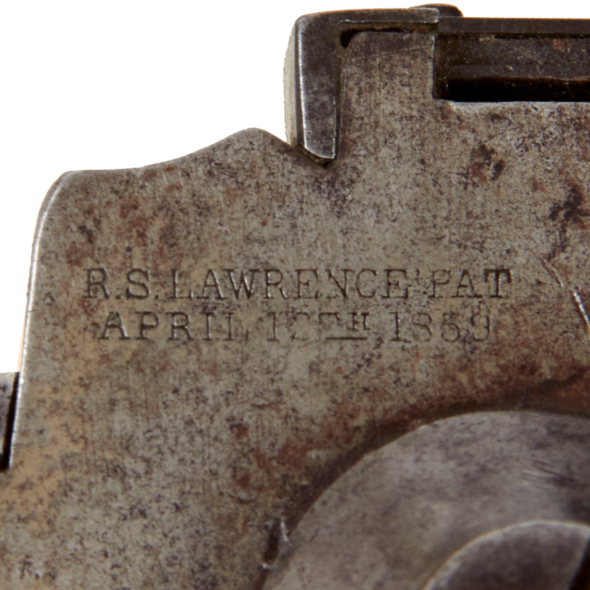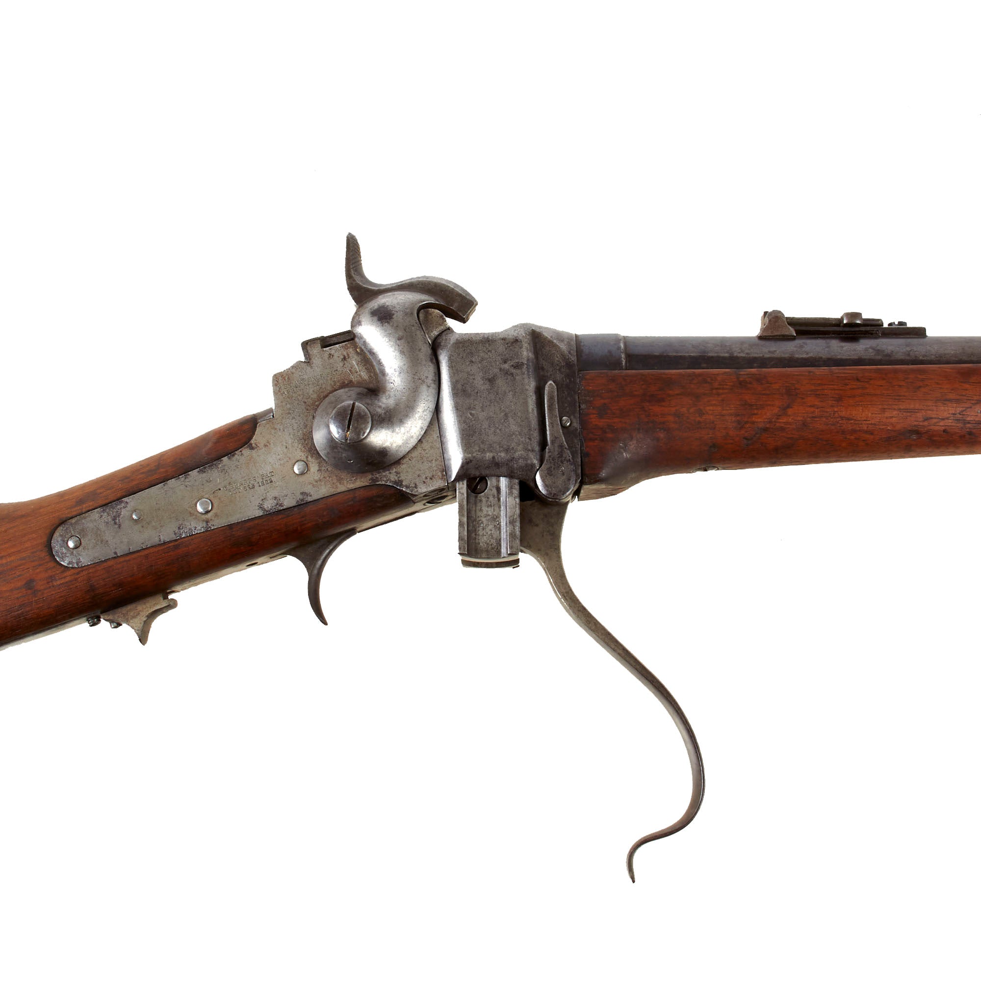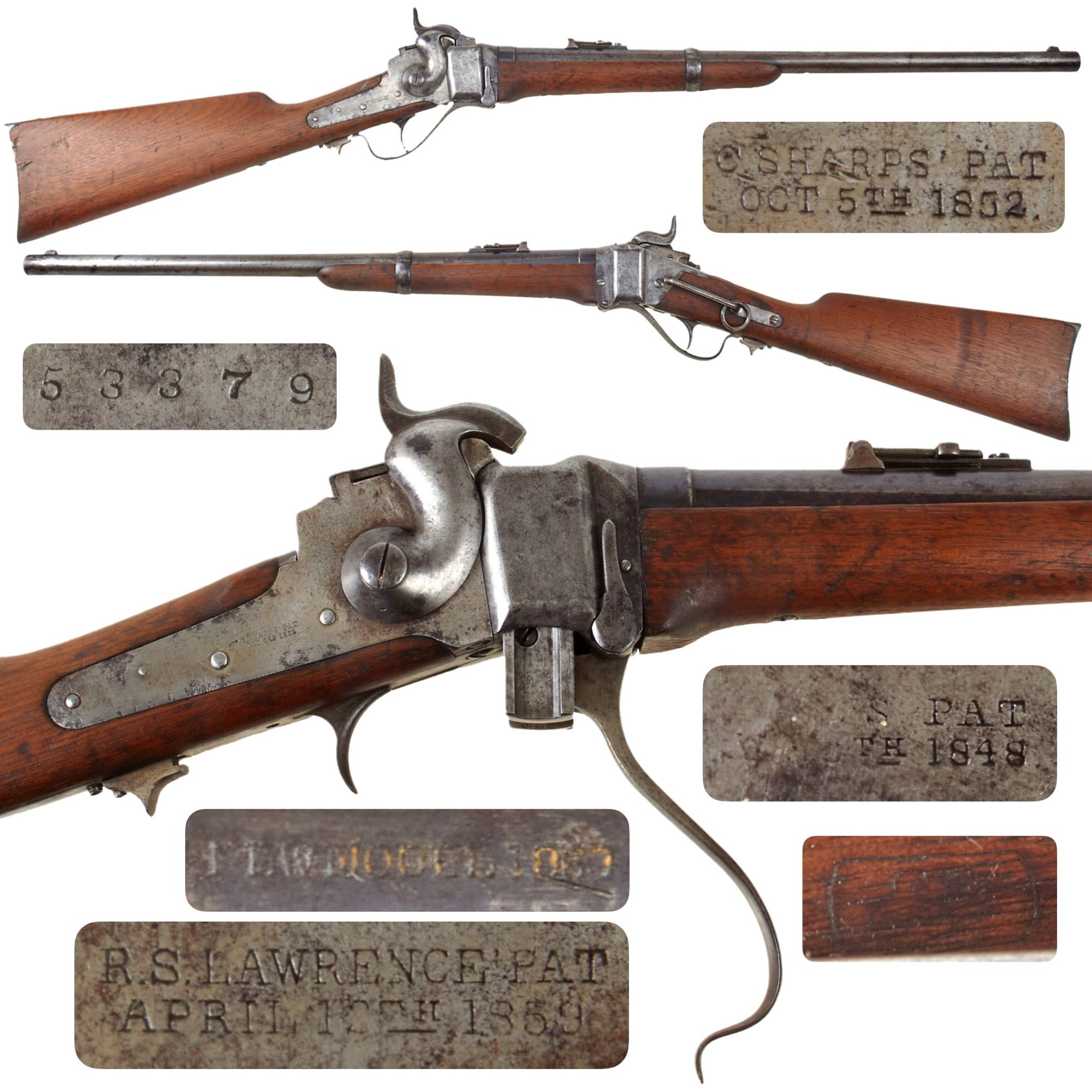 The New Model 1863's were made without patch boxes, a wartime procedure to do away with extras. It has a 21 1/2-inch barrel, measures 37 1/2 inches overall, and has a two- piece walnut stock. The barrel and, on some, the buttplate were blued. The frame, lock, and barrel band were casehardened in mottled colors. The fact that the Confederates manufactured copies of the Sharps carbine in Richmond, Virginia, in quantity testifies to its general popularity. This carbine was based on Christian Sharps' patents of 1848 and 1852 and on Richard S. Lawrence's patents of 1859.