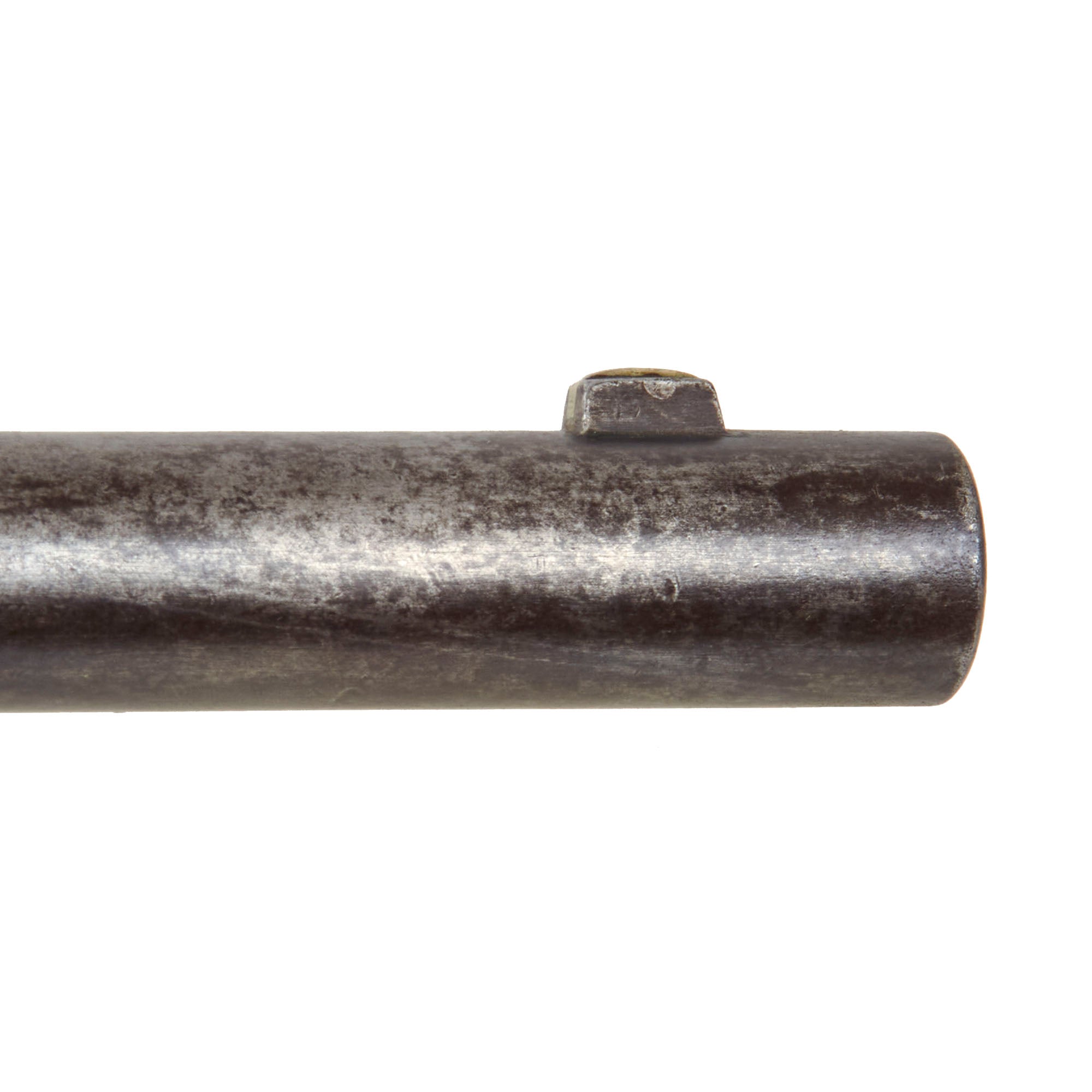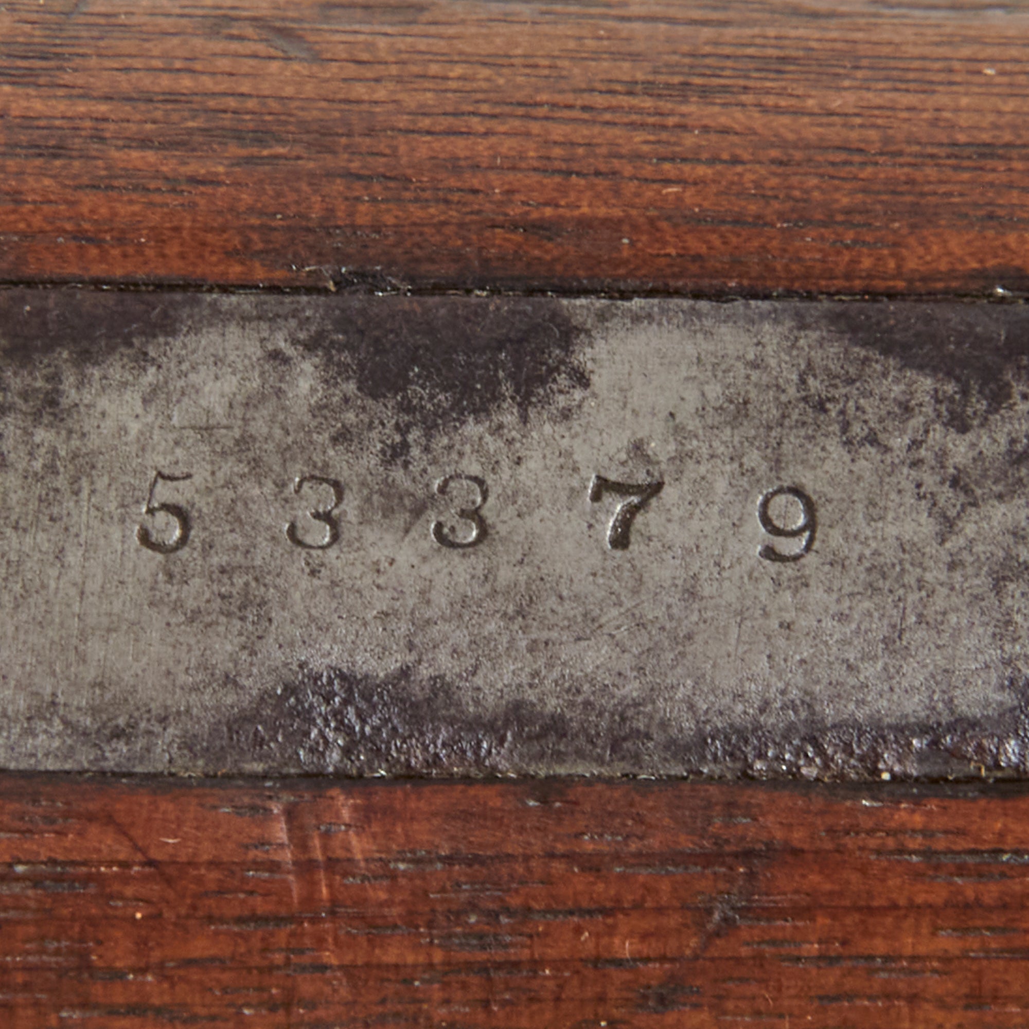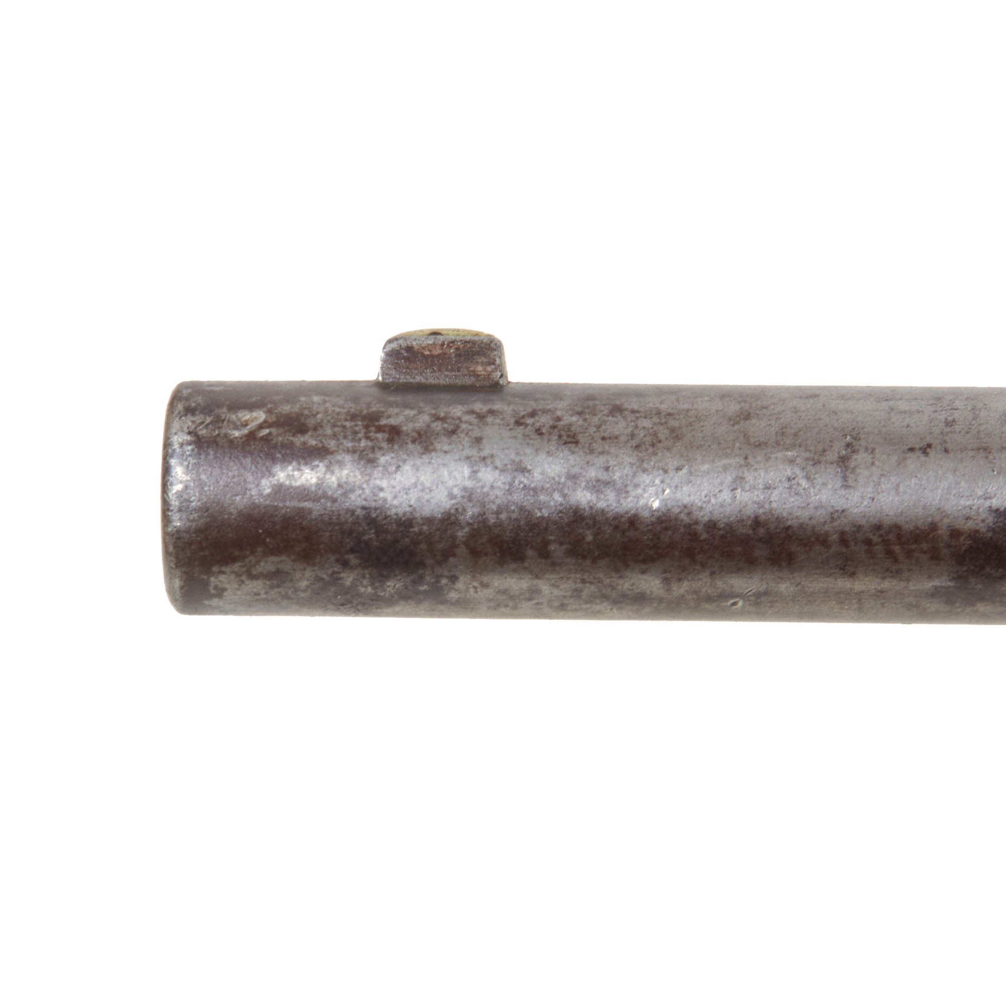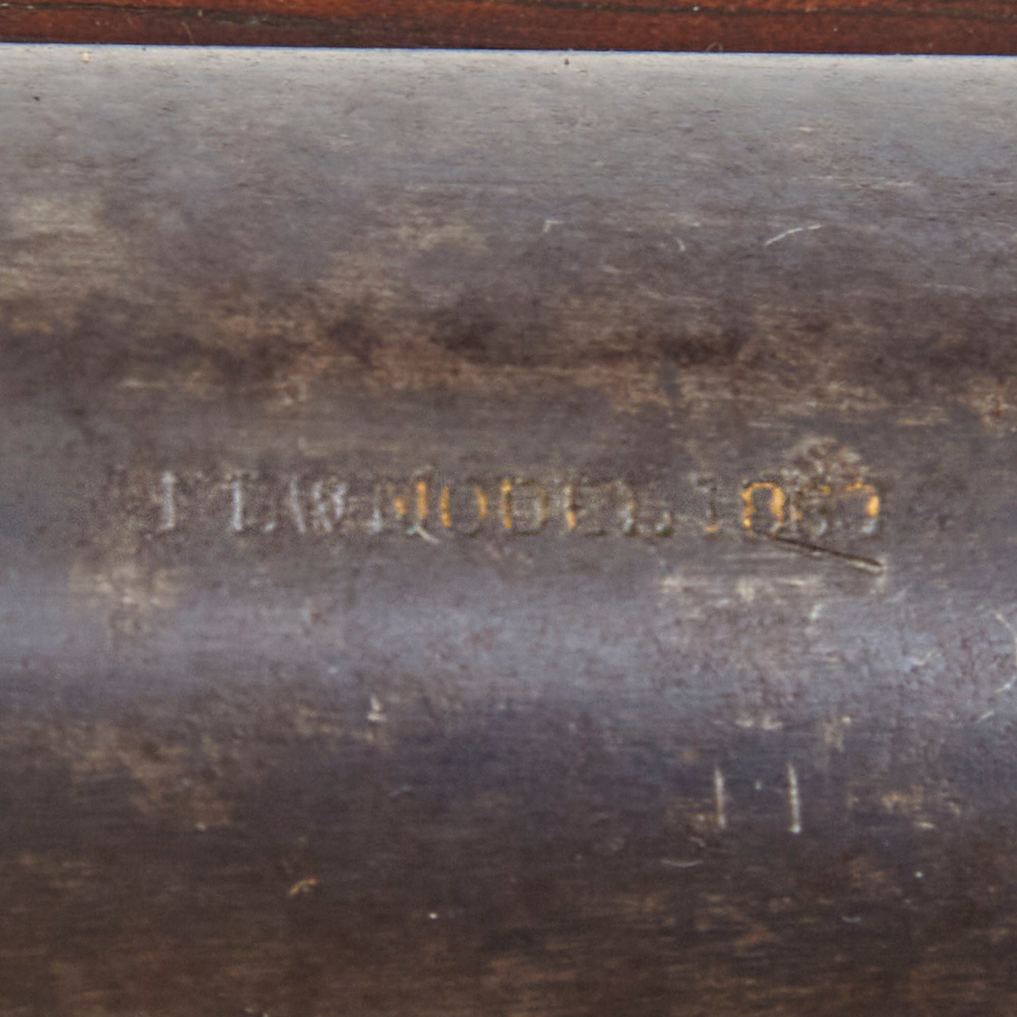 There were approximately 45,000 of this model made during the 1860-1863 period, serial numbers 30000 to 75000. This example has a serial number about 1/3 of the way through production, so it is probably in mid 1861. We checked under the barrel, and the original serial number is worn, but looks to be 813730, and there is also a clear 34 stamp from the conversion. The left side of the barrel by the breech is marked T.W.R., the initials of Civil War Era inspector Thomas W. Russell.