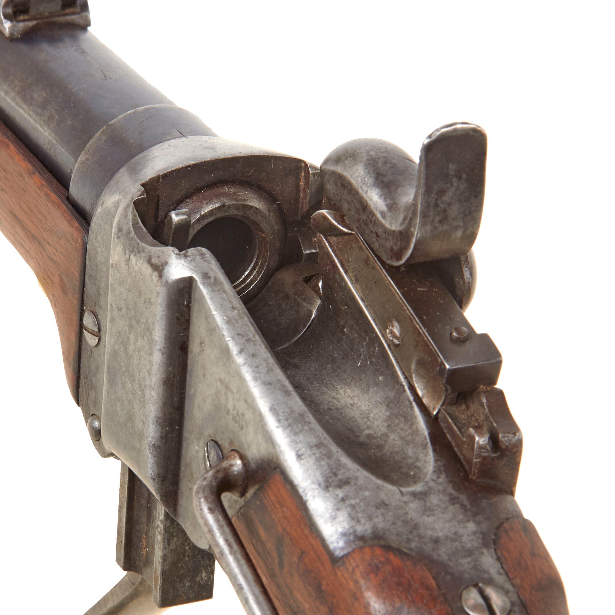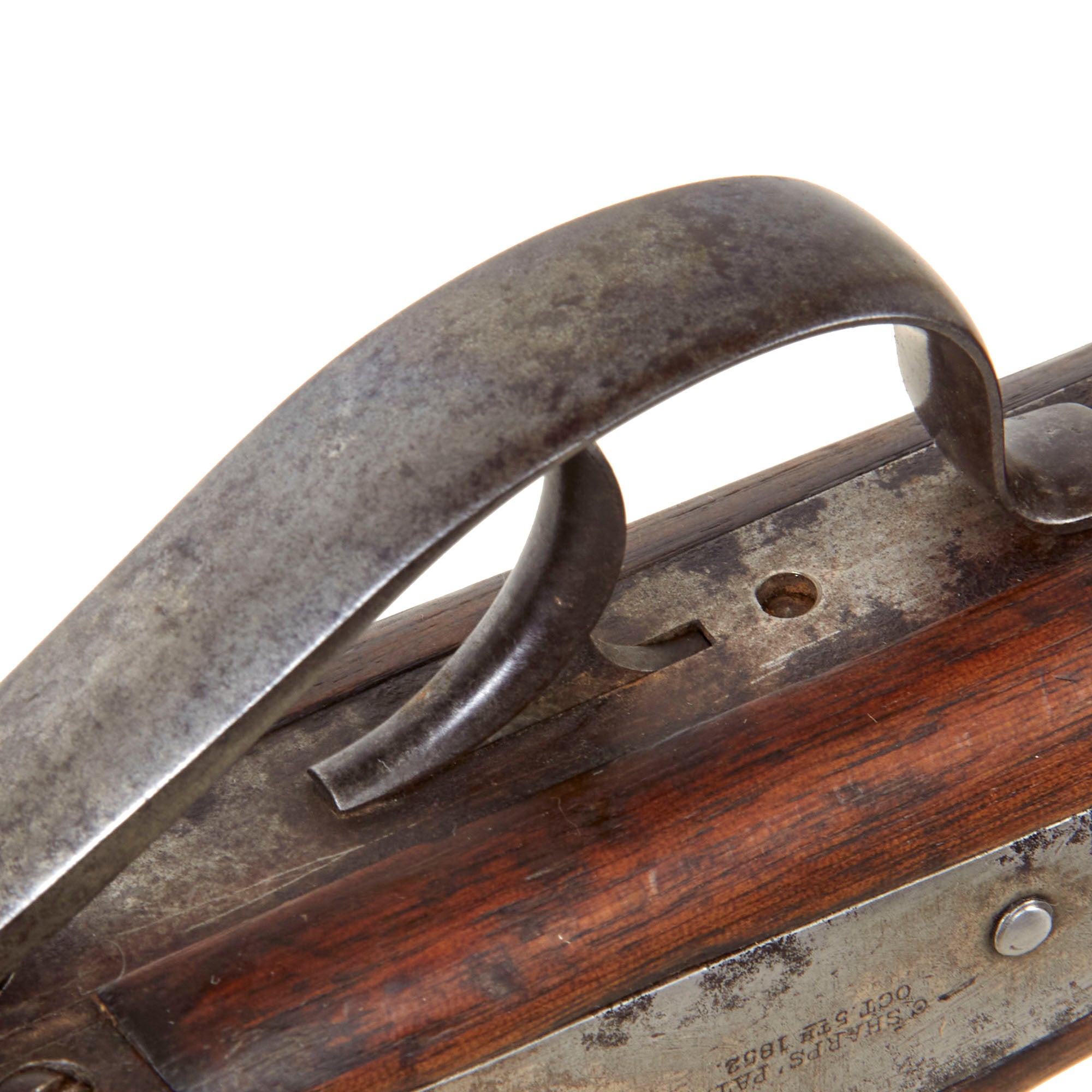 Original Item: Only One Available. This is a lovely service used example of an original New Model 1859 Military Vertical Breech Carbine, converted to .50-70 Government caliber, serial number 53379. This features a later version of the Sharps action with an improved gas seal and vertical breech. It looks to have seen a good amount of service after being converted, and the action shows wear and past oxidation, now cleaned away. The barrel still shows a good amount of the bluing near the rear sight, but is worn elsewhere. The stocks also show a good amount of use, but not abuse, and have a great honest used look, with some intact cartouches. The bore is in very good condition, but definitely has some past fouling and oxidation from lack of cleaning.