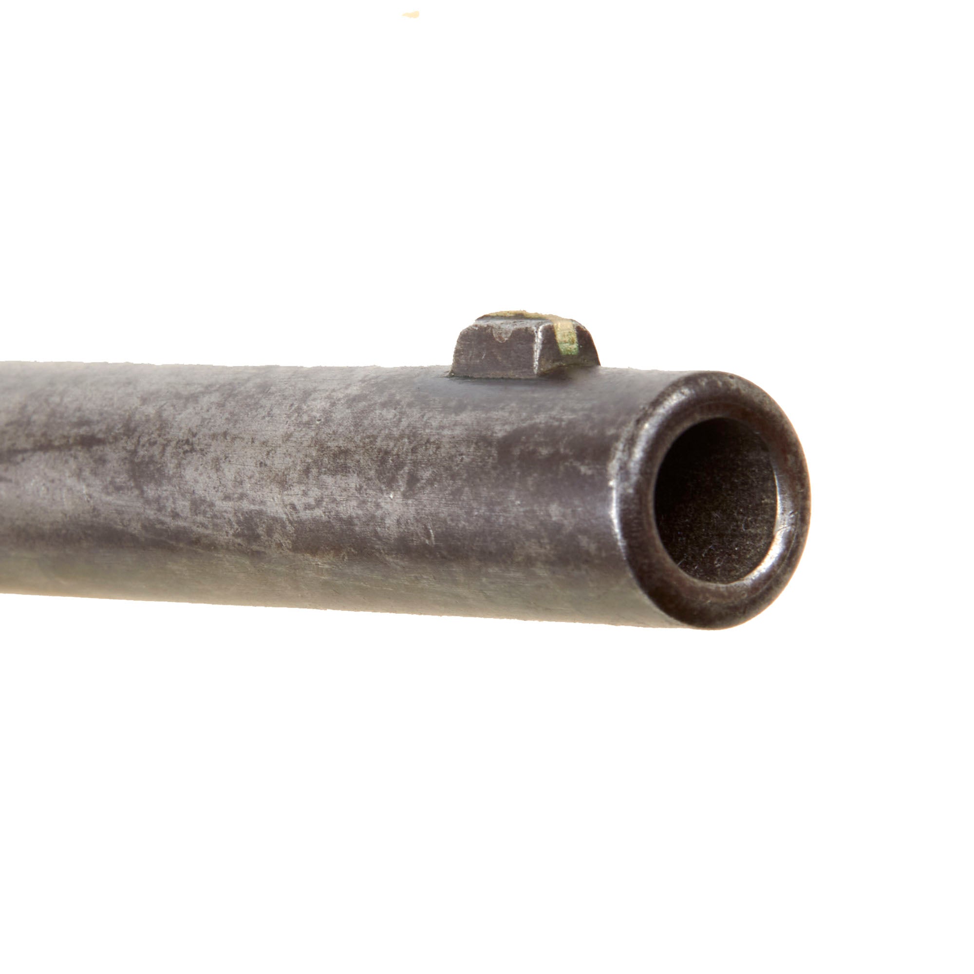 The falling block action lent itself to conversion to the new metallic cartridges developed in the late 1860s, so many were converted in the late 1860s and were used during the Indian Wars in the decades immediately following the Civil War, such as this one was. During this time parts were often swapped or omitted, and the barrel on this example definitely was, as it is from a M1863 carbine, which was aside from the butt stock mostly identical to the M1859. During the process the barrel had to be removed and bored out so that a new .50-70 lining and chamber could be fitted and sweated into place. Close examination of the muzzle on this example shows the faint brazing seam.