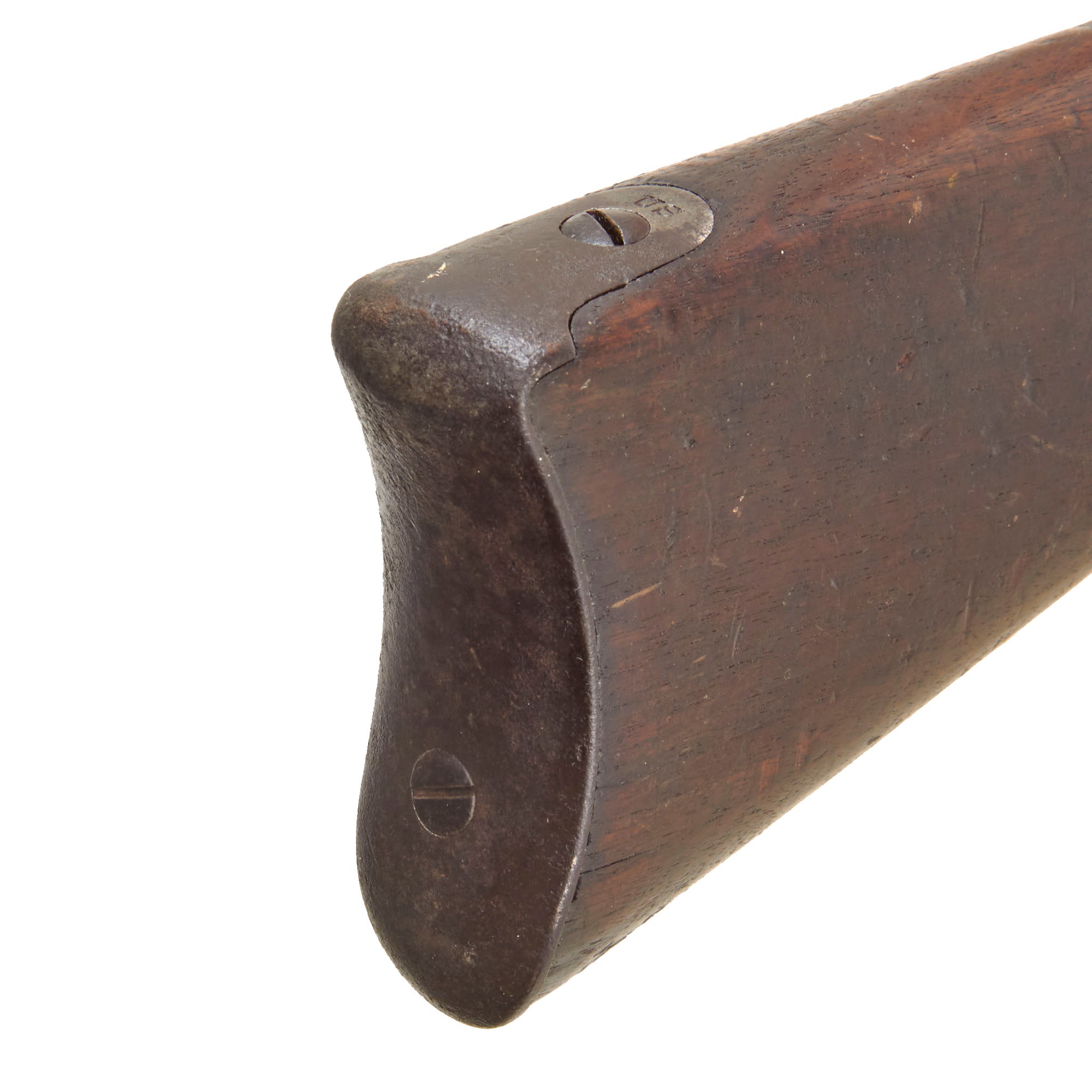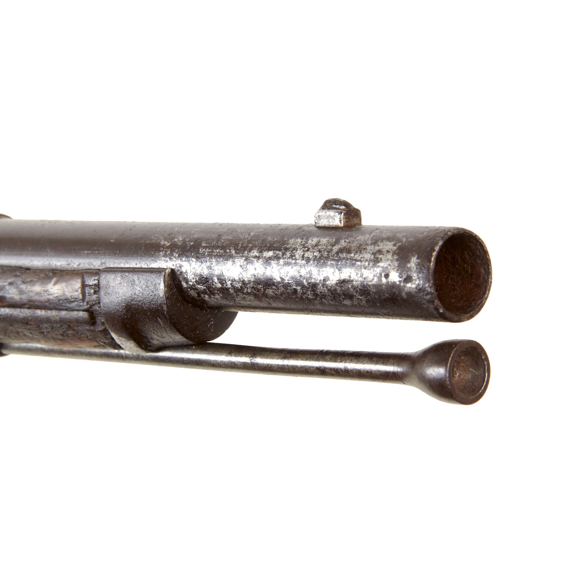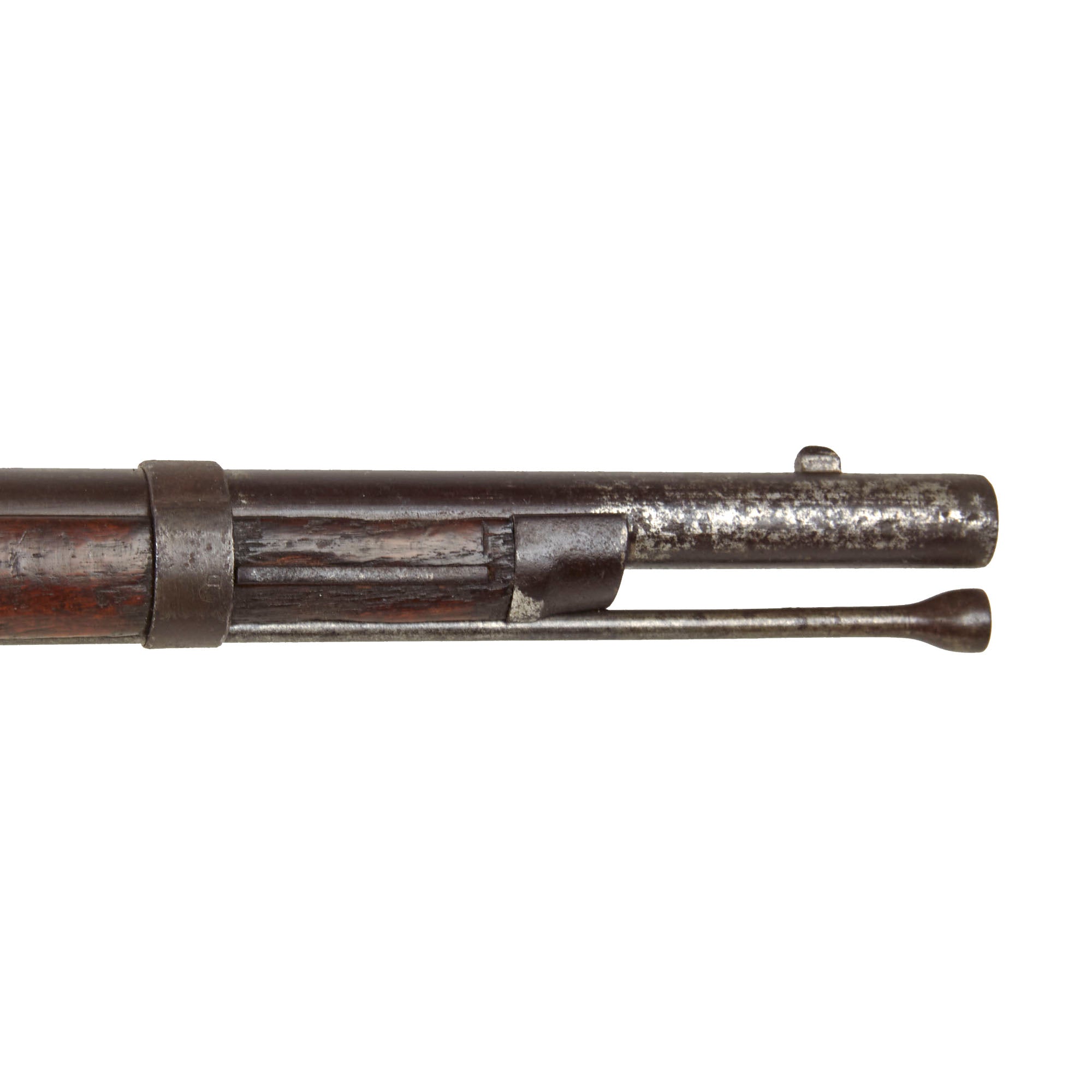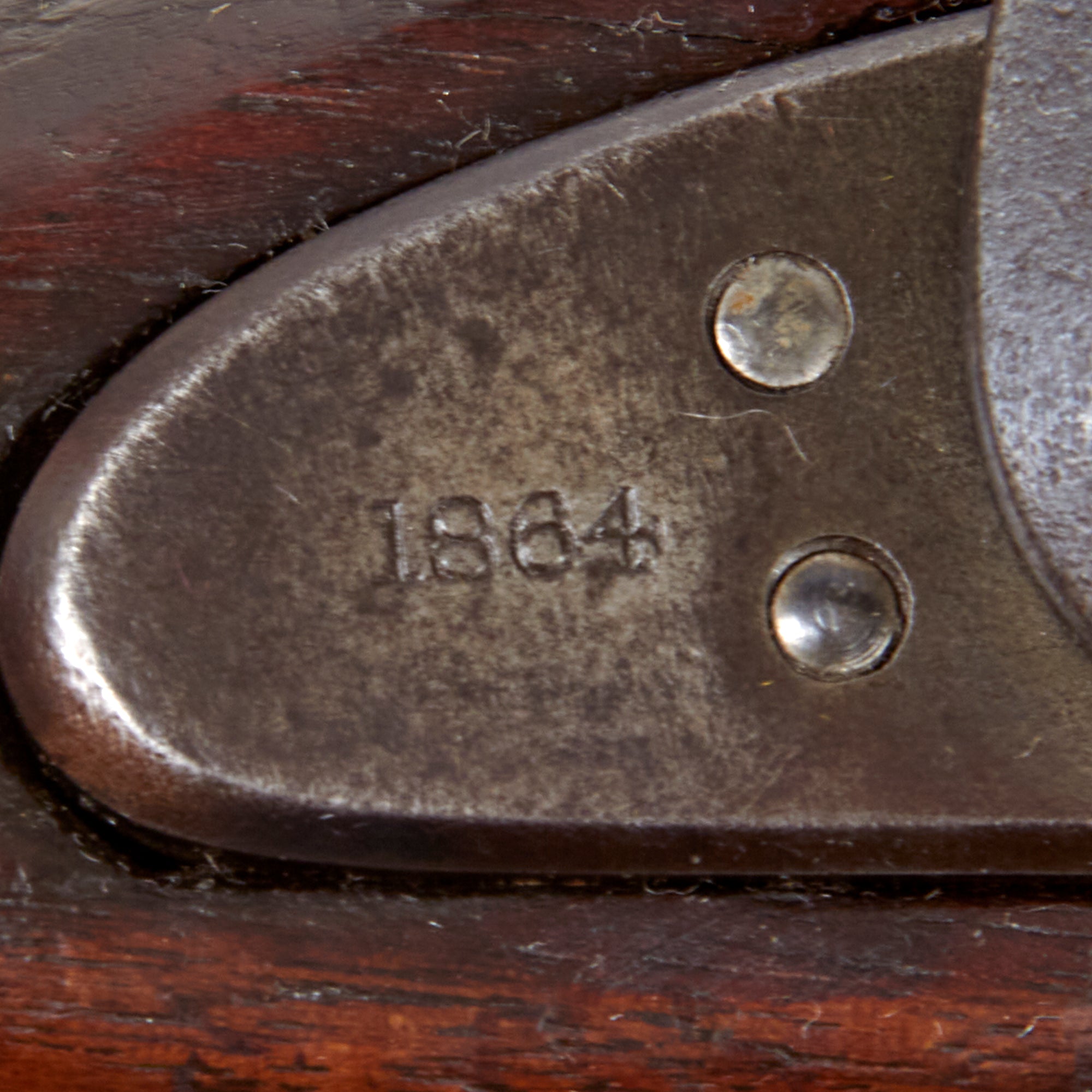 The gun has a two-leaf rear sight such as found on the Model 1863 Type II, so it's possible that it was replaced during the war, as it shows less oxidation than the barrel around it. Both sling swivels are intact, and move freely, and the ramrod under the barrel does not have an enlarged shank, but does look to be a period original.