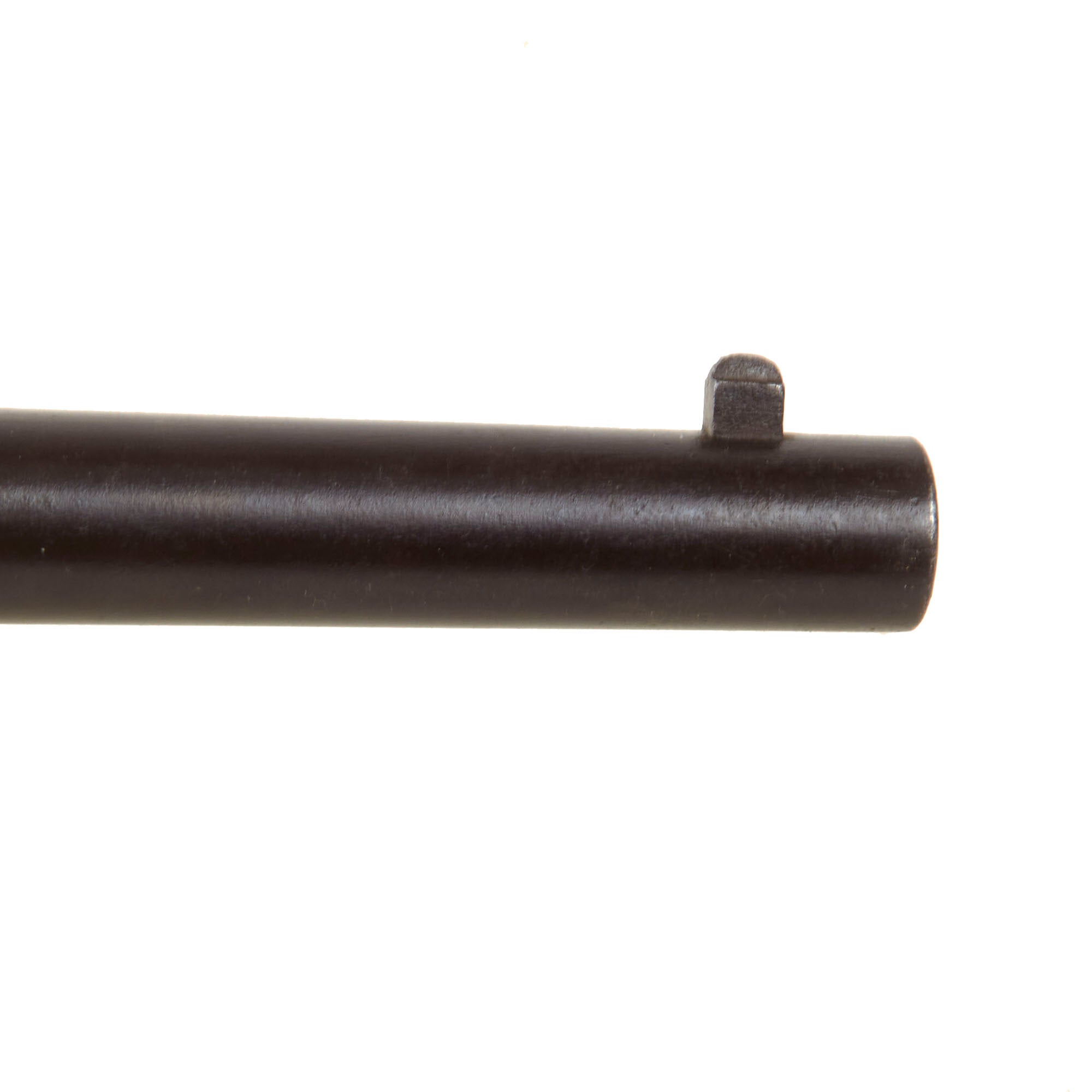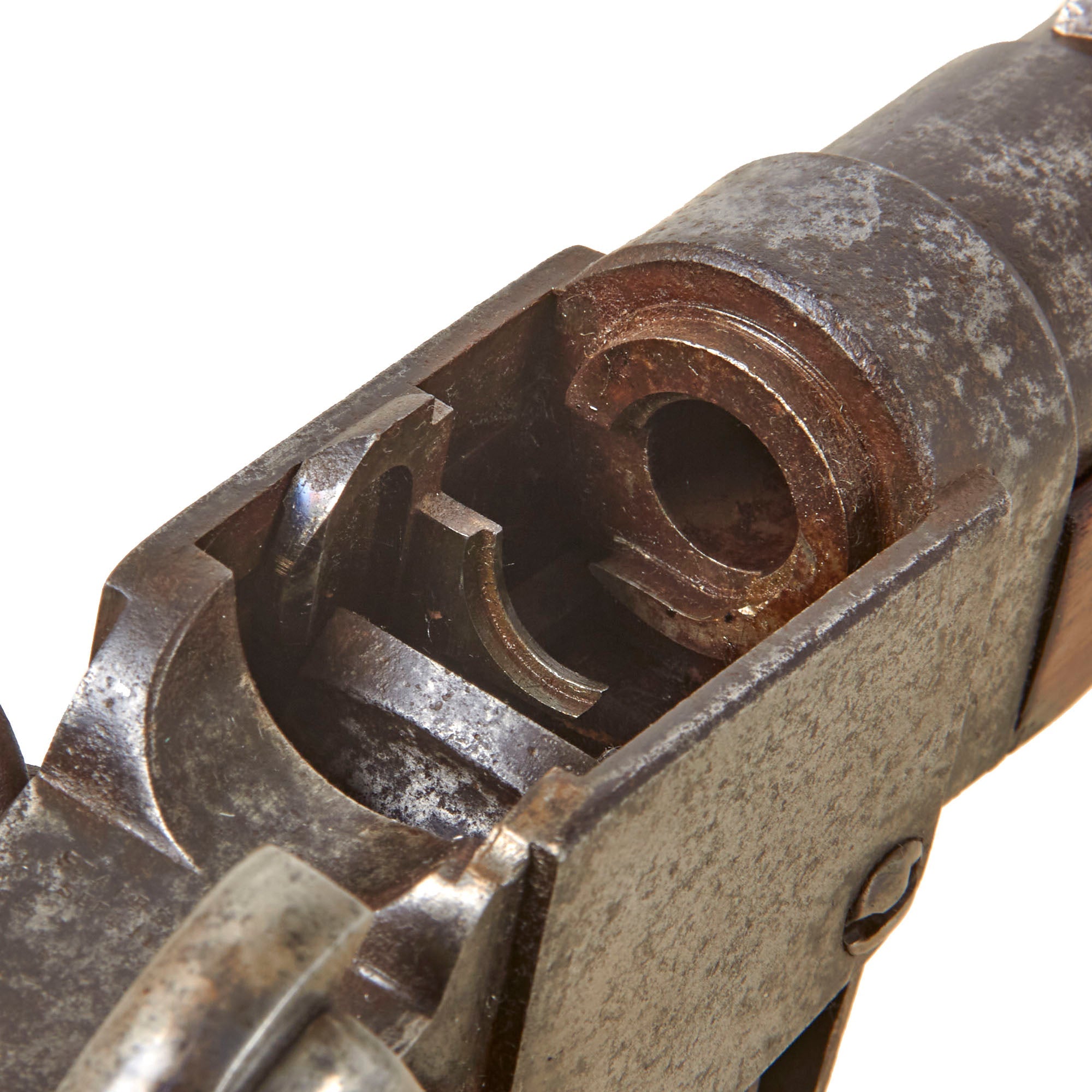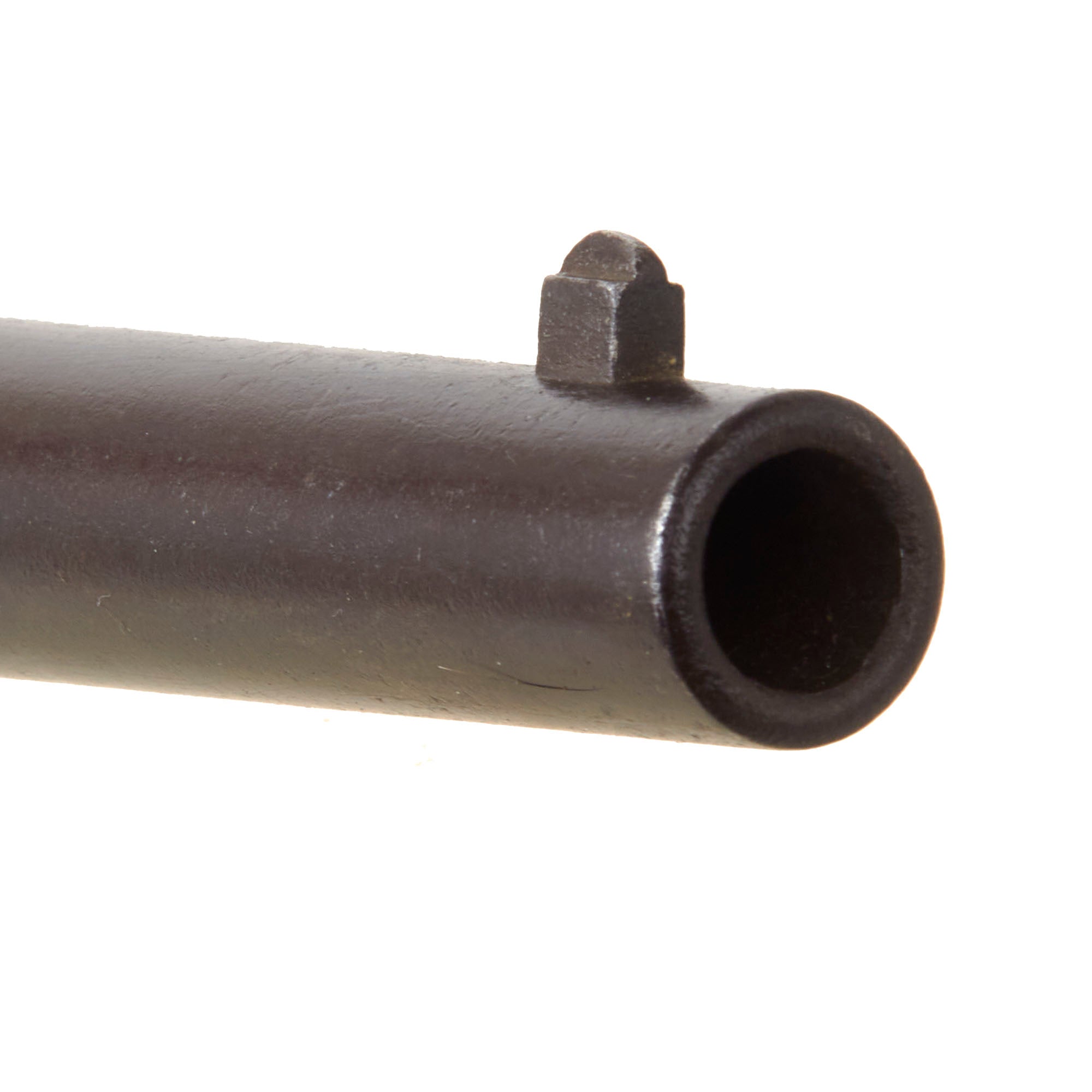 The actions function correctly and move relatively smoothly, though it can be a bit finicky due to wear. The rimfire firing pin is still present and moves correctly, though it is definitely sluggish, and the pin on the rear breech does not move as easily. The cartridge ejector in the receiver moves correctly, though we have not had the opportunity to test it on real brass. The bore in the 21" barrel is in very good condition with a mostly bright finish showing crisp lands and grooves. There is some past oxidation and wear, now cleaned away, typical for this age firearm.