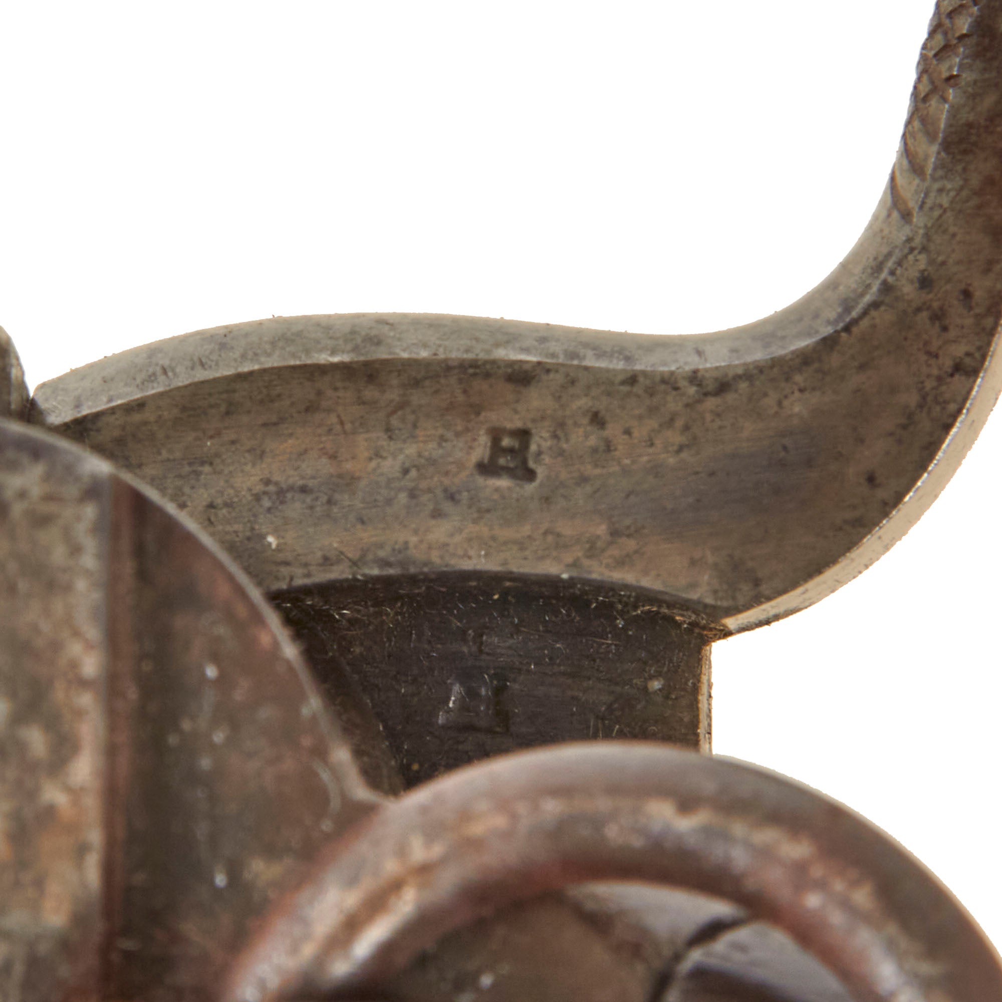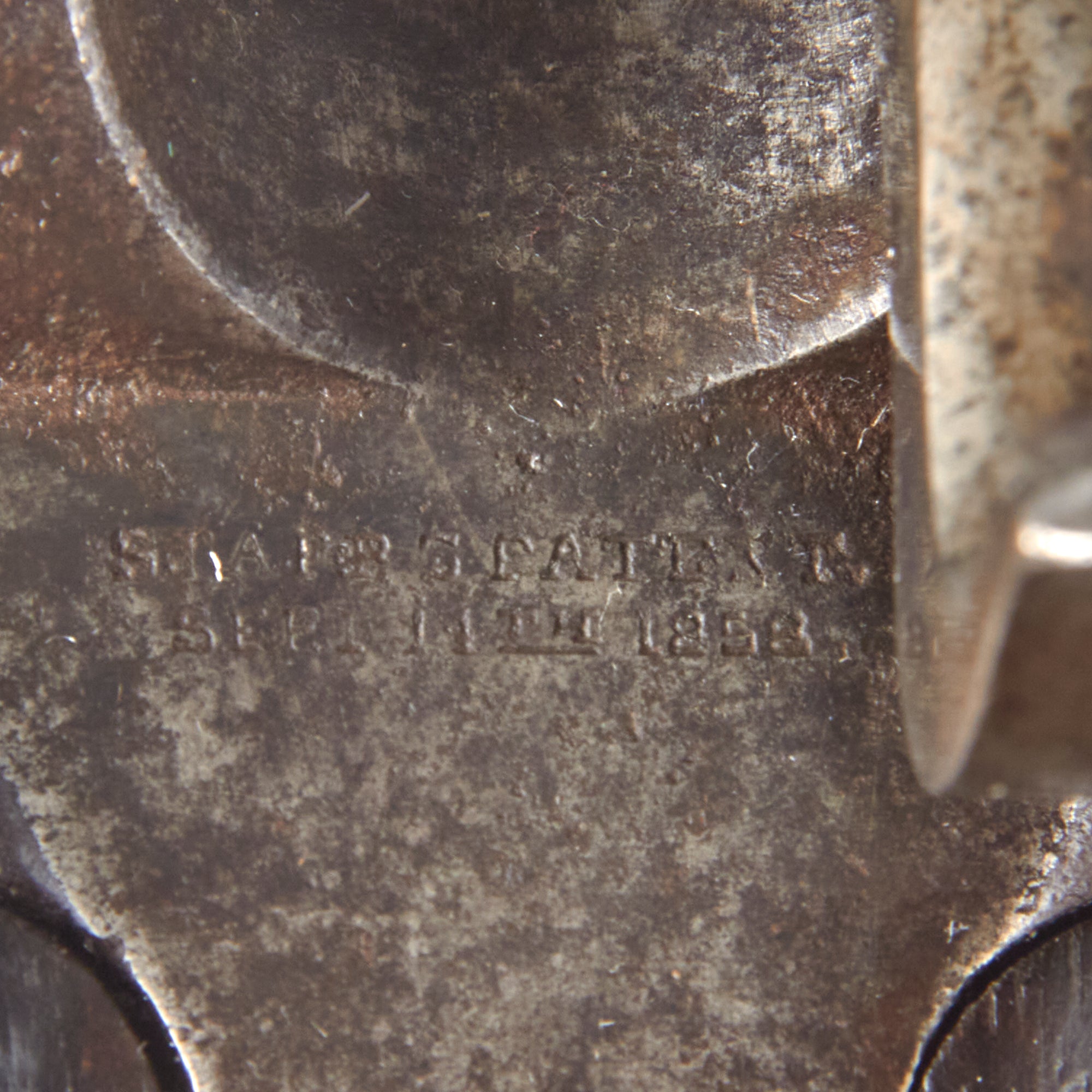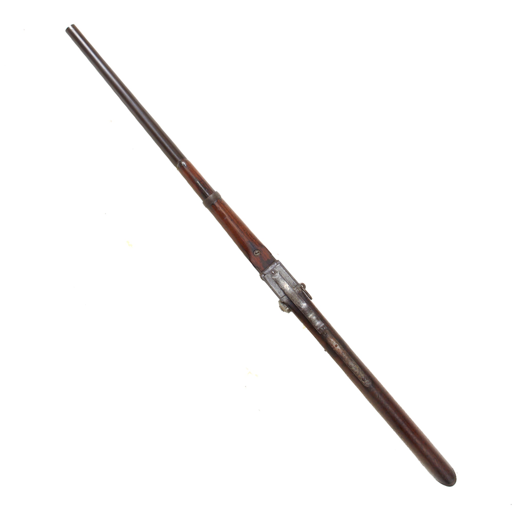 This example is offered in very good service used condition, looking to have seen long use during the war and probably during the "Indian Wars" following. The barrel is faded to a dark peppery patina, with some of the original finish preserved under the fore stock, while the receiver is a mottled steel color. The lock plate shows much less oxidation due to the different alloy used. The stocks have a lovely red brown color with a great oiled finish, only achieved after many years. The fore stock shows some cracking and repairs from use, while the butt stock shows wear on the left side, which looks to be from saddle wear, indicated by the dark worn line. We can see two very faint "boxed" inspection cartouches, however we are not able to identify them.