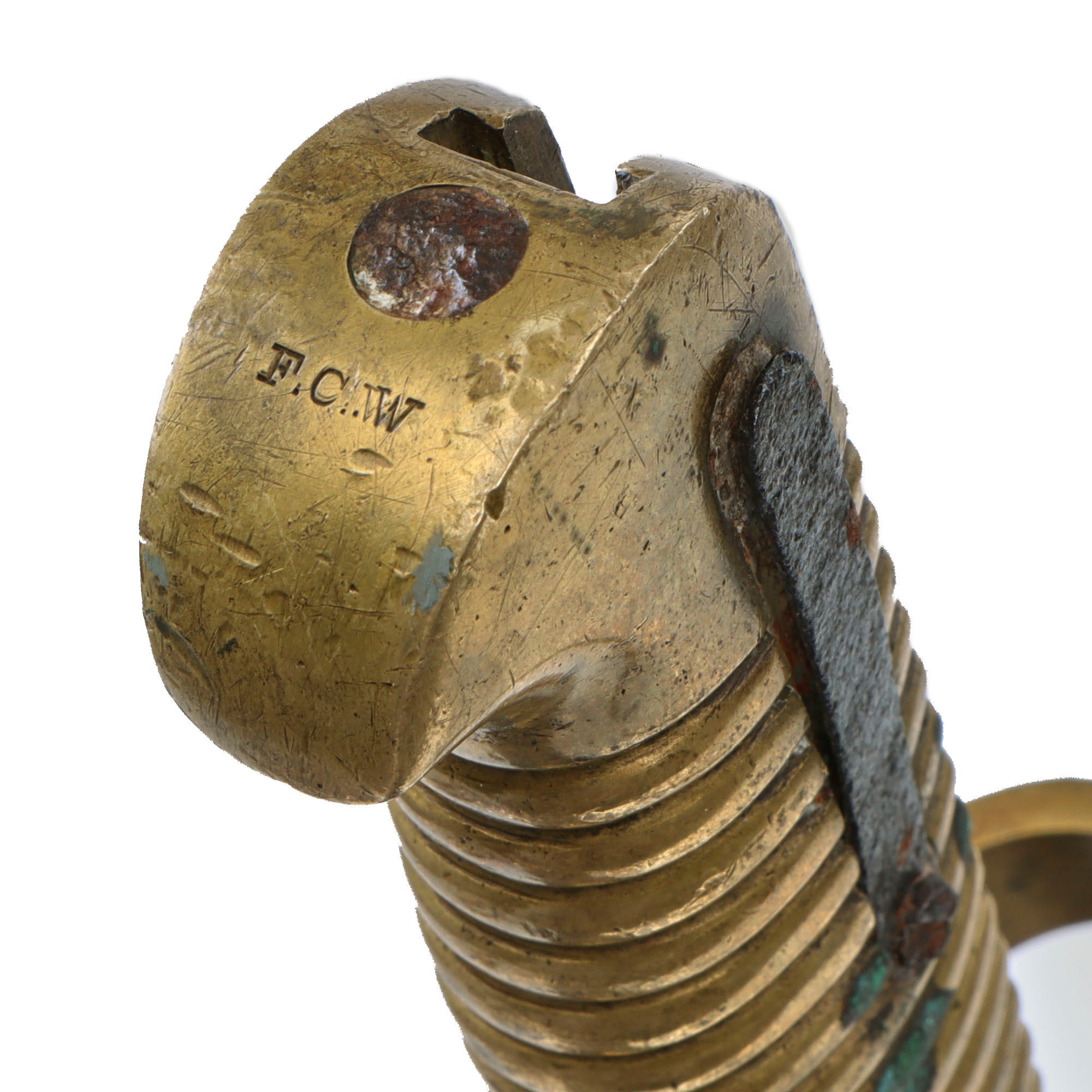The bayonet is now heavily worn, and it doesn’t look like the bayonet would fit onto a rifle anymore given the oxidation of the button and bar. The pommel is stamped with F.C.W., denoting the navy inspector’s initials of Franklin C. Warner. These bayonets were mated to the rifles by serial number stamped next to the long guide stud groove. This one is numbered 5718, which puts its delivery very early in 1864 (some 5300 had been delivered by the end of 1863 and 1,000 in January 1864.)