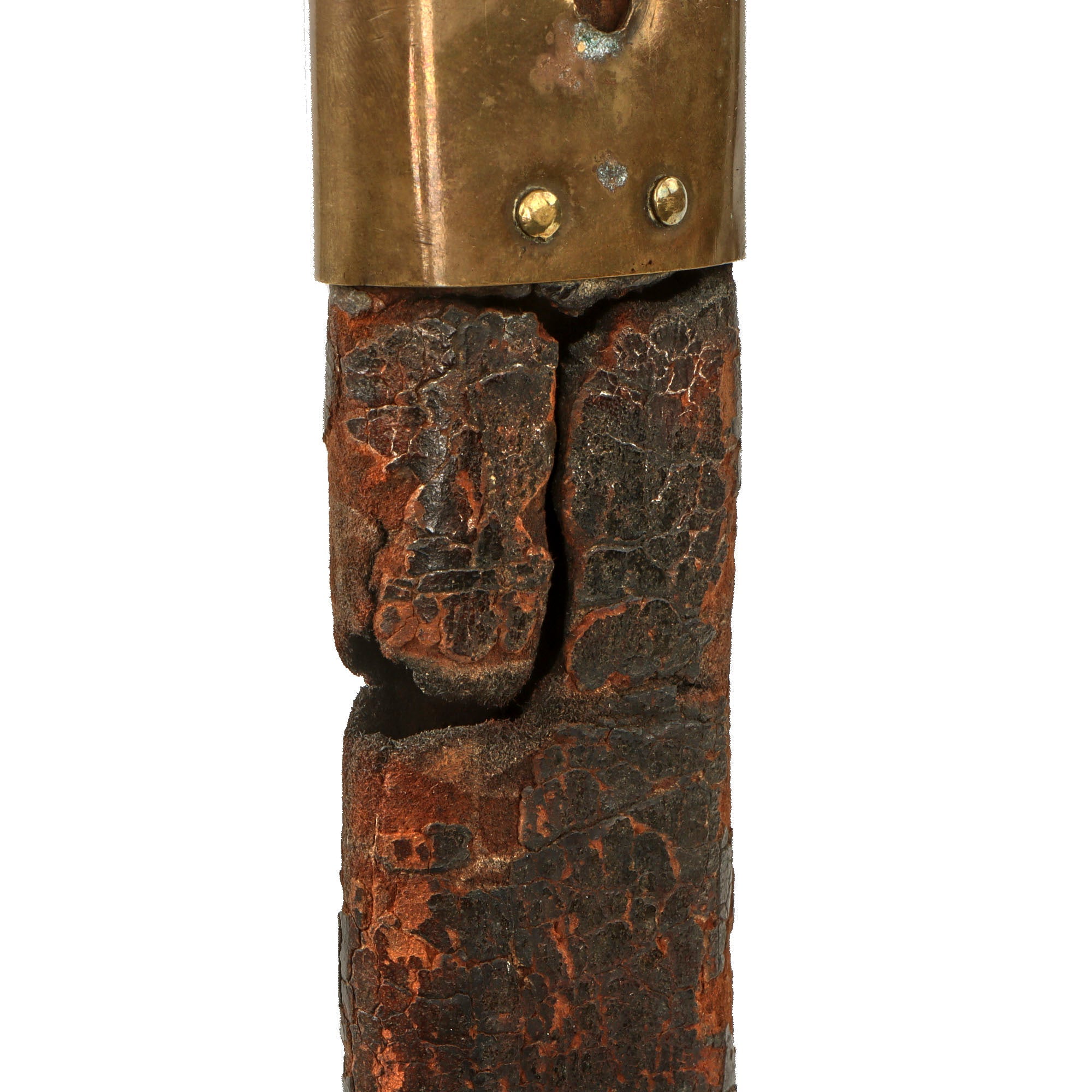 The leather scabbard shows extreme wear and material loss, with the stitching almost entirely gone and the leather now extremely weak, cracking, and falling apart. The brass drag is gone, and the brass throat is missing the frog button. It is a fair example for display, but please exercise caution.