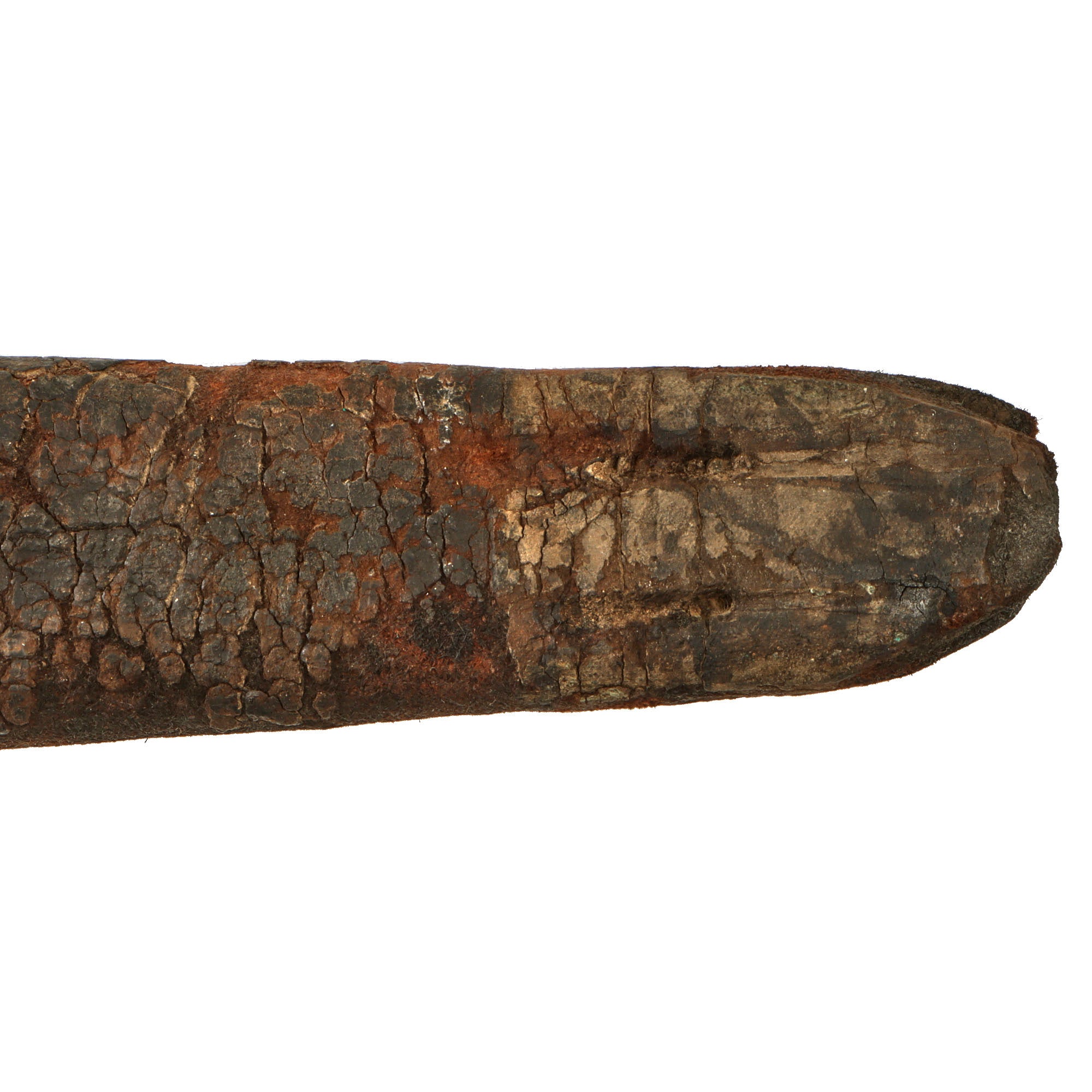 The 22 ½” single-edged blade has a slight curve and a thick, flat spine that ends in a 140mm double-edged spear point. The blade is in fair condition, with heavy oxidation and wear across that has . The hilt is marked with serial number 5718 next to the channel. There is extreme wear to the ricasso, and the only word we could make out was HARTFORD, so the original markings would have read: