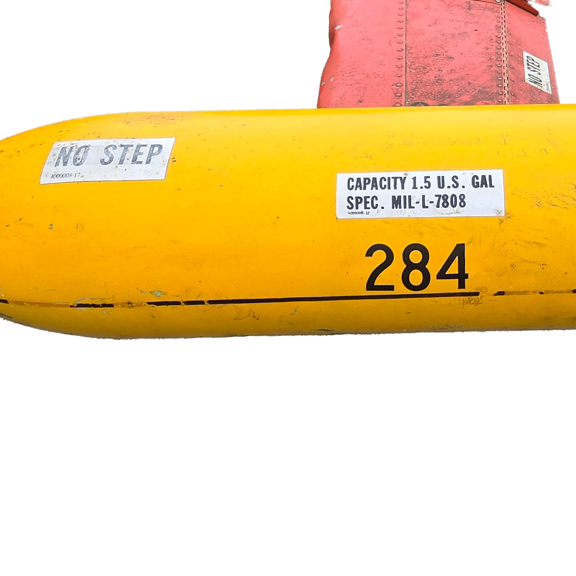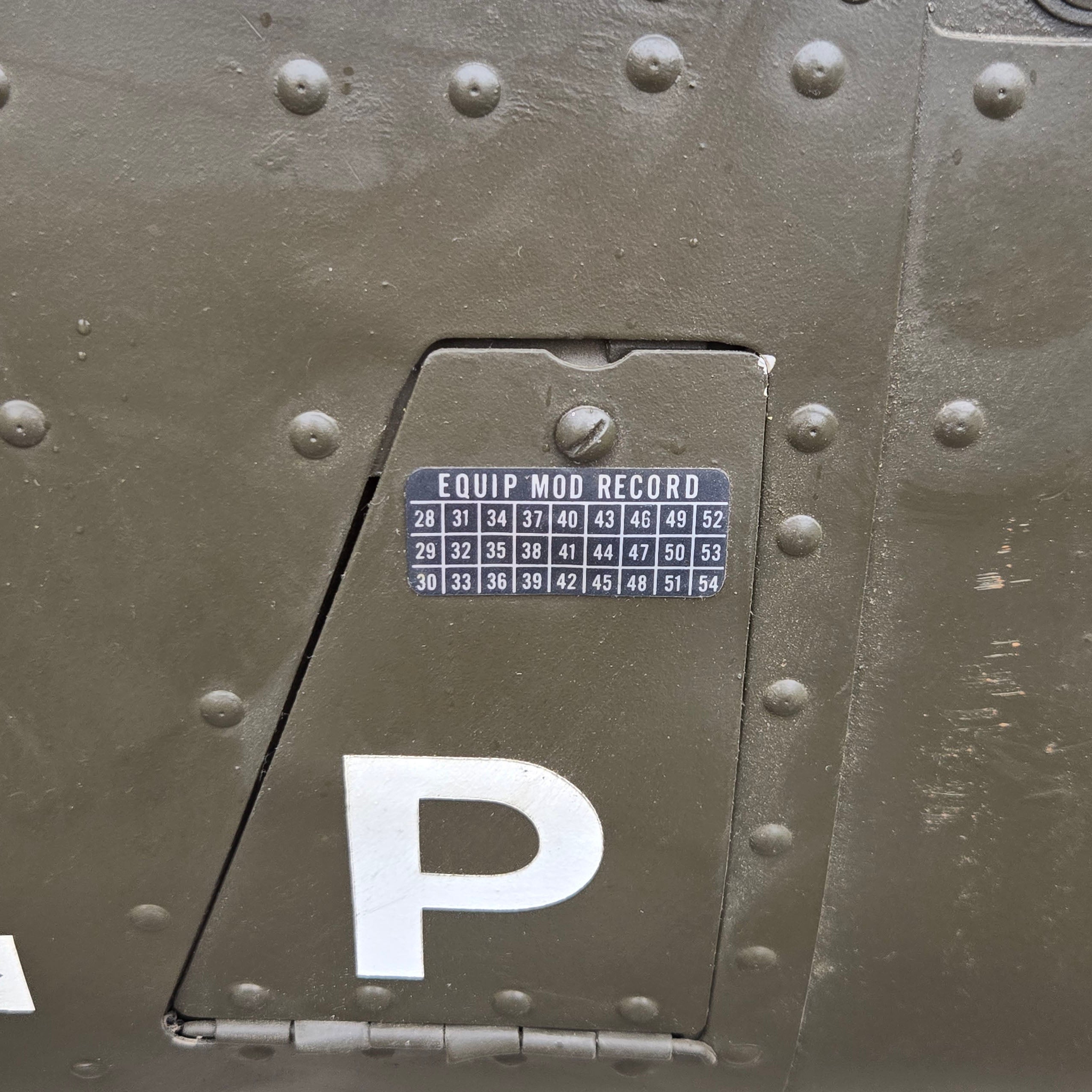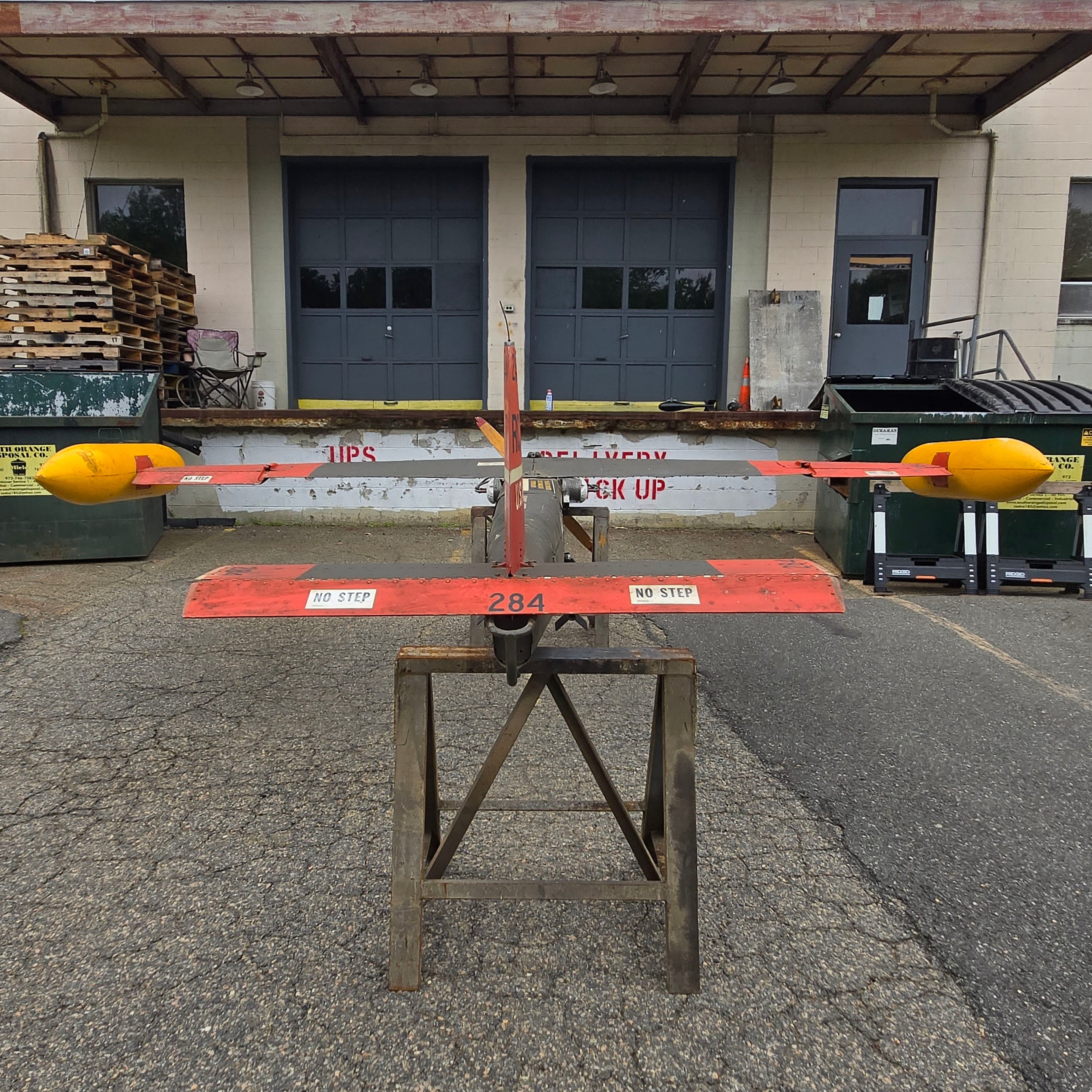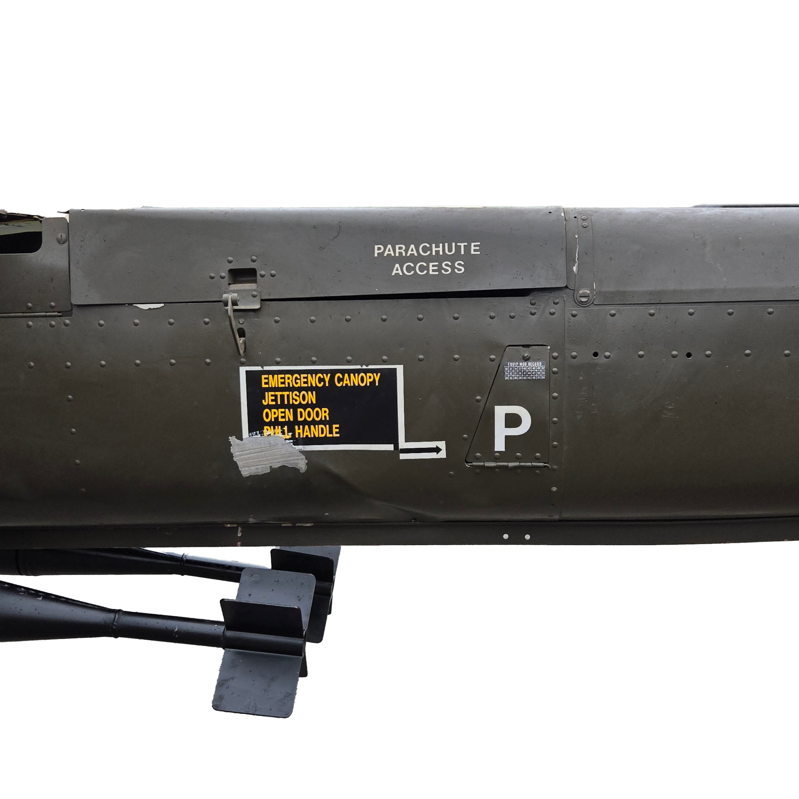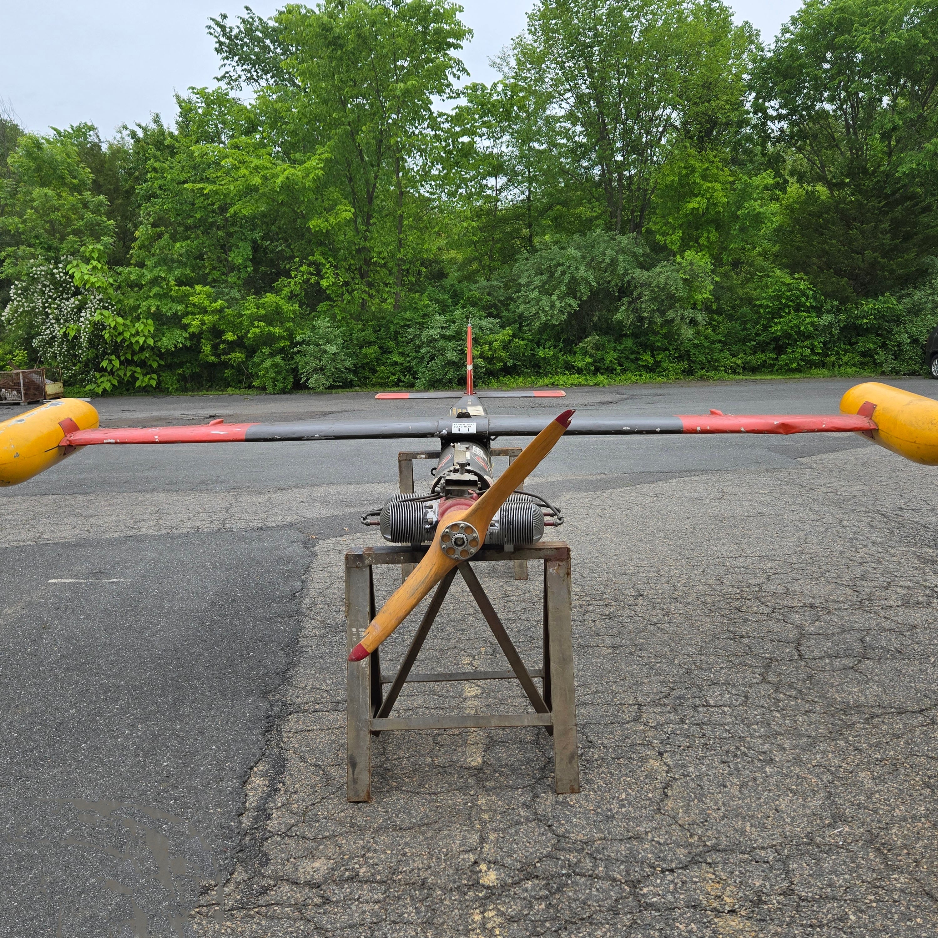 The drone measures 144” long, with the tail section measuring 50 x 13 x 18”. The front propeller has a span of 44”, and the wingspan is roughly 161”. The propeller is in rough shape with heaving cracking at both ends. It is ink-stamped SENSENICH CORP. The original McCulloch O-100-1 Engine retains its data tag, but it has been painted over. We could make out the Model, O-100-1, and the Model Spec, 4318, but not much else. The side of the drone retains decal information: