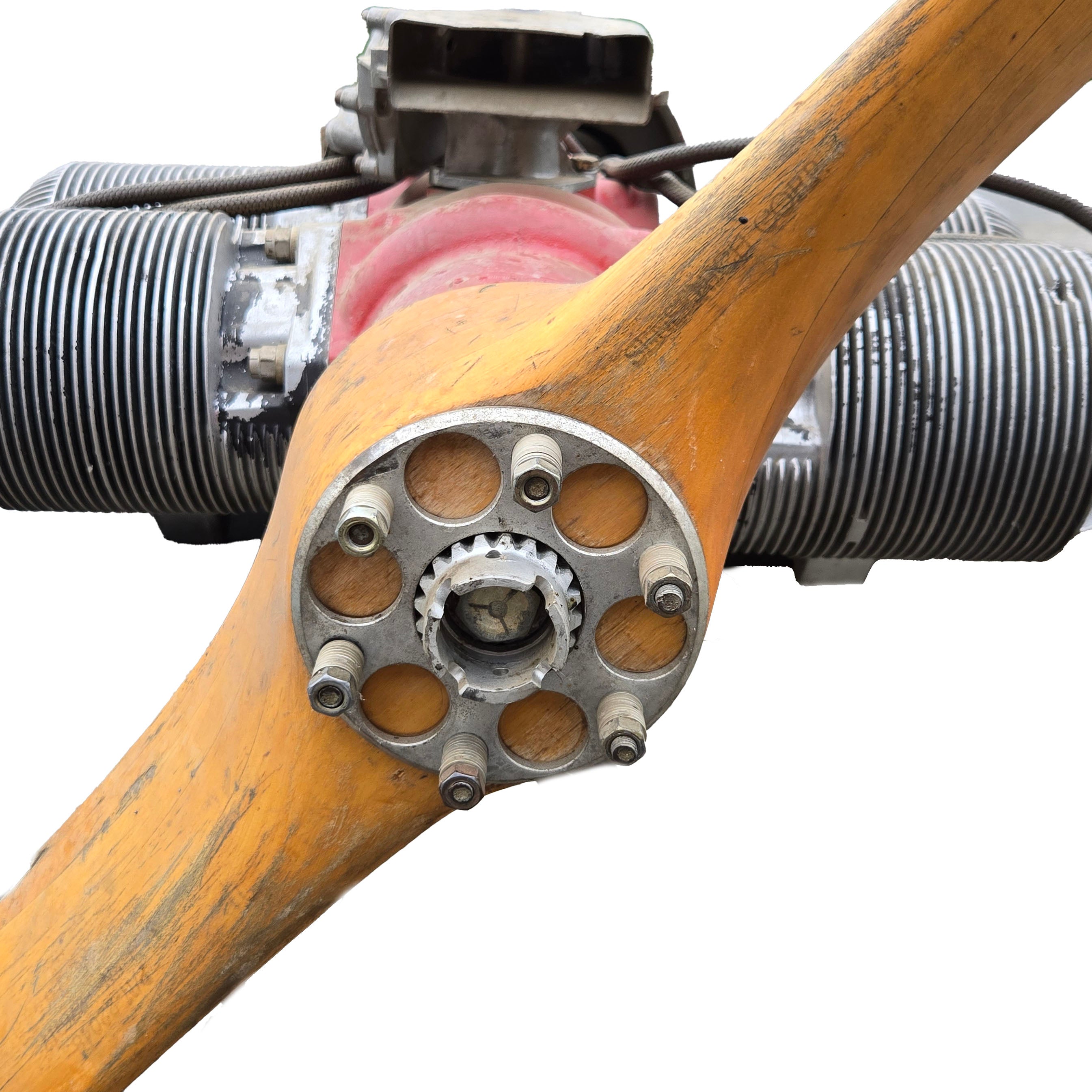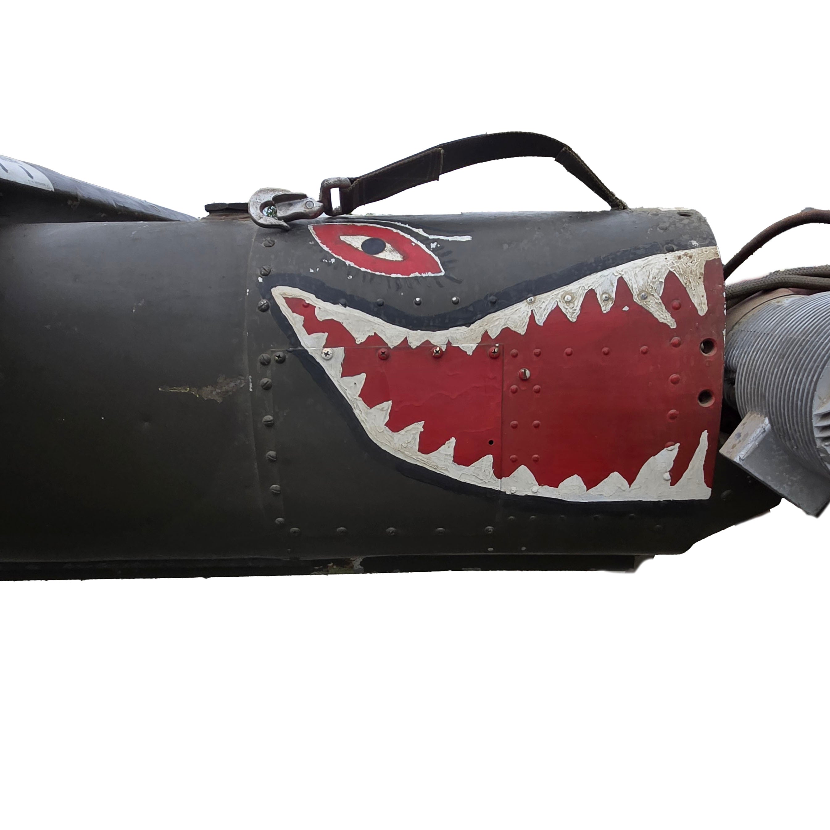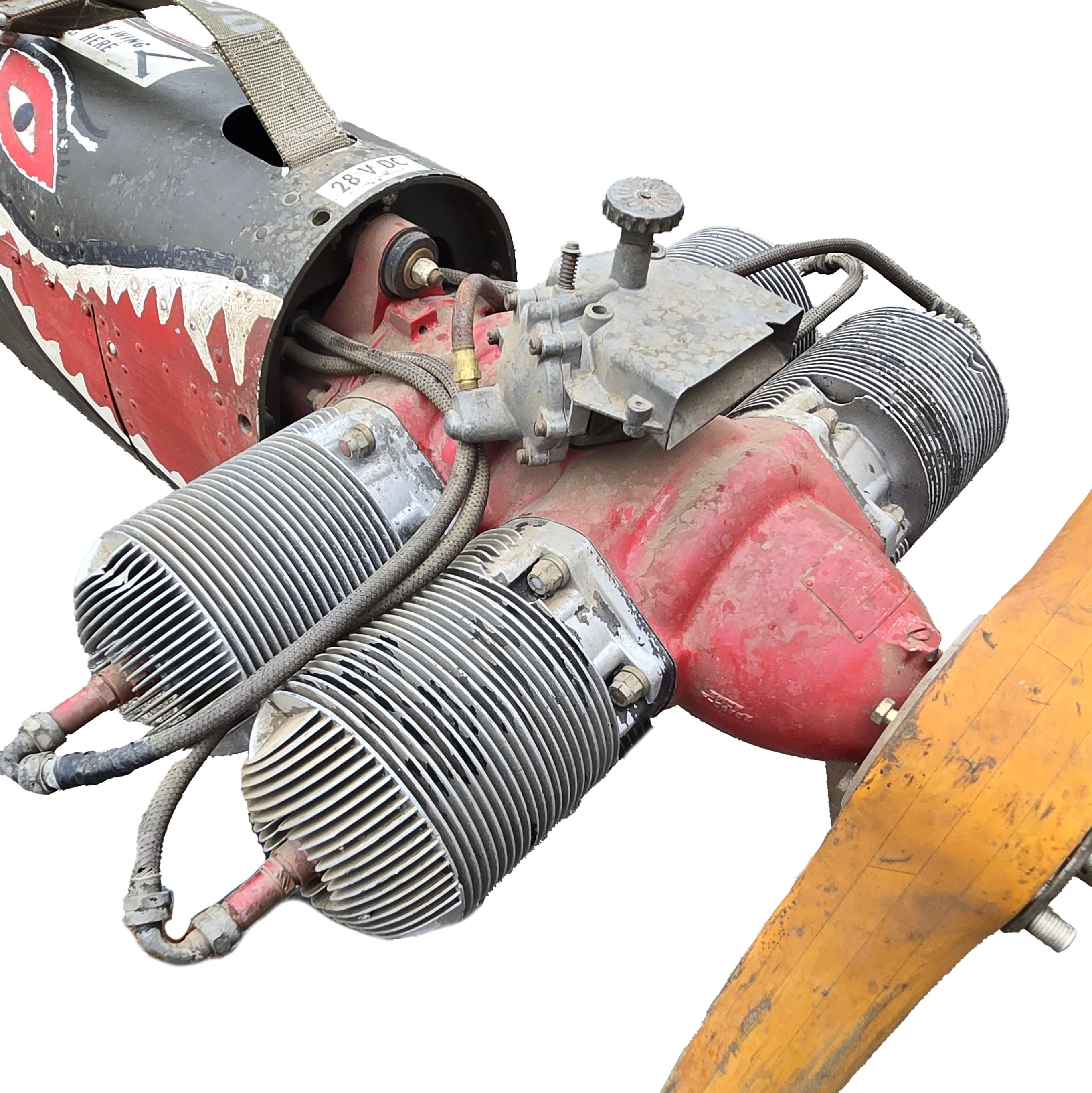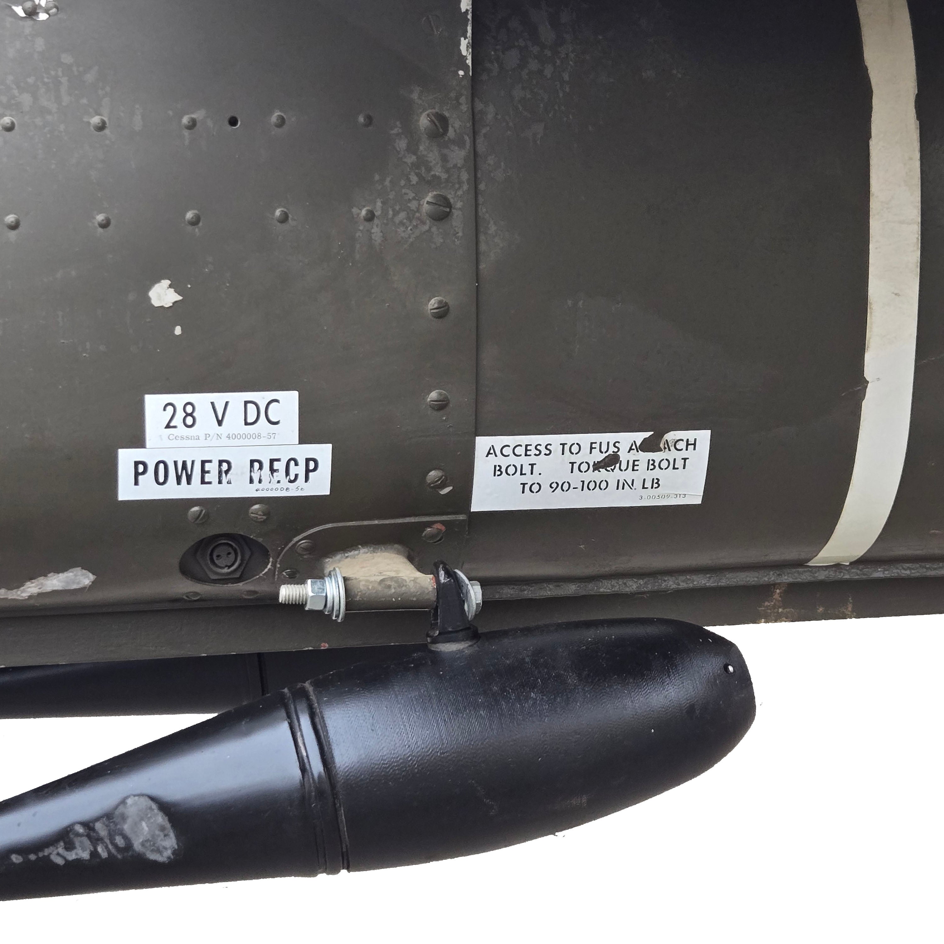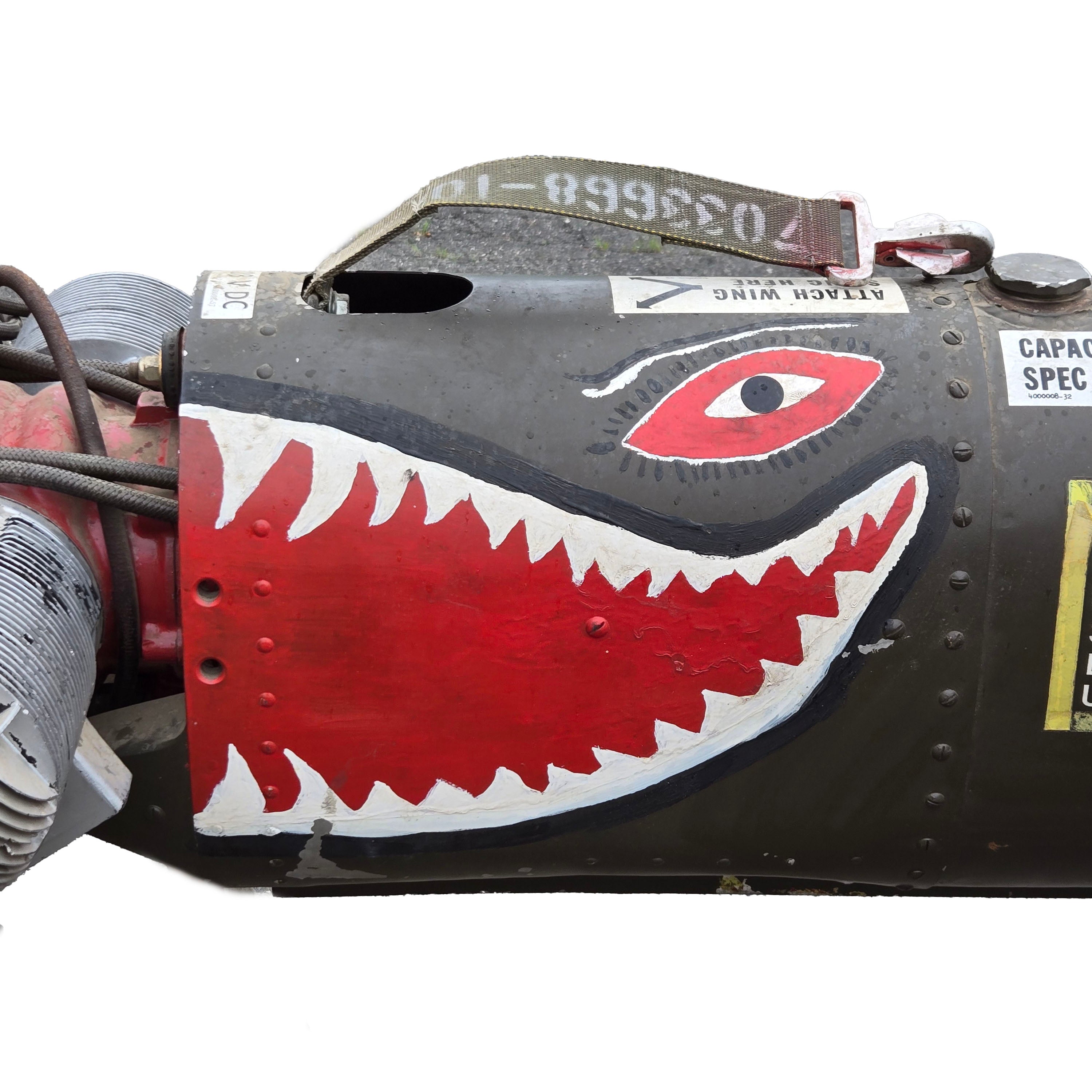 The drone measures 144” long, with the tail section measuring 50 x 13 x 18”. The front propeller has a span of 44”, and the wingspan is roughly 161”. The propeller is in rough shape with heaving cracking at both ends. It is ink-stamped SENSENICH CORP. The original McCulloch O-100-1 Engine retains its data tag, but it has been painted over. We could make out the Model, O-100-1, and the Model Spec, 4318, but not much else. The side of the drone retains decal information: