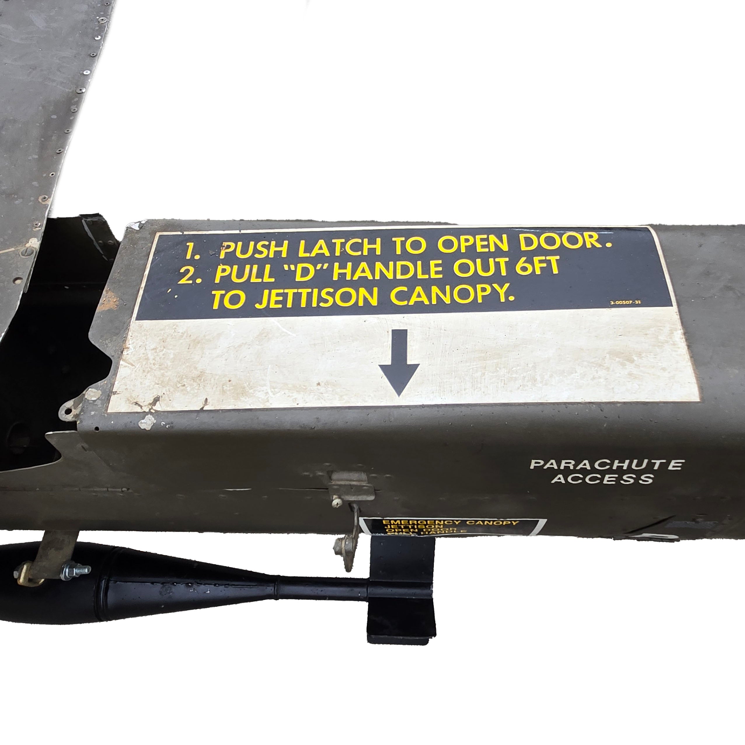 The top of the drone retains the wing sling, which is stamped 703668-10. There are several stickers reading 28 V DC, denoting the electrical information next to plugs and outlets. There is also an area marked PARACHUTE ACCESS. At the end of a mission, the drone floated to the ground underneath a parachute deployed from the top of the fuselage.