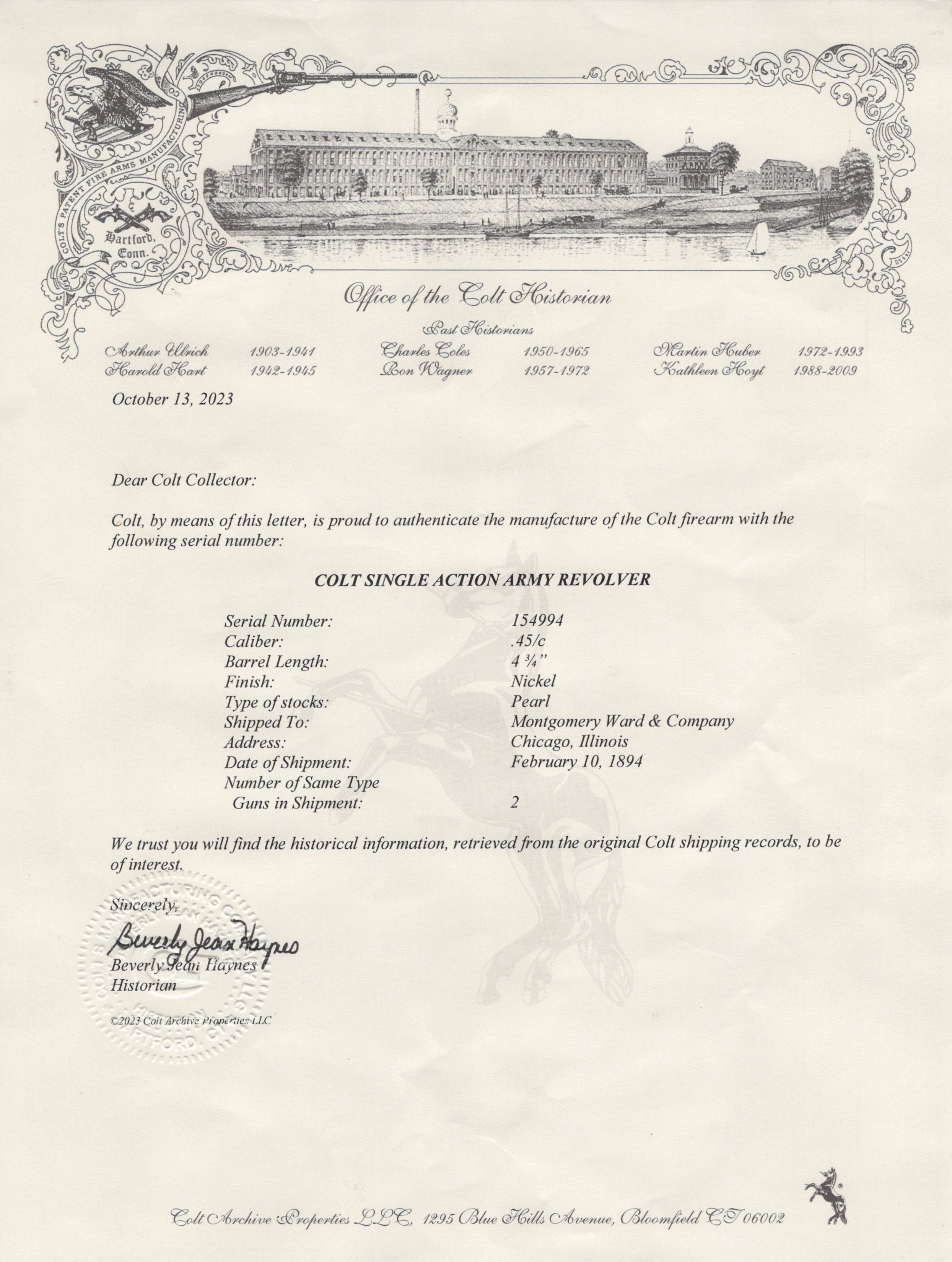 The revolver came to us with an original Colt Factory letter from the office of the Colt Historian Beverly Jean Haynes, which has her signature and correct raised seal applied in the lower left corner. The paper used is the correct Colt Letterhead and is dated October 13, 2023, indicating it is a COLT SINGLE ACTION ARMY REVOLVER, with the caliber listed as .45/c and finish listed as Nickel. The barrel is listed as 4 ¾", while the stocks are Pearl, so this revolver is still completely in the original configuration as shipped from Colt. The gun was shipped on February 10, 1894 as part of a shipment of 2 similar guns to Montgomery Ward & Company in Chicago Illinois, the world famous and pioneering catalog ordering company. In the early days there was not much that you could not order by mail.