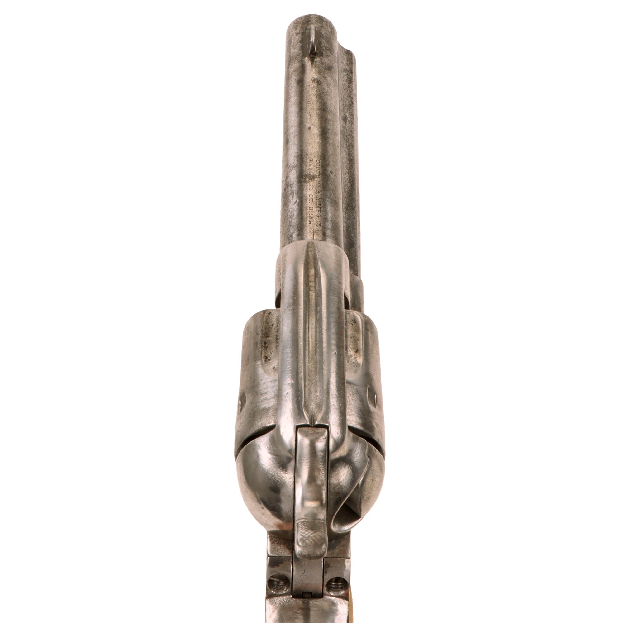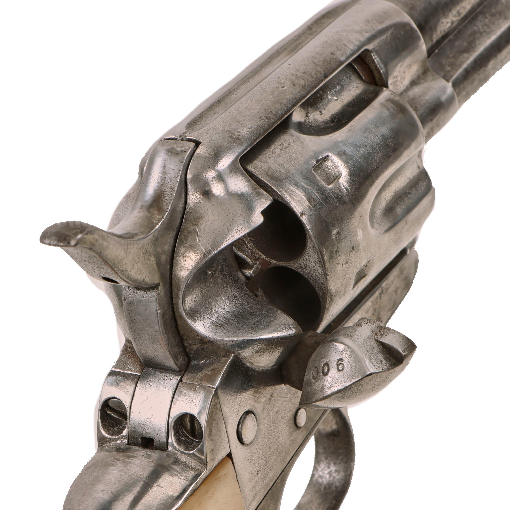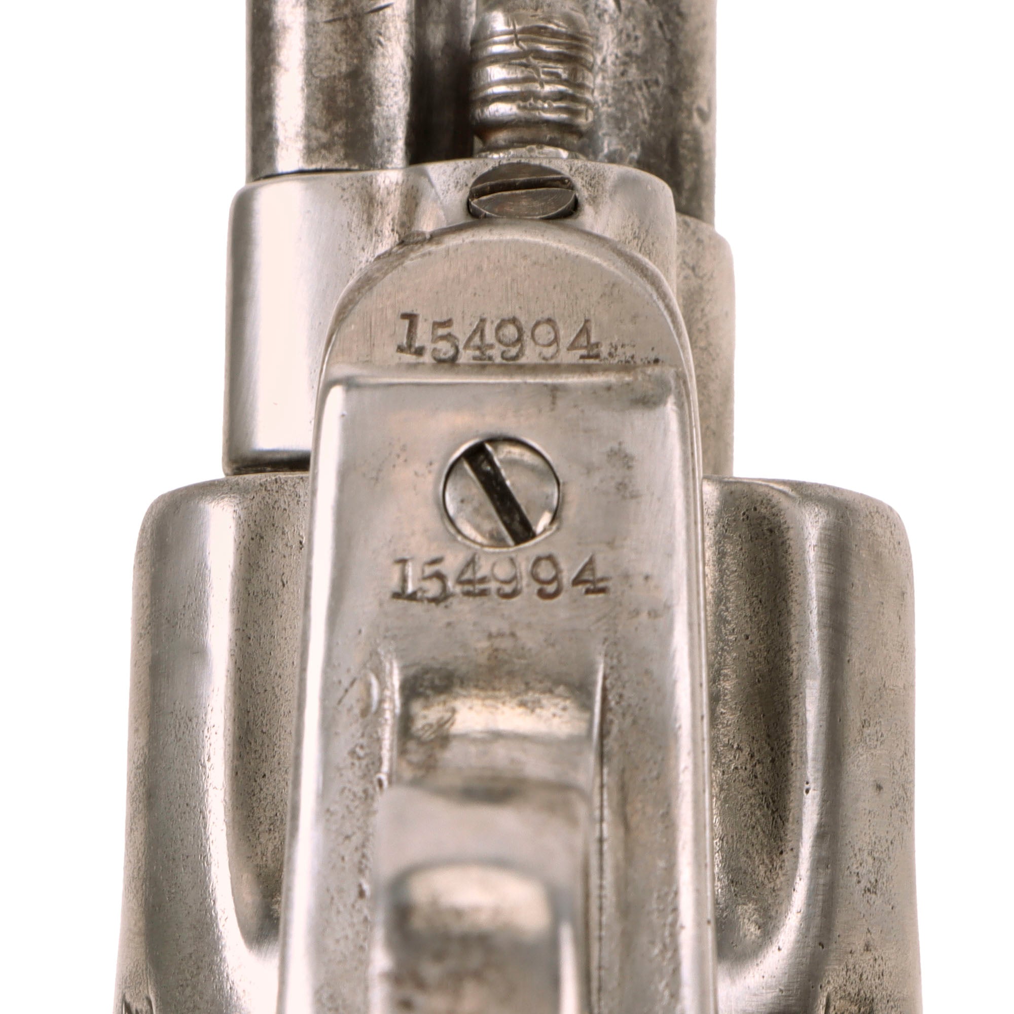 This great frontier used Colt SAA (Single Action Army) Revolver has an original "gunfighter friendly" 4 3/4" barrel and and lovely Factory installed mother of pearl grips which is clearly remarked on the Colt archive letter as "Type of stocks: Pearl". Originally nickel-plated, it has now lost all of that finish from use and cleaning. It now displays a very nice polished patina from decades of oxidation and subsequent cleaning. The markings are still mostly visible, and we do not see any evidence of restoration. The revolver's serial number is 154994, which dates production to 1894. It has the serial number on the frame, trigger guard, and grip frame, making this an "ALL MATCHING" example. 1883 was the last year that serial numbers would be stamped on the cylinder until 1912, so the lack of the serial number there is correct. There is also assembly number 900 marked on the loading gate. It is in full working order and condition, with a great patinated look, sure to delight any "Old West" Americana collector.