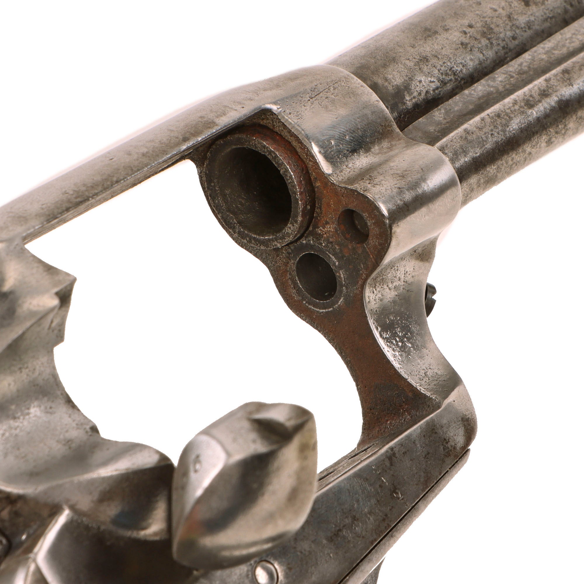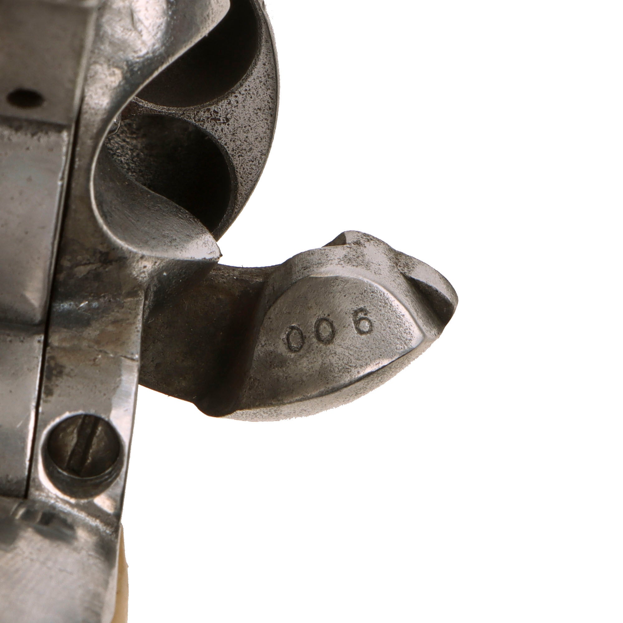 Mechanically, this revolver really is "tight as a drum"! The action is smooth, with a solid cylinder lock up, crisp dry fire, and just a bit of slop in the mechanics. The action has all four clicks with a functional loading position, and cycles correctly, without any of the finicky behavior we often see on revolvers of this age. As with all revolvers of this age we recommend being relatively gentle with cycling it, so we do not recommend "fanning" or "fan firing". The bore is in good condition, showing signs of heavy use while in service. There is still rifling visible, but the finish is relatively dark, and we can see past light pitting over much of the surface. The ejector door swings open easily, and the ejector itself works great, with no sticking or other issues.