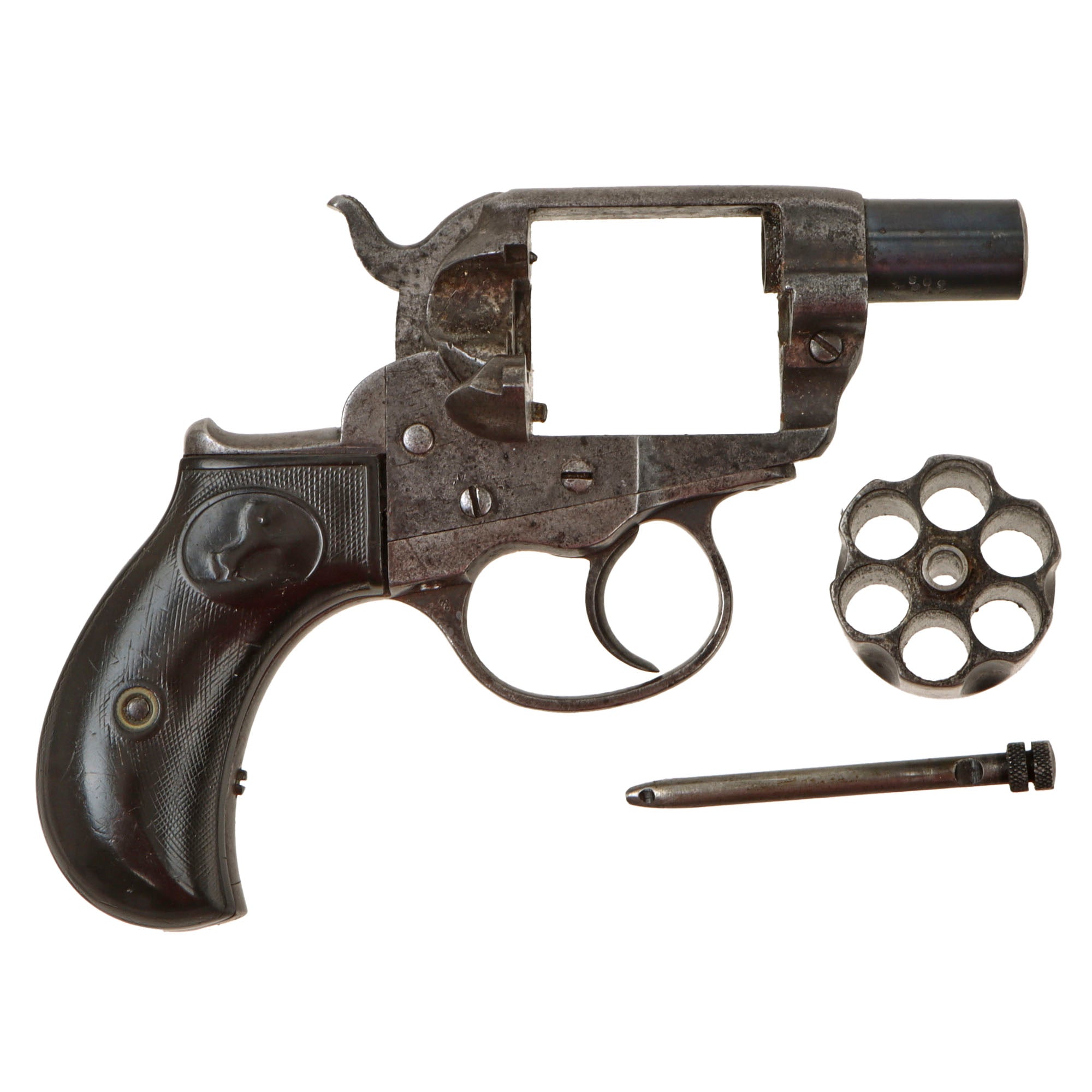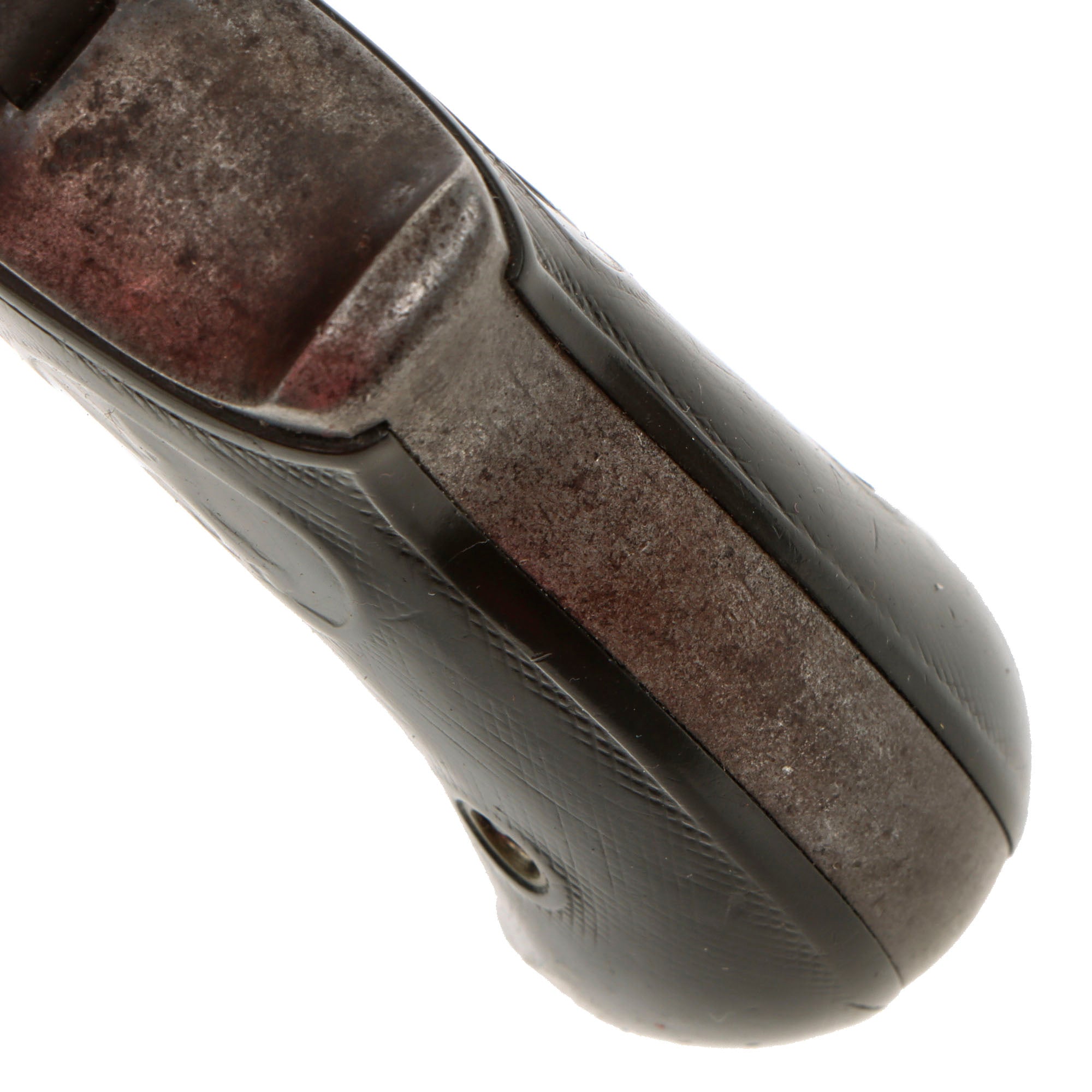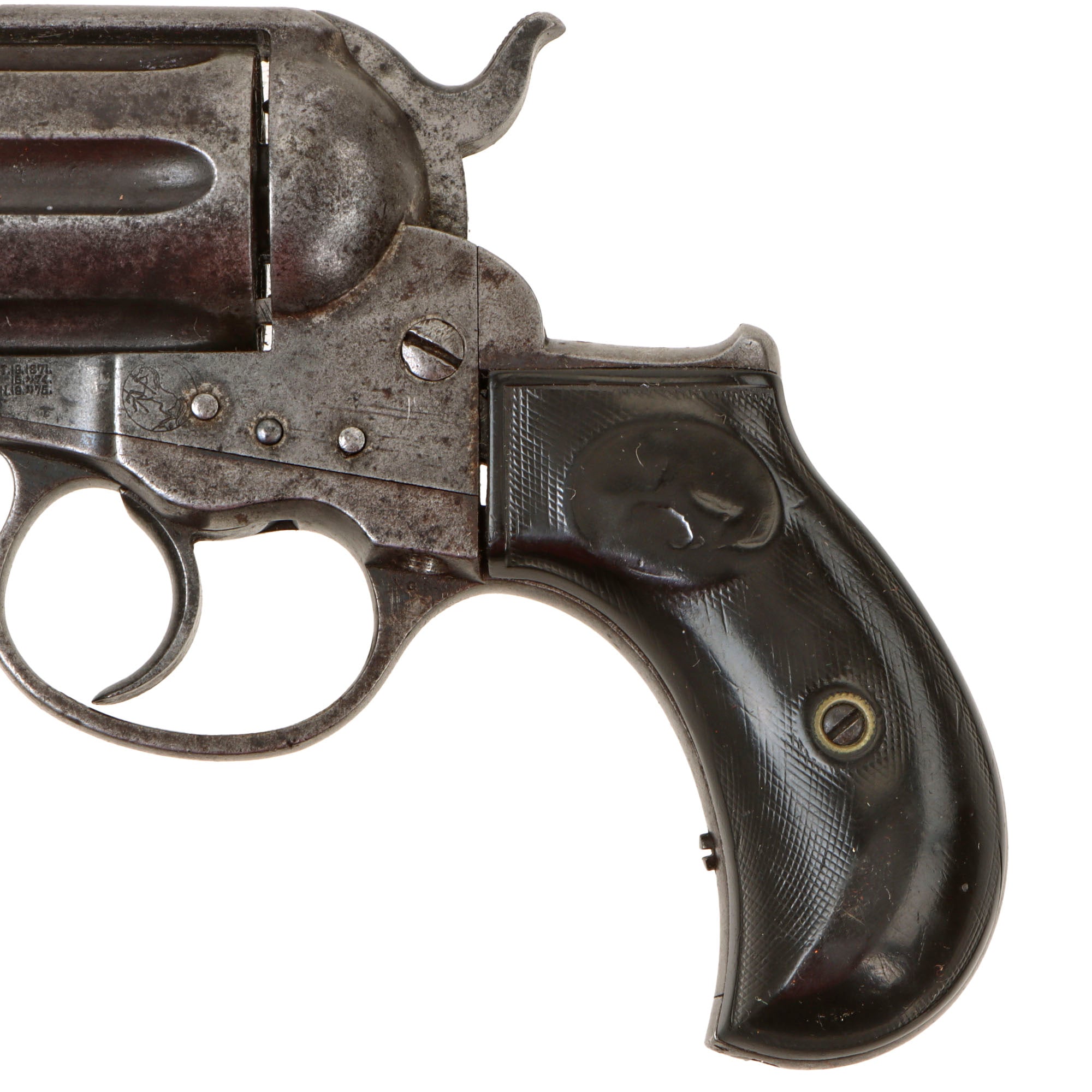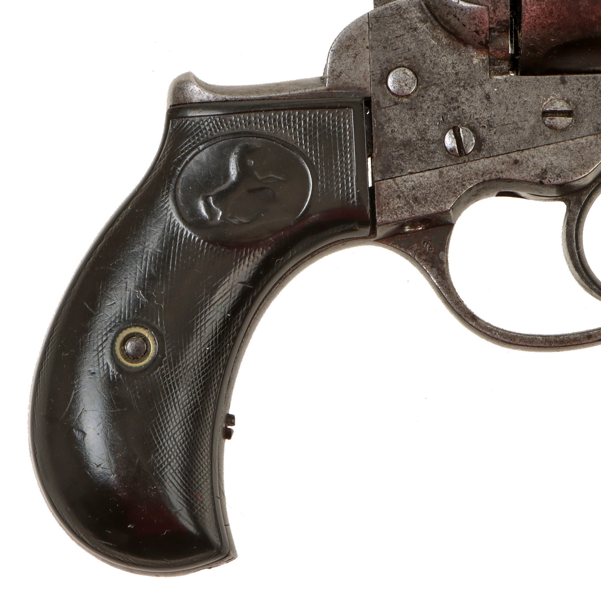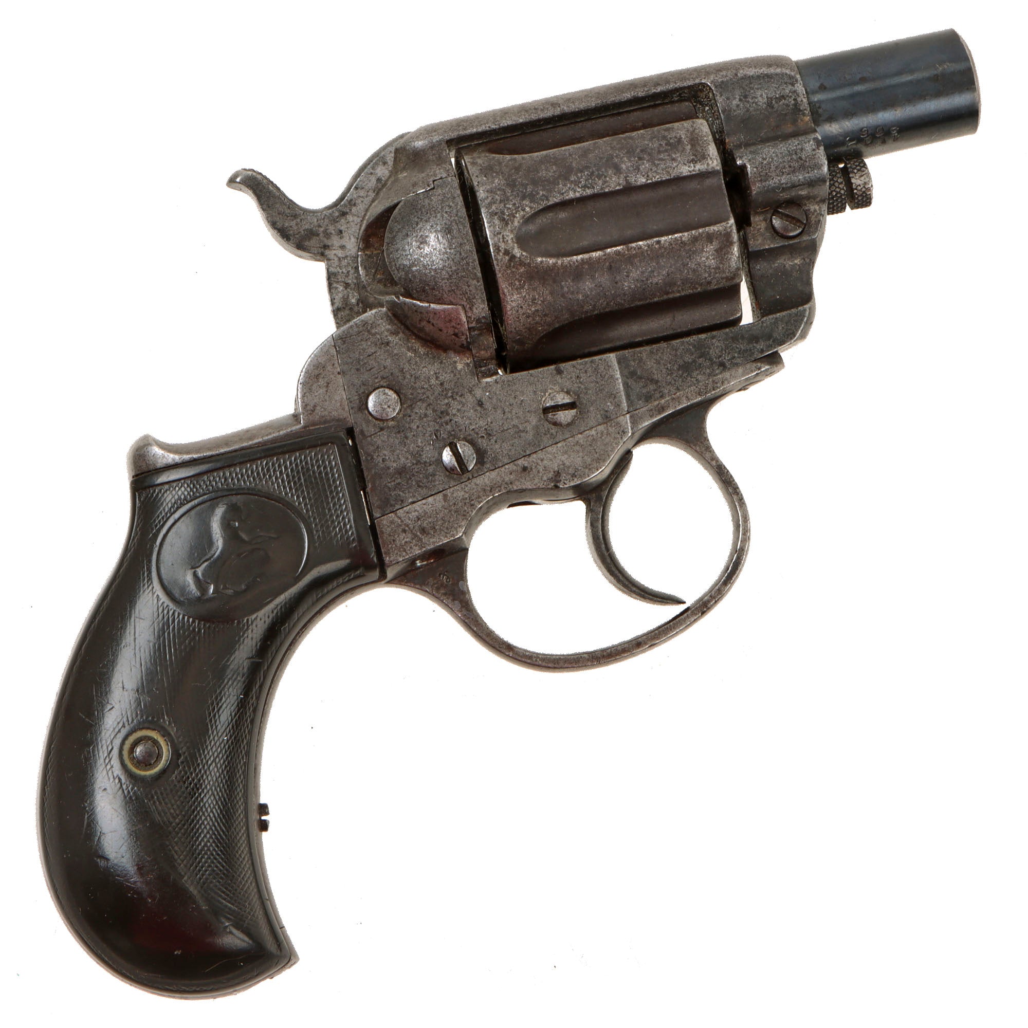We purchased this revolver as a "THUNDERER" and it is in very good working order and condition, showing a lovely patina overall. The original finish has been replaced by a gray worn patina, with some peppering in areas, except on the barrel, which still retains the original bluing, which is more durable than the case coloring. Its bird's head hard rubber grips bear the Colt prancing horse logo on each side, though it is faded, and there is still a good amount of the original checkering, showing honest use and wear.