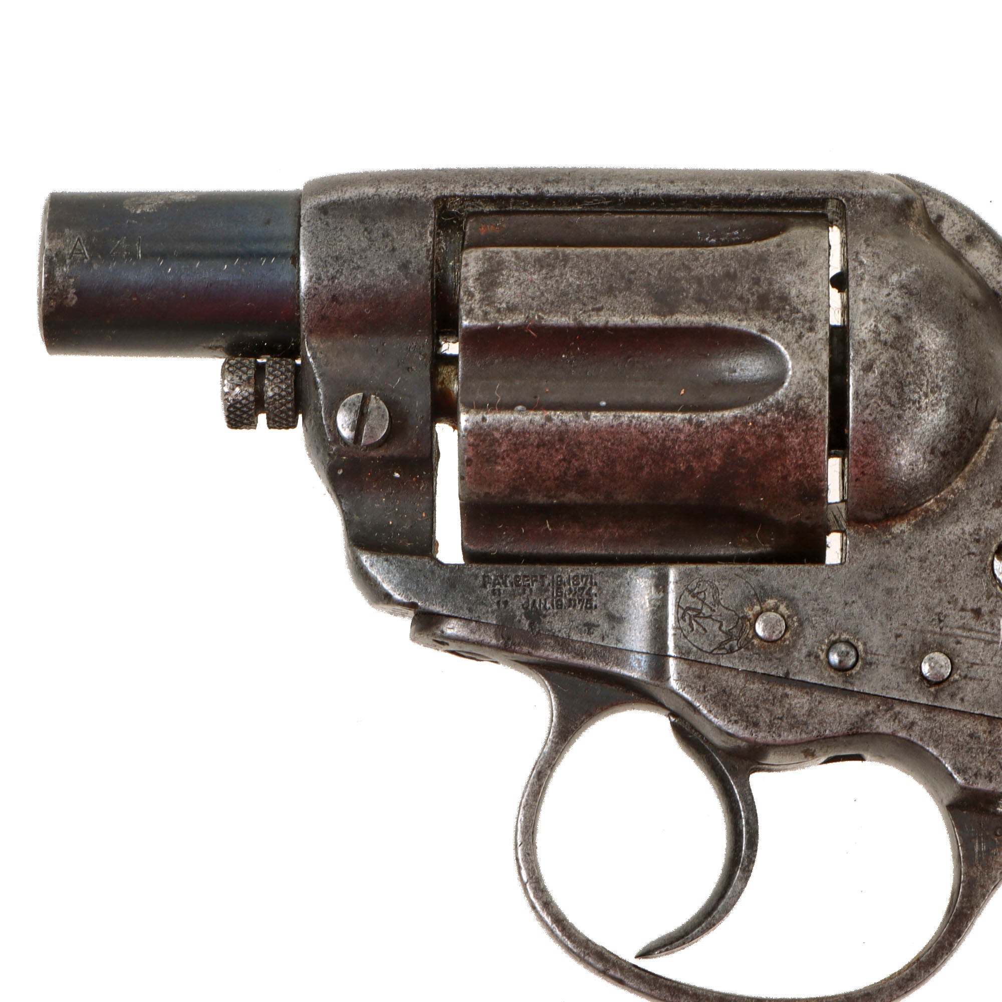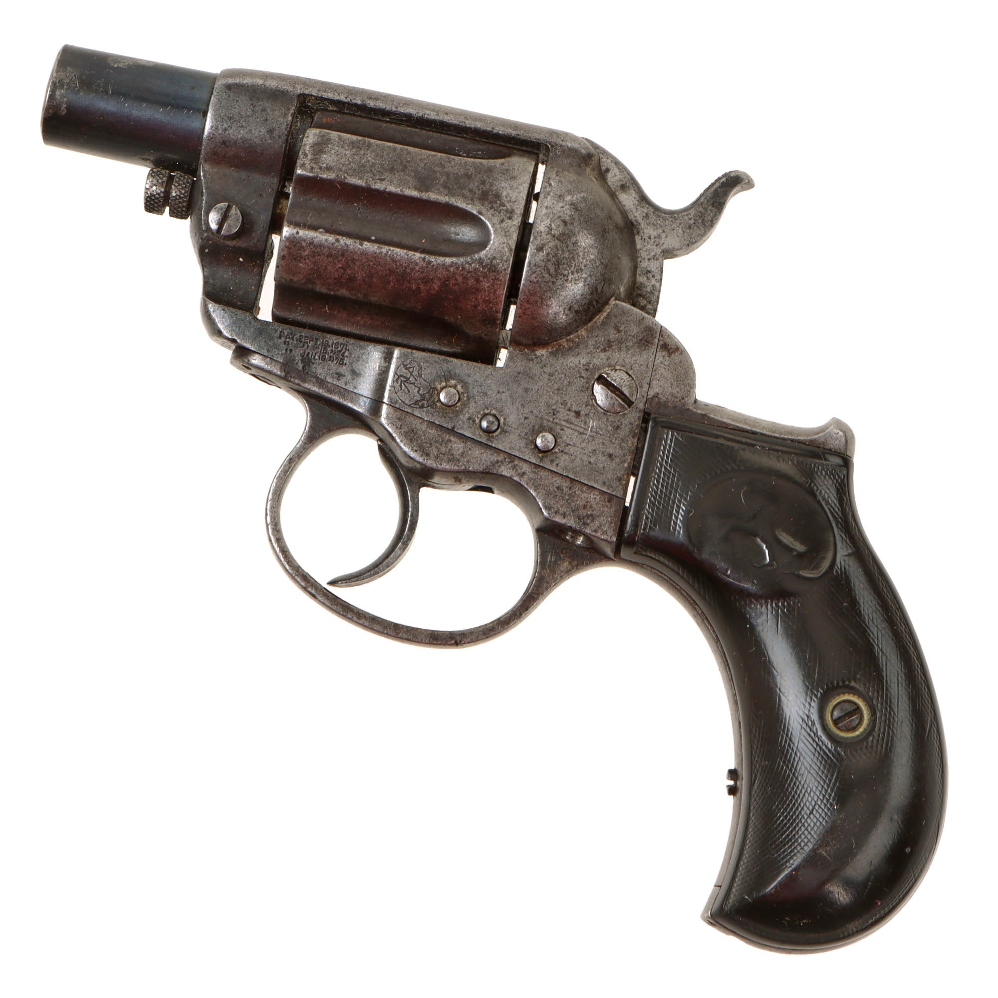 The M1877 revolvers were marketed under different names such as "LIGHTNING" to appeal to different groups of customers. Although all were of the same basic design, they were also referred to as "THUNDERERS", "RAINMAKERS", and SHERIFF'S MODELS" as well, depending on the caliber and configuration. None of these names were Colt designations, nor used by the factory in any reference materials of the time. All of these terms were coined by Benjamin Kittredge, one of Colt's major distributors. Kittredge was responsible for the terms "Peacemaker" for the Single Action Army, "Omnipotent" for the Colt M1878 double-action (often known as the "Frontier" model), and nicknames for the various chamberings of the New Line models. This example is roll stamped partial [COLT. D.] A. 41 on the left side of the barrel with a 41 stamped on the bottom, so it is definitely a "Thunderer." There are some other numbers stamped, but they look to have been added post manufacture.