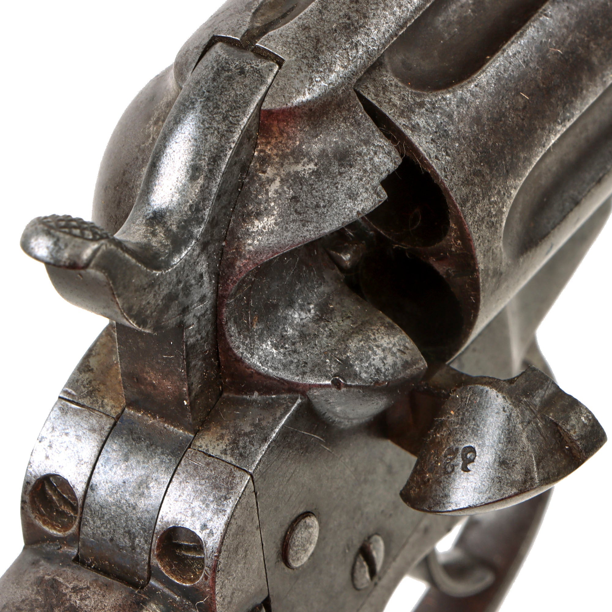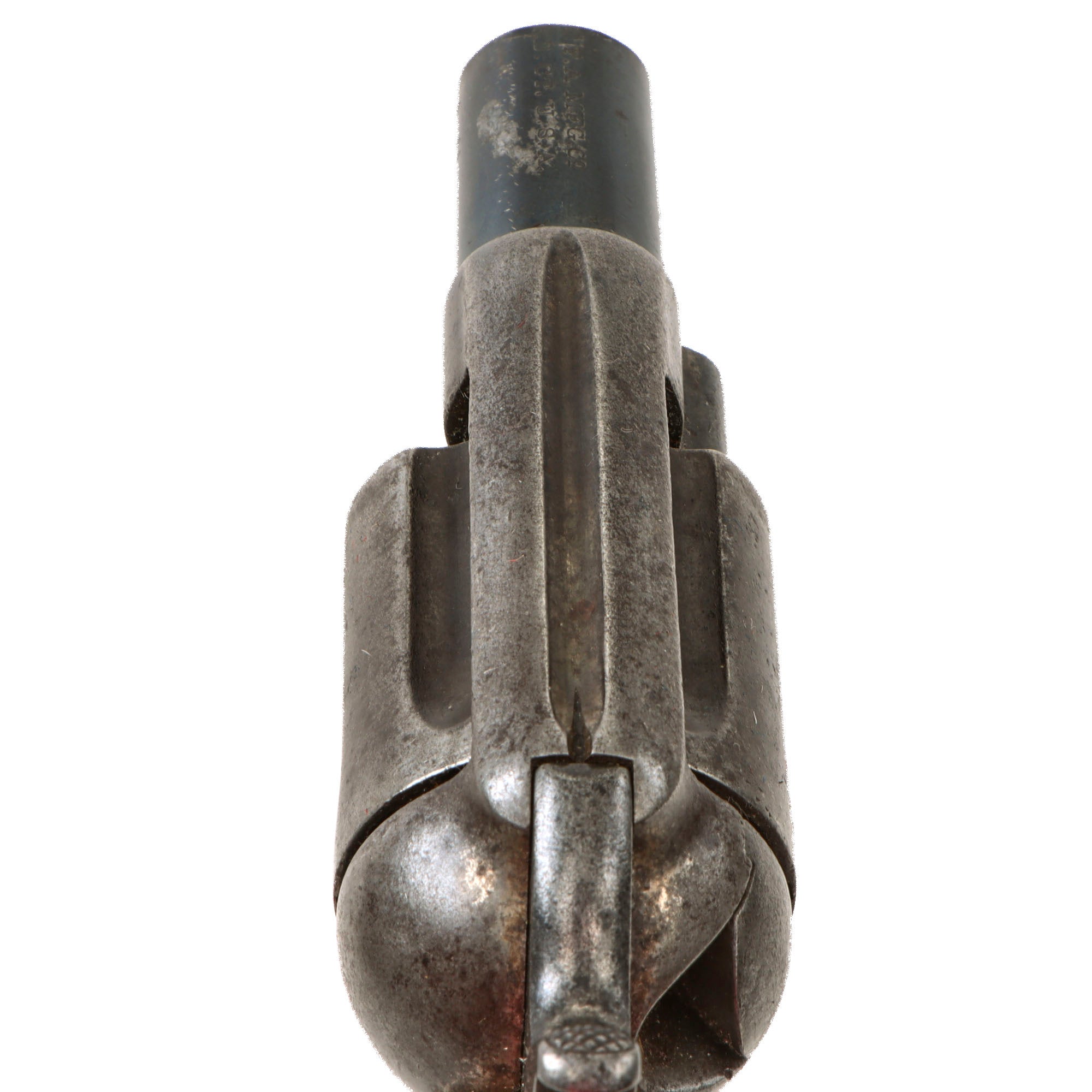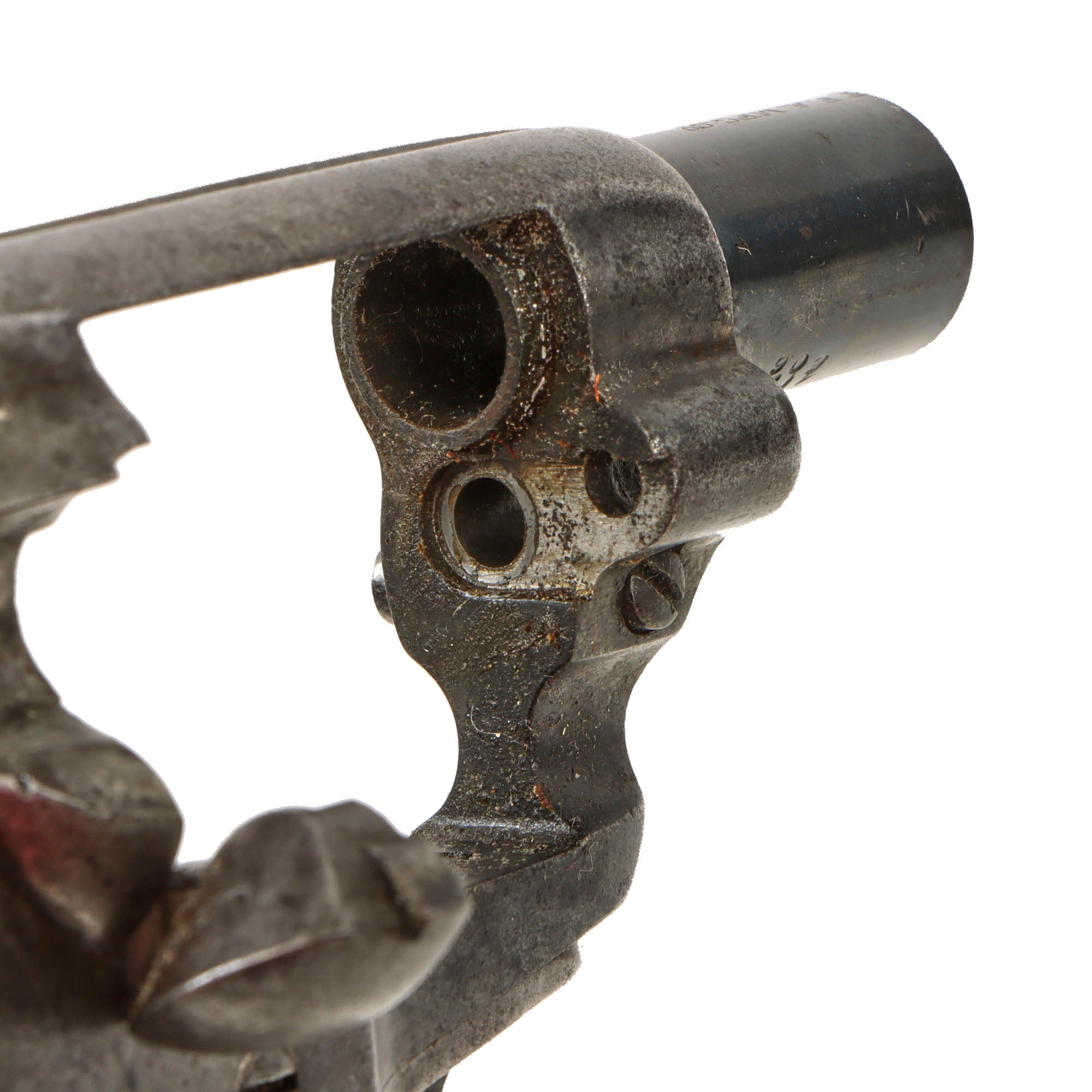 The revolver functions well in both single and double action, with just a bit of slop in the mechanics. It can over-rotate a bit in some positions when in double action, which we did not notice in single action. The cylinder arbor pin pulled out correctly, allowing the cylinder to be removed, though for some reason the end of it being shaped into a point for some reason. We checked the bore, and it is in very good condition, showing clear lands and grooves with a partly bright finish. There are some areas of past oxidation and fouling, so this definitely looks to be a revolver saw a good amount of use.