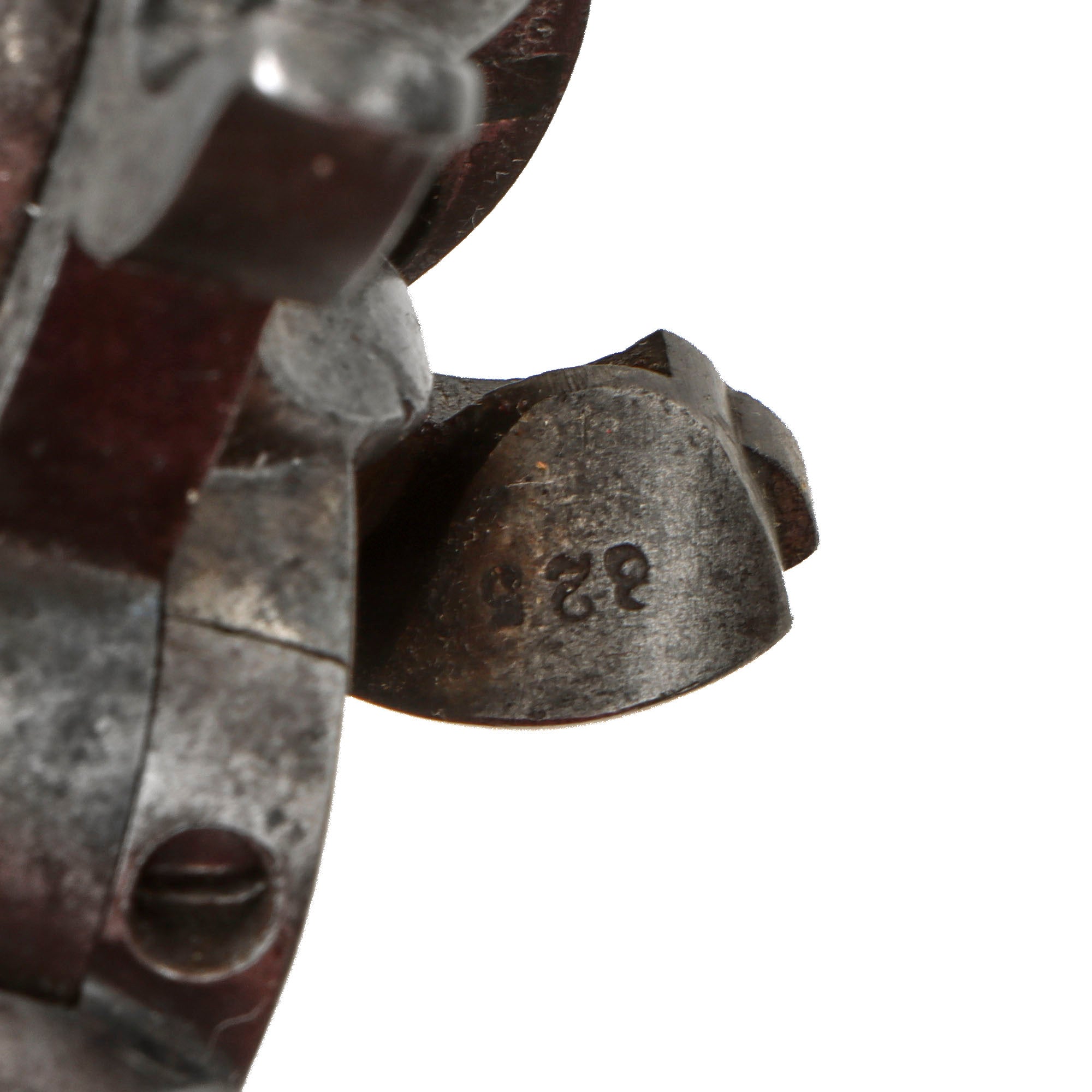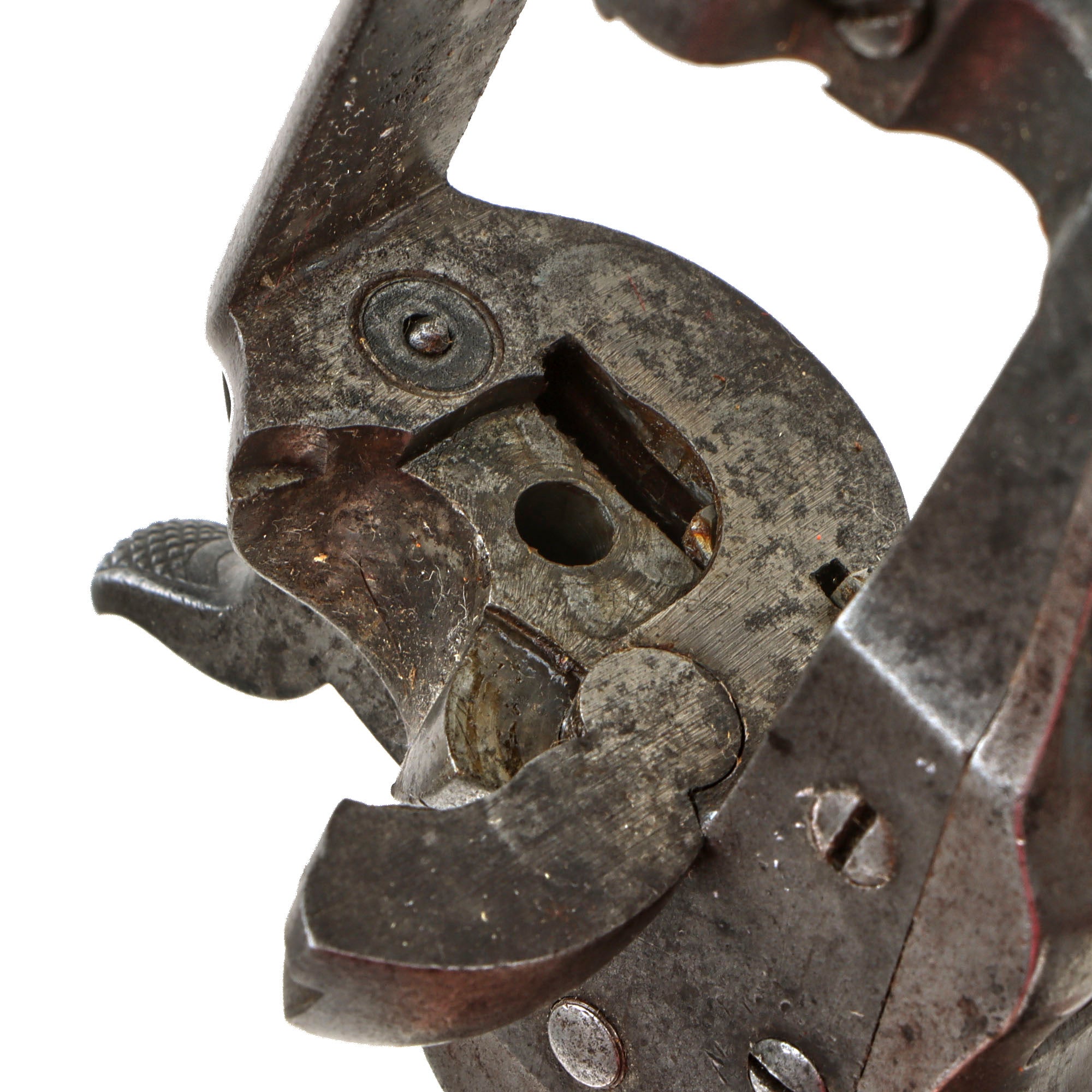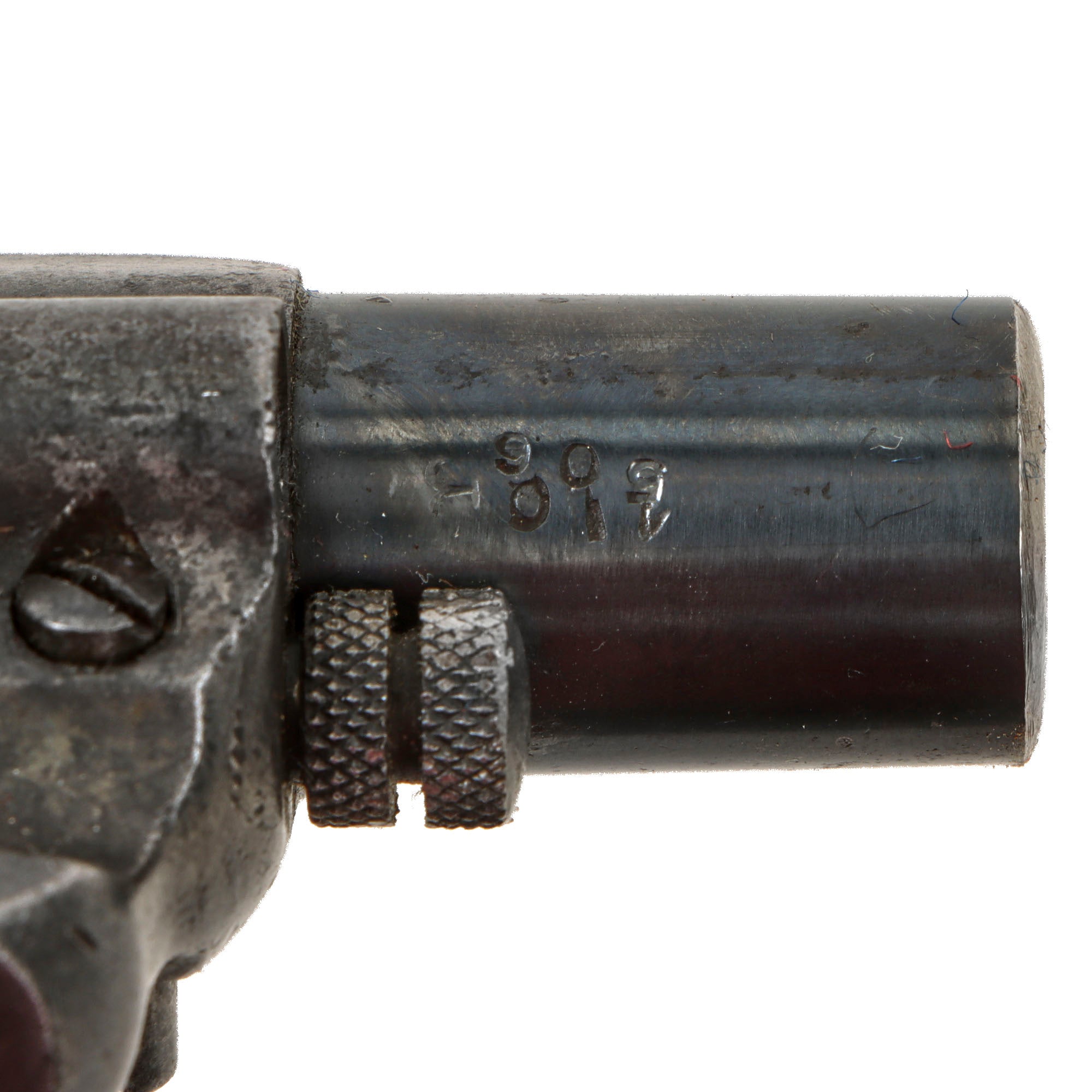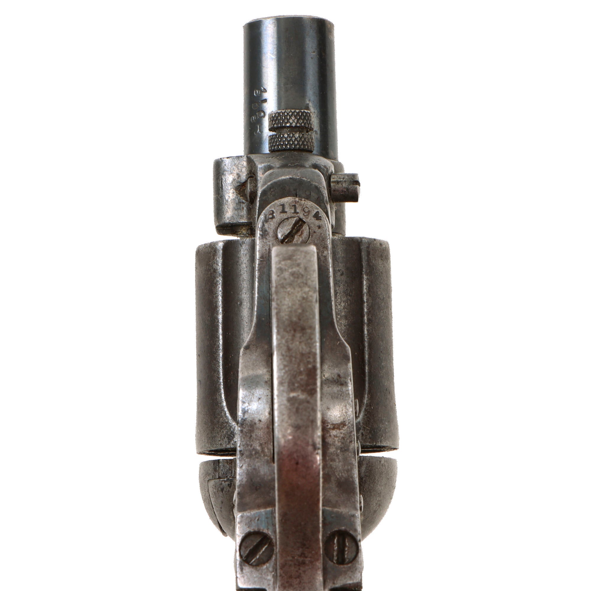The revolver functions well in both single and double action, with just a bit of slop in the mechanics. It can over-rotate a bit in some positions when in double action, which we did not notice in single action. The cylinder arbor pin pulled out correctly, allowing the cylinder to be removed, though for some reason the end of it being shaped into a point for some reason. We checked the bore, and it is in very good condition, showing clear lands and grooves with a partly bright finish. There are some areas of past oxidation and fouling, so this definitely looks to be a revolver saw a good amount of use.