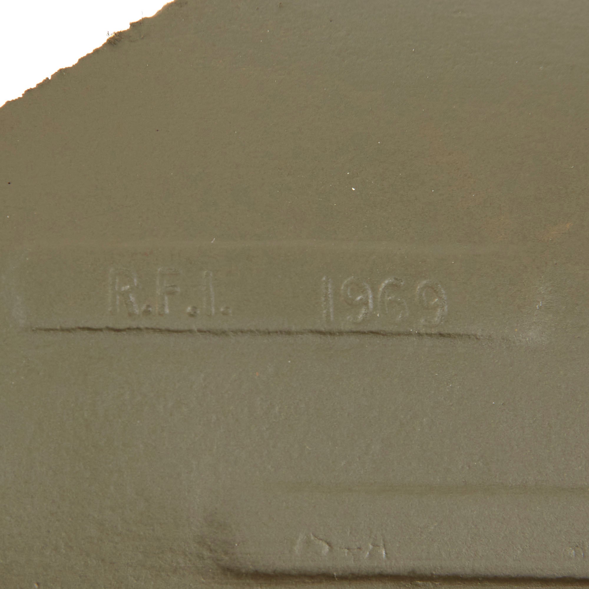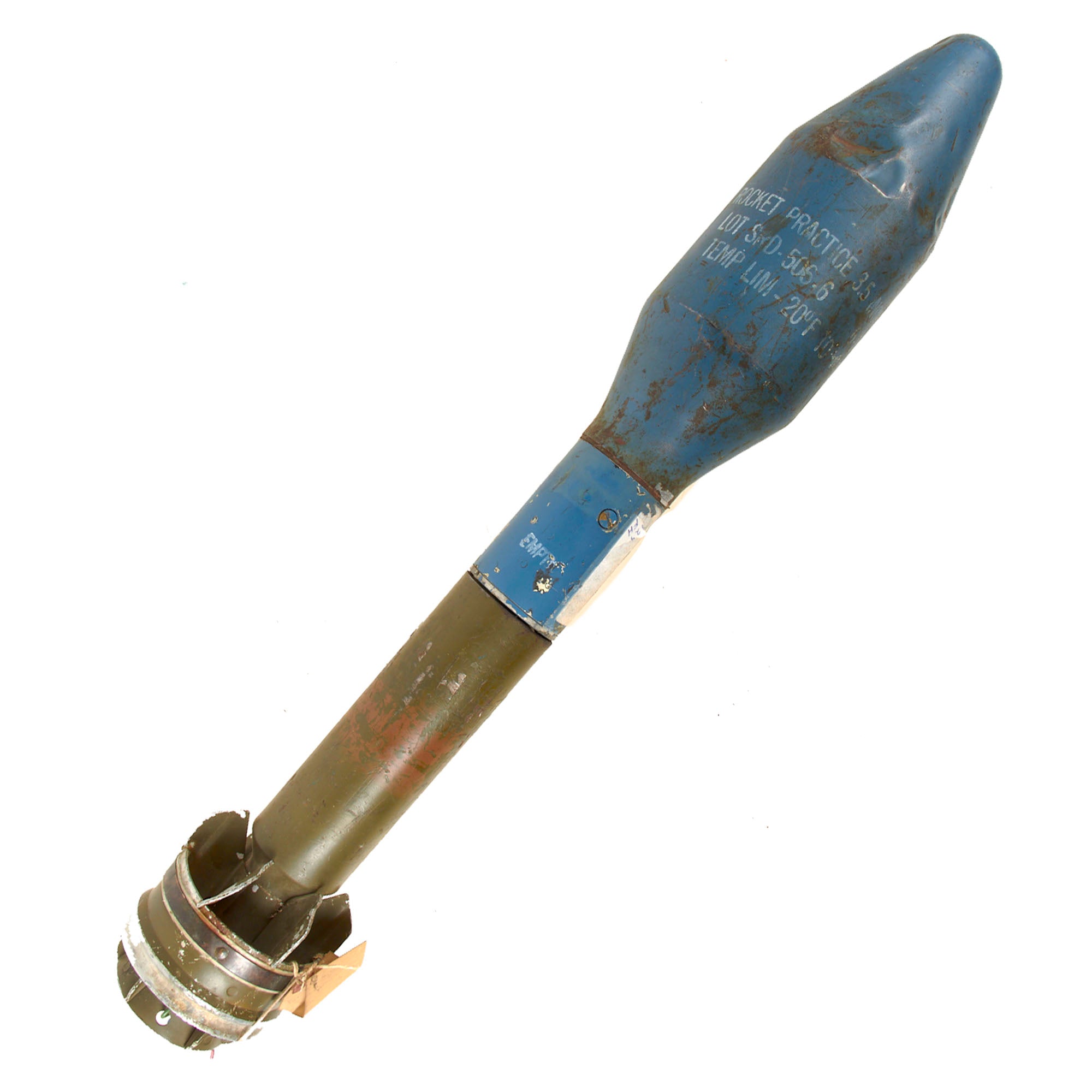 The included practice round is stamped with date 9 - 52 (September 1952) on the inert warhead and 3 - 53 (March 1953) on the fuze section of the inert round, which is still the original color and has not been repainted as so many are. There are stenciled markings on the side of the warhead with a 6-74 date for June 1974. It still has the original safety, though it is missing the cover.