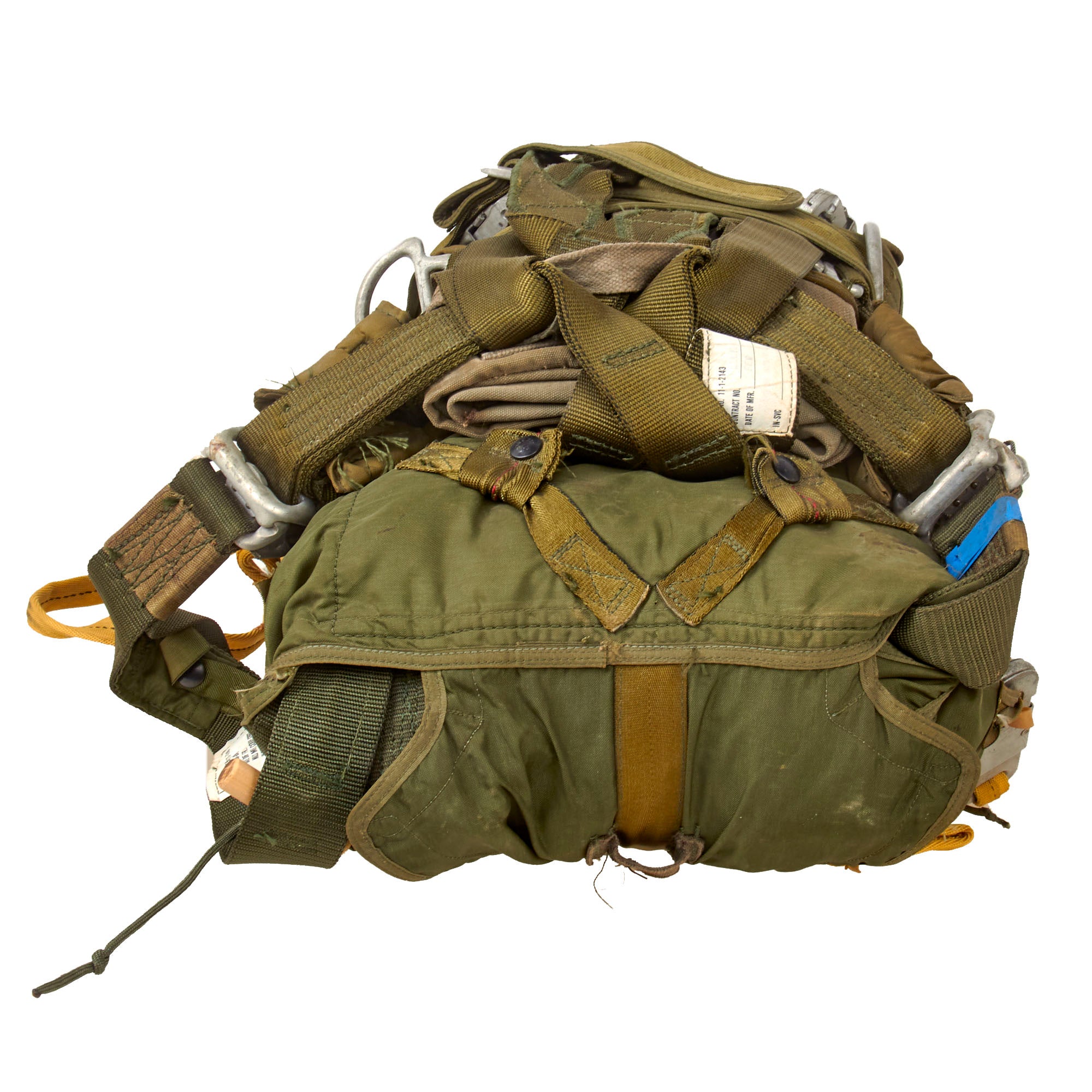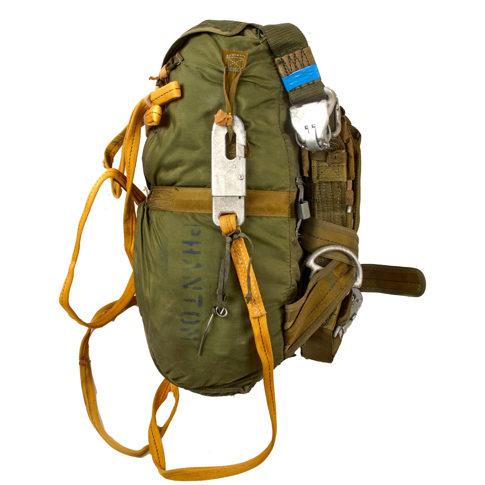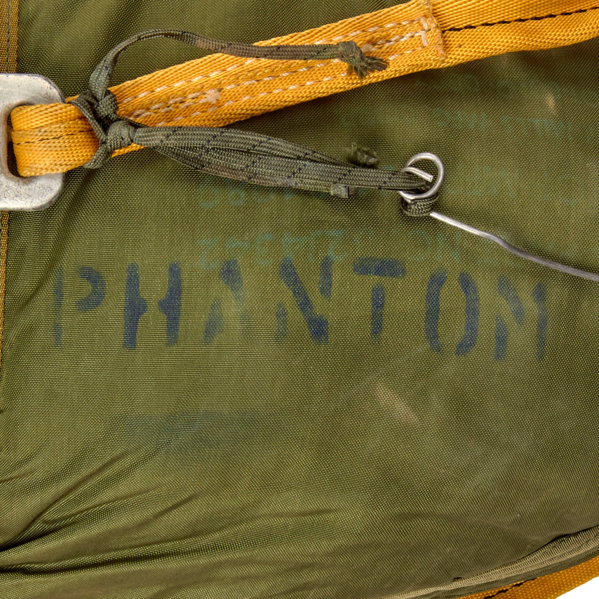 This is a heavily worn SET-10 parachute set complete with its original harness. There are a myriad of data tags and stamps across all parts, with various dates of manufacture including February 1986 on part of the harness strap, January 1991 on the parachute strap that connects to the harness, July 1985 on the yellow straps, and January 1989 on the parachute pack itself, which is also stenciled PHANTOM. So this set was probably put together in the early-to-mid 1990s.