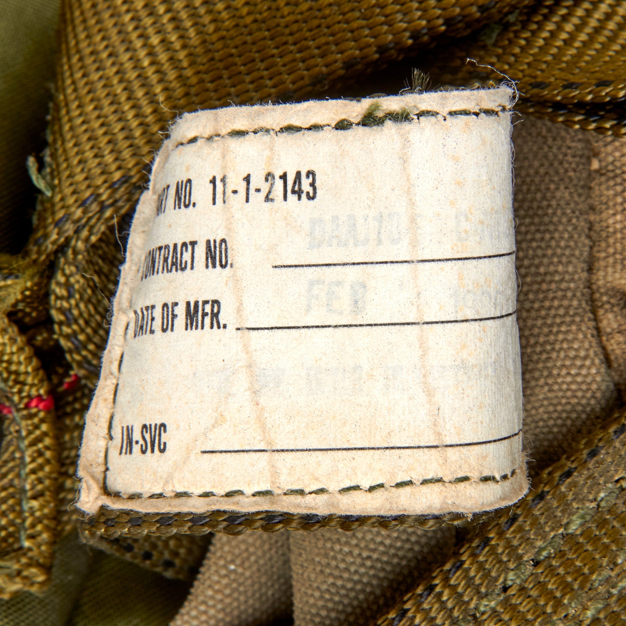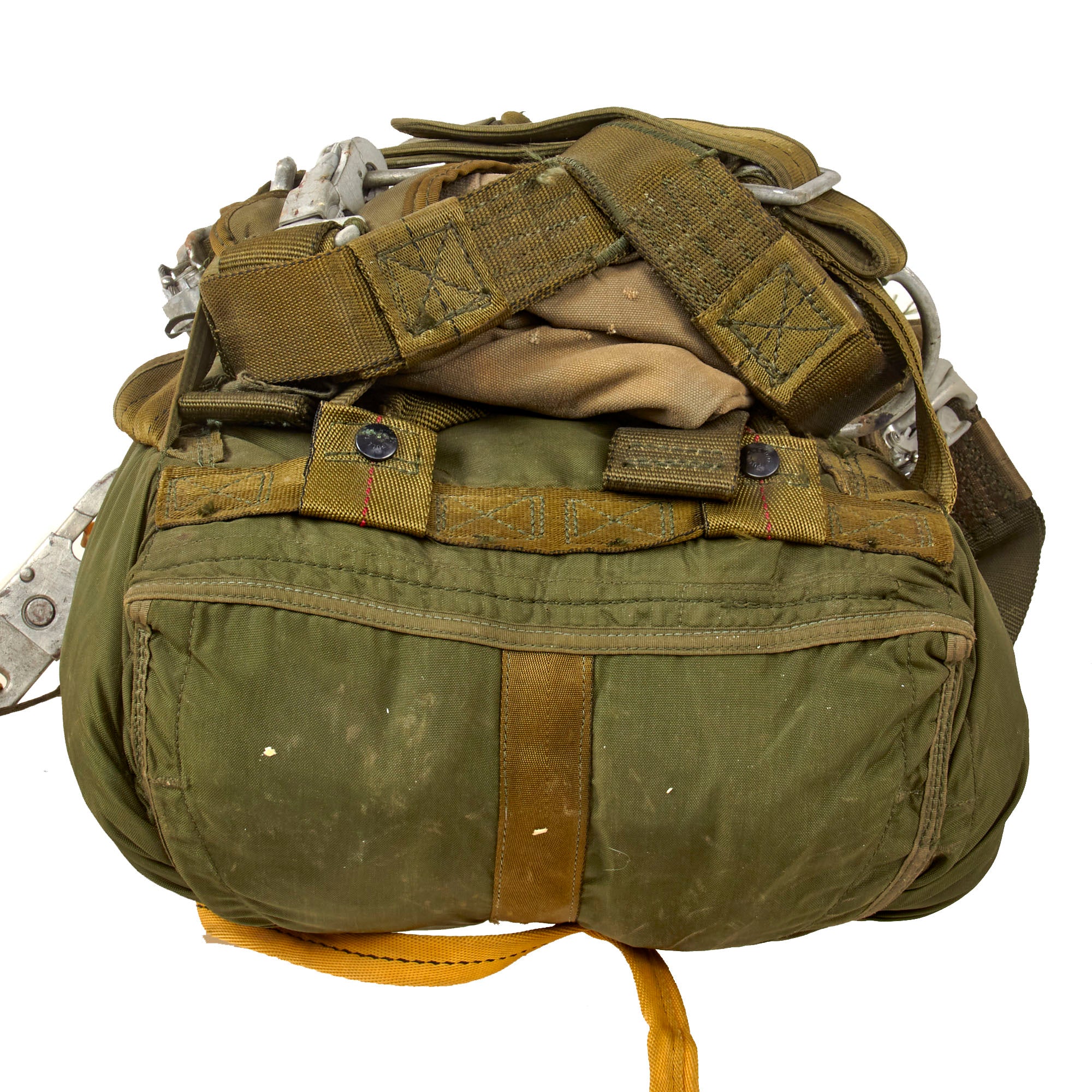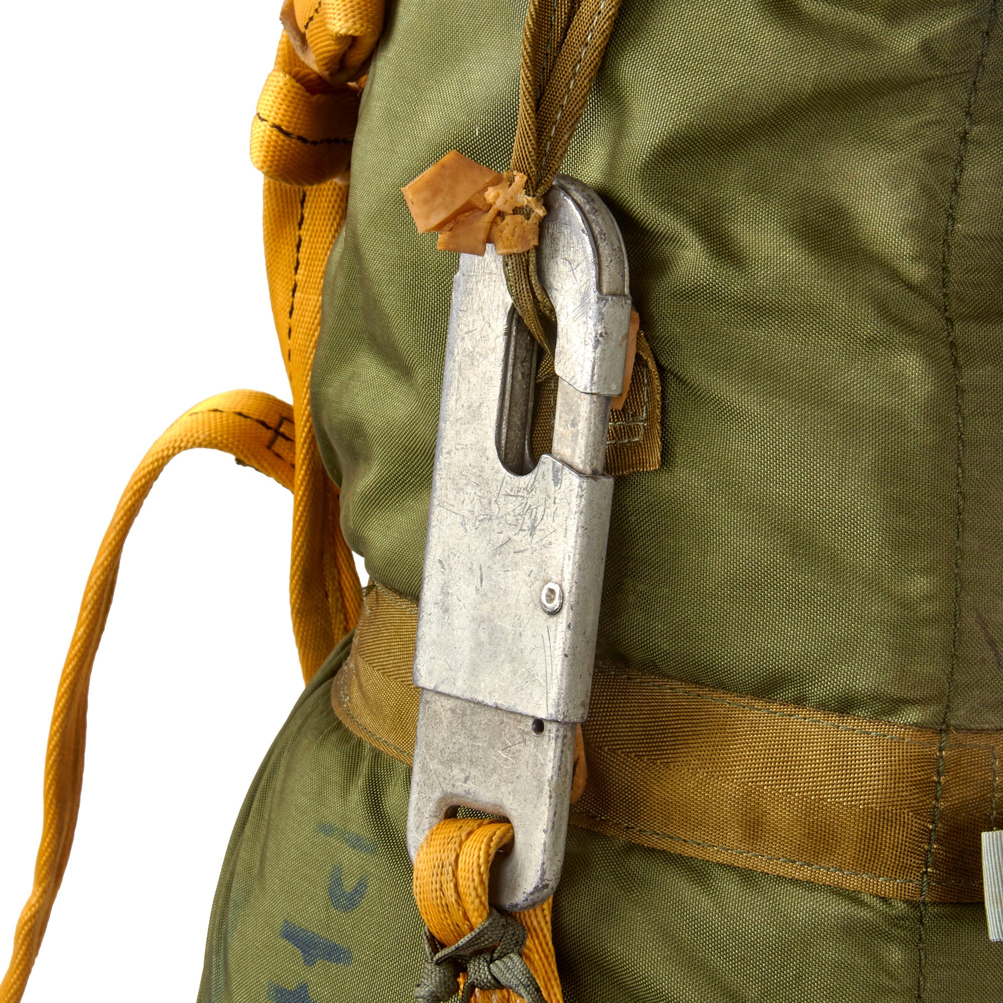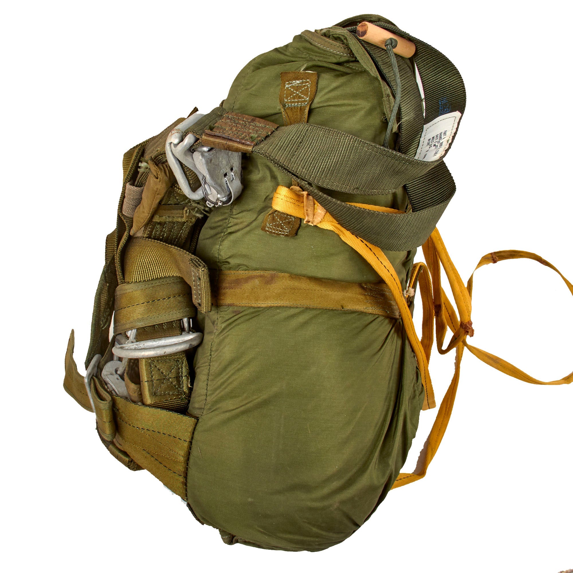 This is a heavily worn SET-10 parachute set complete with its original harness. There are a myriad of data tags and stamps across all parts, with various dates of manufacture including February 1986 on part of the harness strap, January 1991 on the parachute strap that connects to the harness, July 1985 on the yellow straps, and January 1989 on the parachute pack itself, which is also stenciled PHANTOM. So this set was probably put together in the early-to-mid 1990s.