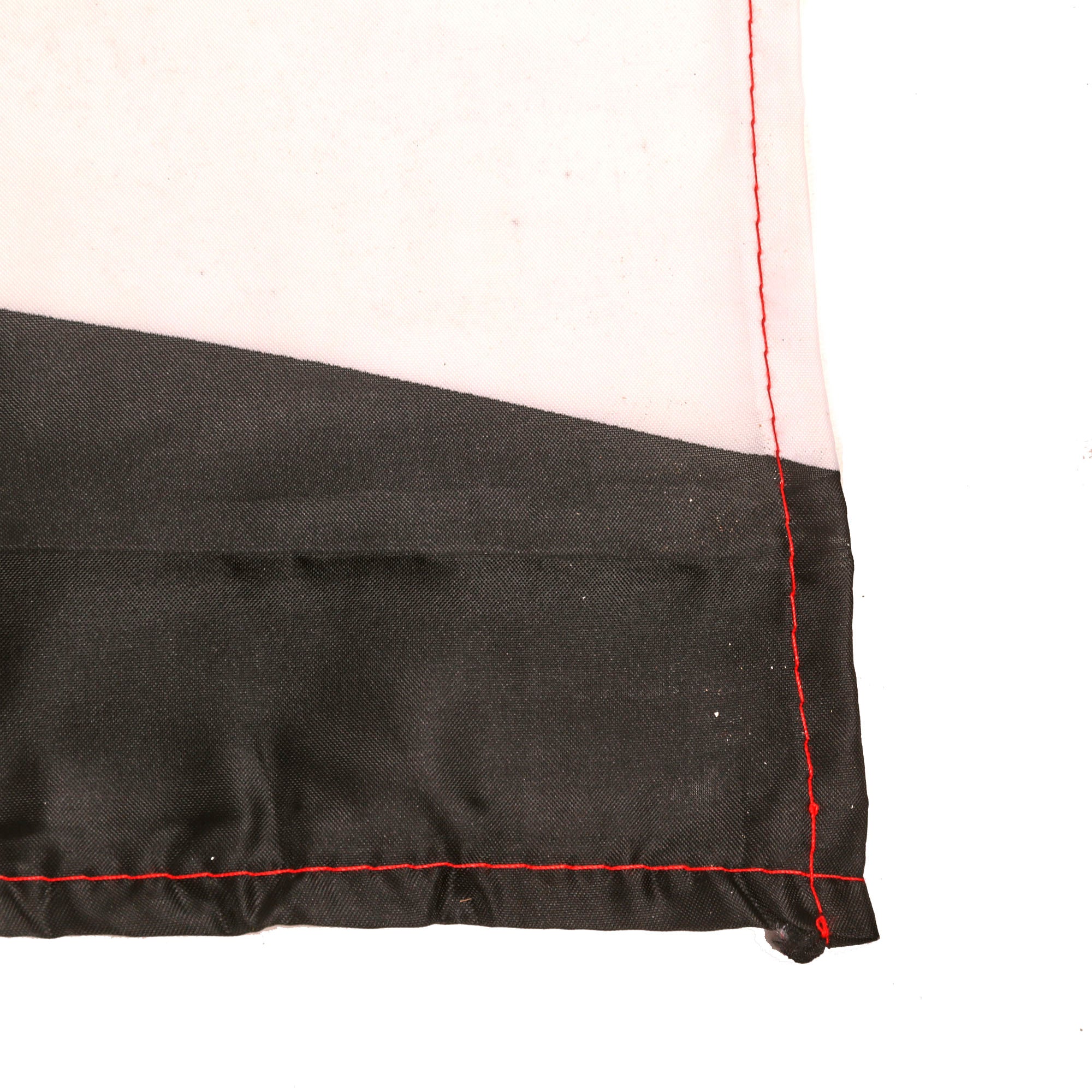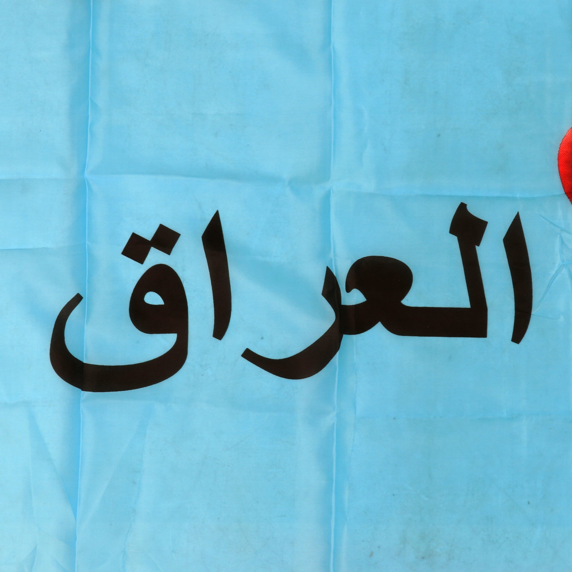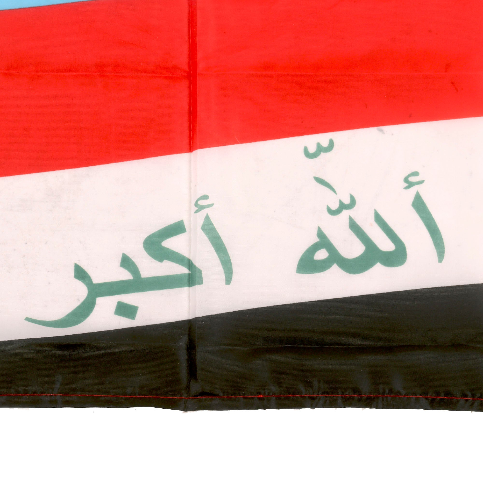 The flag measures 40 x 60” and is likely a soldier-bringback from the Iraq War. There are some markings on the header. The flag veers from the traditional colors of the Iraqi flag and adds a great deal of blue. We couldn’t find much reference on this flag, making for a great research project!