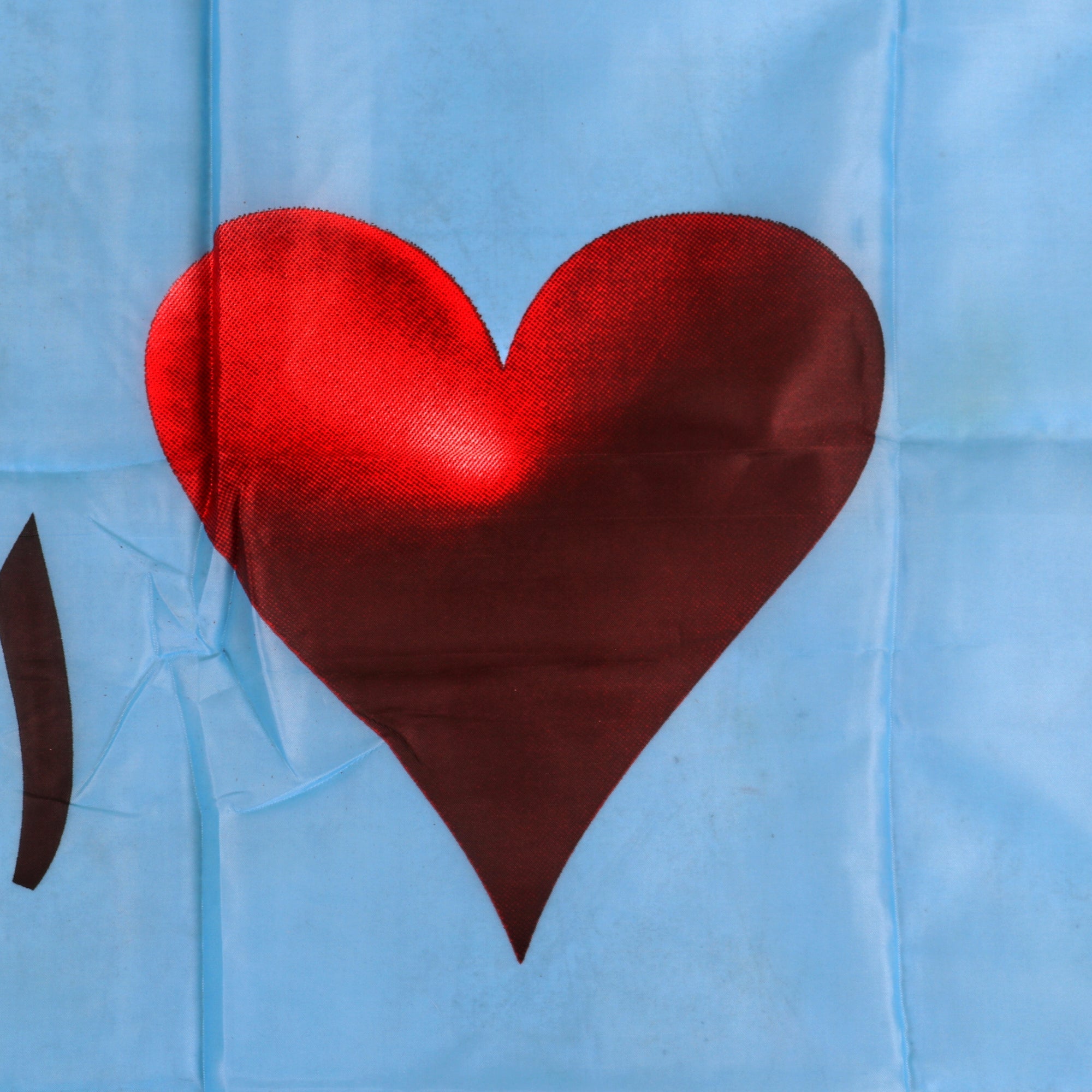 Original Item. Only One Available. This is a very interesting Iraqi propaganda flag, referred to as the “I Love Iraq” flag, with “God is Great” at the top and bottom, with a heart in the center to read “I Love Iraq.
